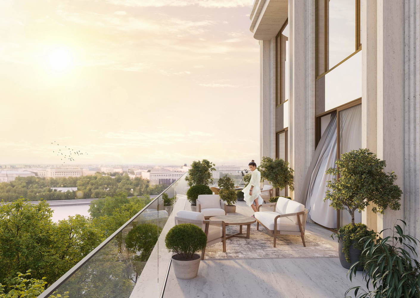 За окнами — Кремль, высотка на Котельнической, панорамы Замоскворечья и острова Балчуг, огни Садового кольца. Главная звезда проекта — клубный корпус № 1, приватный особняк с особым статусом.