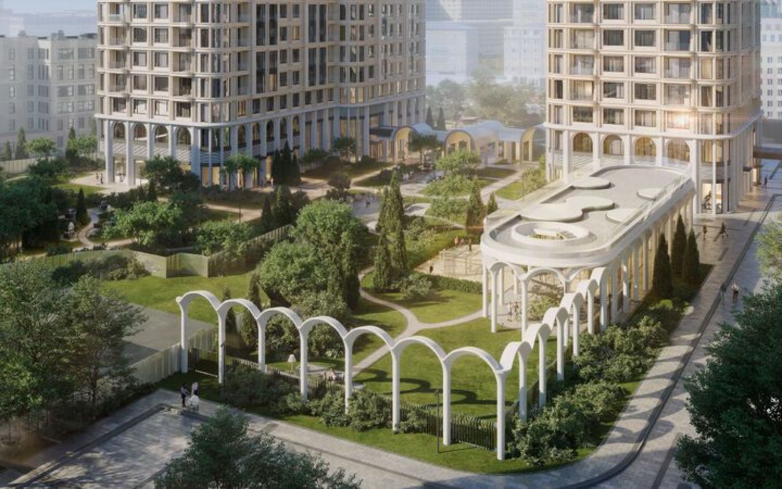 Площадь двора — 1,8 га, половина территории покрыта деревьями, кустарниками и лужайками. Фонтаны, патио, галерея, лаунжи, зеленые кабинеты, событийная площадь, детская и спортивная площадки. Контроль доступа на территорию, охрана и видеонаблюдение.