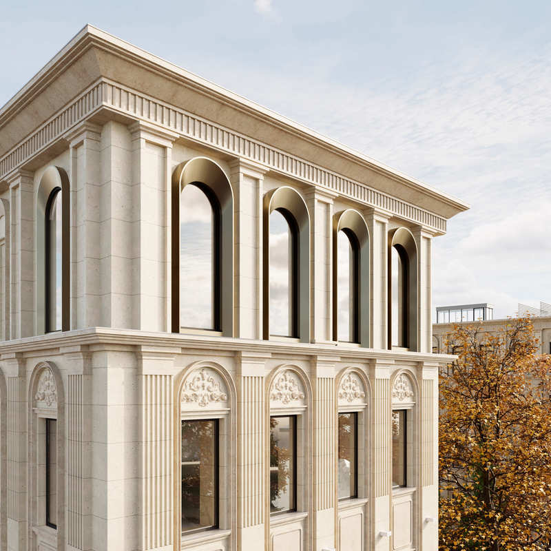 Фасады бизнес-центра выполнены в неоклассическом стиле с применением натурального камня, архитектурного бетона и металлических элементов в качестве акцентов. Территория внутреннего двора и прилегающего сквера будет благоустроена, атмосферу дополнит деликатная архитектурная подсветка.