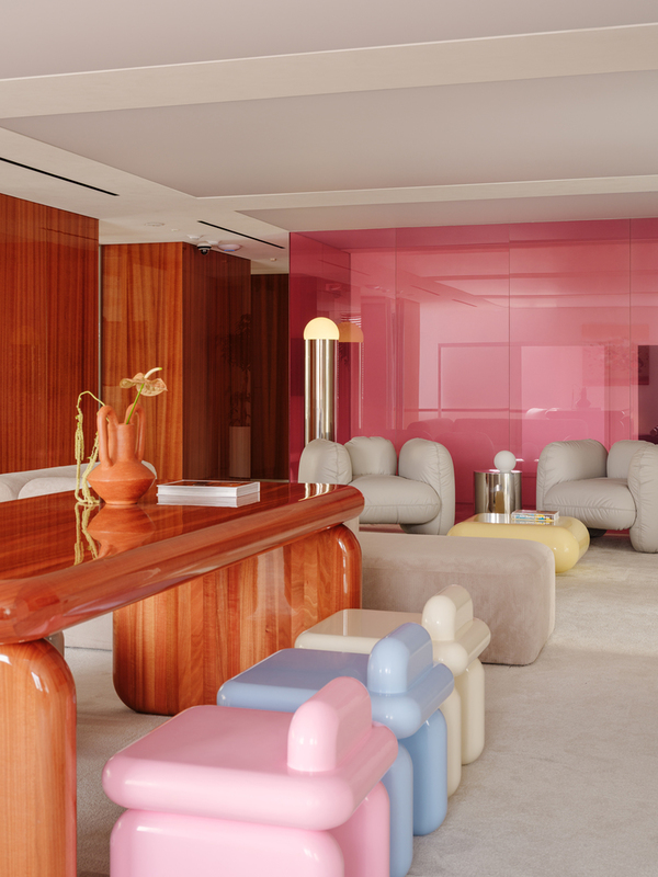 В зоне ожидания — мягкие диваны и большой авторский переговорный стол из массива Макоре. В обивке мебели сочетаются дерево и фактурный текстиль, а также нержавеющая сталь, что, по словам авторов, одновременно создает атмосферу уюта и современности. Ритм рядов стеклянных и шпонированных перегородок между переговорными комнатами, которые выполнены в розовых и голубых тонах, добавляет элемент динамичности. Зона, где представлен архитектурный макет, решена в формате технорума в виде куба, полностью отделанного лаковым шпоном, с медиаэкраном во всю стену.