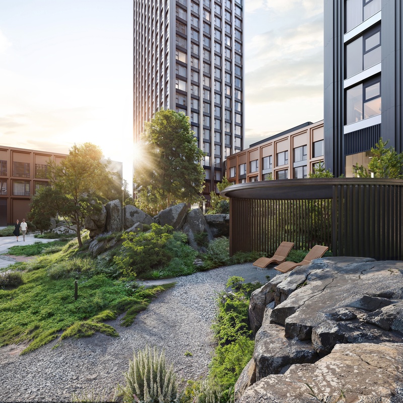 На территории жилого комплекса обустроят площадки для йоги и воркаута, места для отдыха, включая шезлонги под навесом, водоем с водопадом, уличную террасу и детский игровой комплекс. Собственная инфраструктура проекта включает городскую школу и детский сад, а также масштабный плей-хаб для юных резидентов.
