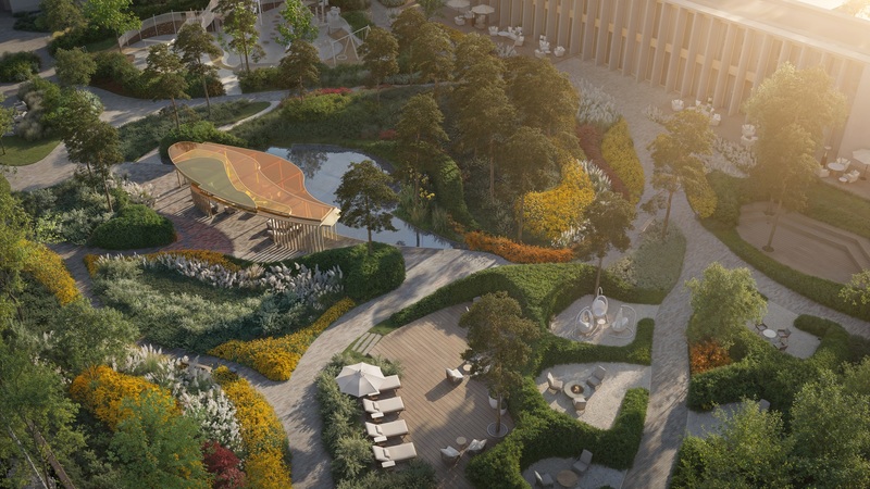 Ландшафтный парк клубного квартала «Фрунзенская набережная» с соснами и витражами