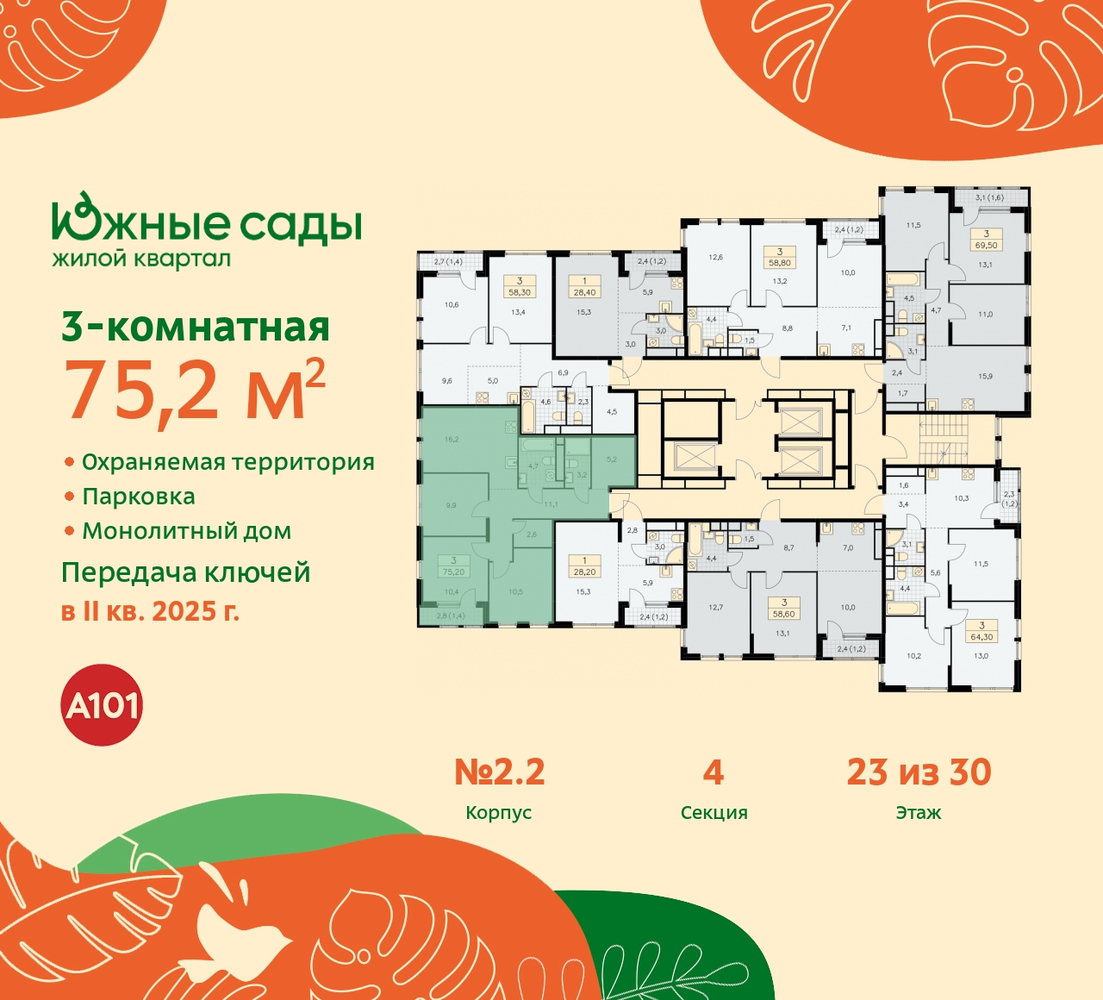 Трехкомнатная квартира с отделкой в ЖК "Южные сады" на 23 этаже. Общая площадь: 75.2 кв.м., жилая: 30.7 кв.м., площадь просторной кухни-столовой: 16.2 кв.м. Угловая квартира, идеально подойдет любителям тишины и панорамных видов. В квартире одна лоджия, два совмещенных санузла. Высота потолков 2.87 м. Имеется ниша под гардероб. Квартира находится в корпусе 2.2. Дом монолитный, одноподъездный, высотой 30 этажей. На этаже 8 квартир. В подъезде 3 грузовых лифта. Начало строительства - 2 квартал 2022 года. Окончание строительства - 1 квартал 2026 года. Оформление сделки по договору долевого участия. Артикул квартиры по базе застройщика 99К-2.2-482. В шаговой доступности от дома находятся станции метро (расстояние по прямой): «Бунинская аллея» (1.1 км), «Улица Горчакова» (1.2 км), «Бульвар адмирала Ушакова» (1.7 км), «Потапово» (1.7 км). ПРЕДЛОЖЕНИЯ ОТ ЗАСТРОЙЩИКА В ОКТЯБРЕ 2025: Ипотека от 13,9 % для всех! На весь срок. "Семейная ипотека" вернулась. Ставка от 3,5 % на весь срок! Без удорожания! Выгодное ипотечное комбо: Ипотека от 2200 р./мес. и от 6 % после рождения ребёнка! Ипотека для всех "Держи пять!" - ставка 5 % на 2 года! *более подробную информацию по скидкам и акциям уточняйте в отделе продаж Новый проект "Южные сады" от застройщика "А101" будет построен на юге Москвы в пешей доступности от метро "Бунинская аллея". Дома будут возведены в окружении парков, а на территории комплекса будет выполнено благоустройство "Сады Средиземноморья" - тёплые оттенки и натуральные материалы покрытий, разнообразие плодовых и вечнозелёных деревьев, живые изгороди и эстетика средиземноморского сада. На первых этажах откроются магазины, кафе с летними террасами, фитнес-залы и салоны красоты. Для каждой группы домов фасады разработаны отдельно. Сочетание различных цветов и материалов привносит разнообразие и динамику в облик нового района. В отделке вентилируемых фасадов будут применяться качественные и долговечные материалы: штукатурка, облицовочная фасадная плитка разных размеров и текстур. Подъезды с витражным остеклением хорошо просматриваются со стороны двора. Естественное освещение днём и уютный вечерний свет создают ощущение «я дома» задолго до входа в квартиру, повышают комфорт и безопасность. Эксклюзивный авторский дизайн входных групп от Studio 211 созвучен природному окружению. Среди особенностей проекта московская прописка, школы и детские сады Южного Бутово, удобный выезд на СБВ. В каждой квартире предусмотрены летние помещения, просторные окна, высокие потолки. На ваш выбор застройщик предлагает как квартиры без отделки, с отделкой WHITE BOX, а также с дизайнерской отделкой. (AQID01757626)