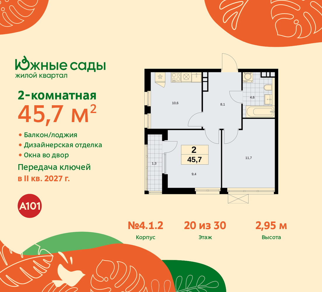 Просторная 2-комн. квартира с отделкой в ЖК "Южные сады" на 20 этаже. Общая площадь: 45.7 кв.м., жилая: 21.1 кв.м., площадь просторной кухни-столовой: 10.6 кв.м. Угловая квартира, идеально подойдет любителям тишины и панорамных видов. В квартире одна лоджия, один совмещенный санузел. Высота потолков 2.95 м. Дом монолитный, черырехподъездный, переменной этажности, от 11 до 30 этажей. Квартира находится в 4-й секции высотой 22 этажа в корпусе 4.1.2. На этаже 6 квартир. В подъезде 1 пассажирский и 1 грузовой лифт. Начало строительства - 2 квартал 2024 года. Окончание строительства - 2 квартал 2027 года. Оформление сделки по договору долевого участия. Артикул квартиры по базе застройщика 99К-4.1.2-523. В шаговой доступности от жилого комплекса имеются станции метро (расстояние по прямой): «Бунинская аллея» (1.0 км), «Улица Горчакова» (1.2 км), «Потапово» (1.6 км), «Бульвар адмирала Ушакова» (1.8 км). ПРЕДЛОЖЕНИЯ ОТ ЗАСТРОЙЩИКА В ОКТЯБРЕ 2025: Ипотека от 13,9 % для всех! На весь срок. "Семейная ипотека" вернулась. Ставка от 3,5 % на весь срок! Без удорожания! Выгодное ипотечное комбо: Ипотека от 2200 р./мес. и от 6 % после рождения ребёнка! Ипотека для всех "Держи пять!" - ставка 5 % на 2 года! *более подробную информацию по скидкам и акциям уточняйте в отделе продаж Новый проект "Южные сады" от застройщика "А101" будет построен на юге Москвы в пешей доступности от метро "Бунинская аллея". Дома будут возведены в окружении парков, а на территории комплекса будет выполнено благоустройство "Сады Средиземноморья" - тёплые оттенки и натуральные материалы покрытий, разнообразие плодовых и вечнозелёных деревьев, живые изгороди и эстетика средиземноморского сада. На первых этажах откроются магазины, кафе с летними террасами, фитнес-залы и салоны красоты. Для каждой группы домов фасады разработаны отдельно. Сочетание различных цветов и материалов привносит разнообразие и динамику в облик нового района. В отделке вентилируемых фасадов будут применяться качественные и долговечные материалы: штукатурка, облицовочная фасадная плитка разных размеров и текстур. Подъезды с витражным остеклением хорошо просматриваются со стороны двора. Естественное освещение днём и уютный вечерний свет создают ощущение «я дома» задолго до входа в квартиру, повышают комфорт и безопасность. Эксклюзивный авторский дизайн входных групп от Studio 211 созвучен природному окружению. Среди особенностей проекта московская прописка, школы и детские сады Южного Бутово, удобный выезд на СБВ. В каждой квартире предусмотрены летние помещения, просторные окна, высокие потолки. На ваш выбор застройщик предлагает как квартиры без отделки, с отделкой WHITE BOX, а также с дизайнерской отделкой. (AQID02475553)