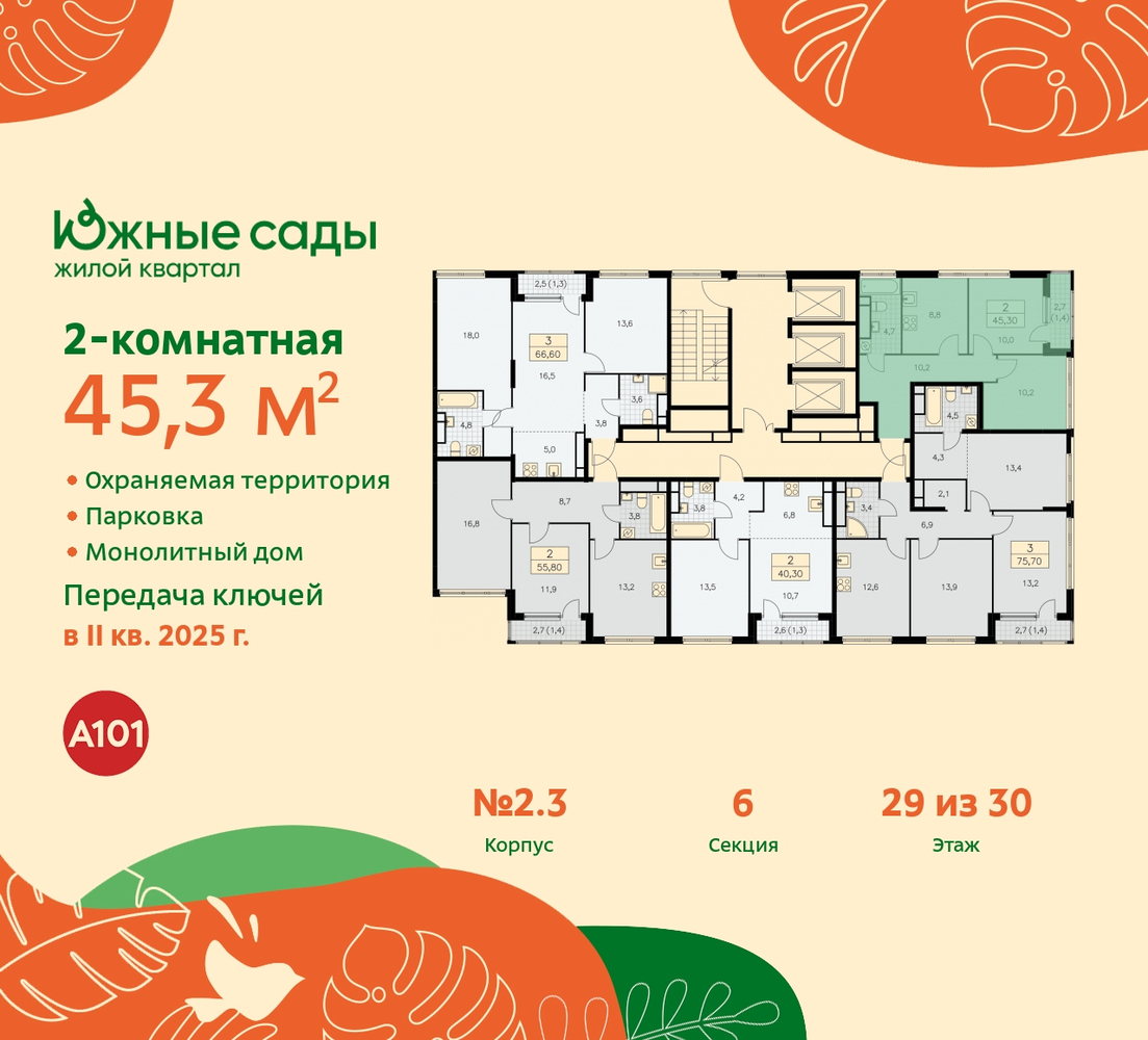 Просторная 2-комн. квартира в ЖК "Южные сады" на 29 этаже. Квартира без отделки, новый собственник может сделать ремонт по индивидуальному проекту. Общая площадь: 45.3 кв.м., жилая: 20.2 кв.м., площадь кухни: 8.8 кв.м. Угловая квартира, окна oбecпeчивaют paвнoмepнoe ocвeщeниe в тeчeниe дня. В квартире одна лоджия, один совмещенный санузел. Высота потолков 2.87 м. Эта квартира предлагается без отделки. Будут установлены стеклопакеты с повышенной тепло- и шумоизоляцией, в квартиру заведены все коммуникации. Вы сможете в полном объеме реализовать ваши идеи обустройства вашего комфортного дома. Видовая квартира. Дом монолитный, трехподъездный, переменной этажности, от 16 до 30 этажей. Квартира находится во 2-й секции высотой 30 этажей в корпусе 2.3. На этаже 5 квартир. В подъезде 3 грузовых лифта. Начало строительства - 2 квартал 2022 года. В настоящее время строительство окончено, дом сдан в 1 квартале 2026 года. Оформление сделки по договору купли-продажи. Артикул квартиры по базе застройщика 99К-2.3-784. В шаговой доступности от жилого комплекса находятся станции метро (расстояние по прямой): «Бунинская аллея» (1.0 км), «Улица Горчакова» (1.2 км), «Потапово» (1.6 км), «Бульвар адмирала Ушакова» (1.8 км). Новый проект "Южные сады" от застройщика "А101" будет построен на юге Москвы в пешей доступности от метро "Бунинская аллея". Дома будут возведены в окружении парков, а на территории комплекса будет выполнено благоустройство "Сады Средиземноморья" - тёплые оттенки и натуральные материалы покрытий, разнообразие плодовых и вечнозелёных деревьев, живые изгороди и эстетика средиземноморского сада. На первых этажах откроются магазины, кафе с летними террасами, фитнес-залы и салоны красоты. Для каждой группы домов фасады разработаны отдельно. Сочетание различных цветов и материалов привносит разнообразие и динамику в облик нового района. В отделке вентилируемых фасадов будут применяться качественные и долговечные материалы: штукатурка, облицовочная фасадная плитка разных размеров и текстур. Подъезды с витражным остеклением хорошо просматриваются со стороны двора. Естественное освещение днём и уютный вечерний свет создают ощущение «я дома» задолго до входа в квартиру, повышают комфорт и безопасность. Эксклюзивный авторский дизайн входных групп от Studio 211 созвучен природному окружению. Среди особенностей проекта московская прописка, школы и детские сады Южного Бутово, удобный выезд на СБВ. В каждой квартире предусмотрены летние помещения, просторные окна, высокие потолки. На ваш выбор застройщик предлагает как квартиры без отделки, с отделкой WHITE BOX, а также с дизайнерской отделкой. (AQID01758283)