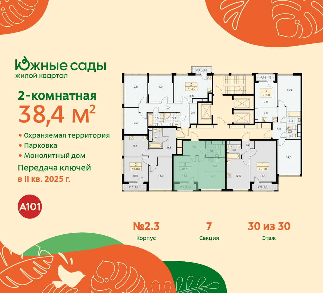 Продается двухкомнатная квартира с европланировкой в ЖК "Южные сады" на 30 этаже. Квартира без отделки, новый собственник может сделать ремонт по своему проекту. Общая площадь: 38.4 кв.м., жилая: 21.6 кв.м., общая площадь гостиной-столовой с кухонной зоной: 15.4 кв.м. Европланировка, кухня и гостиная объединены в одно просторное помещение. Комнаты изолированные, все окна выходят на одну сторону. В квартире одна лоджия, один совмещенный санузел. Высота потолков 2.87 м. Эта квартира предлагается без отделки. Будут установлены стеклопакеты с повышенной тепло- и шумоизоляцией, в квартиру заведены все коммуникации. Вы сможете в полном объеме реализовать ваши идеи обустройства вашего комфортного дома. Дом монолитный, трехподъездный, переменной этажности, от 16 до 30 этажей. Квартира находится в 3-й секции высотой 30 этажей в корпусе 2.3. На этаже 5 квартир. В подъезде 3 грузовых лифта. Начало строительства - 2 квартал 2022 года. Строительство завершено, дом сдан в 1 квартале 2026 года. Оформление сделки по договору купли-продажи. Артикул квартиры по базе застройщика 99К-2.3-935. В шаговой доступности от жилого комплекса расположены станции метро (расстояние по прямой): «Бунинская аллея» (1.0 км), «Улица Горчакова» (1.2 км), «Потапово» (1.6 км), «Бульвар адмирала Ушакова» (1.8 км). Новый проект "Южные сады" от застройщика "А101" будет построен на юге Москвы в пешей доступности от метро "Бунинская аллея". Дома будут возведены в окружении парков, а на территории комплекса будет выполнено благоустройство "Сады Средиземноморья" - тёплые оттенки и натуральные материалы покрытий, разнообразие плодовых и вечнозелёных деревьев, живые изгороди и эстетика средиземноморского сада. На первых этажах откроются магазины, кафе с летними террасами, фитнес-залы и салоны красоты. Для каждой группы домов фасады разработаны отдельно. Сочетание различных цветов и материалов привносит разнообразие и динамику в облик нового района. В отделке вентилируемых фасадов будут применяться качественные и долговечные материалы: штукатурка, облицовочная фасадная плитка разных размеров и текстур. Подъезды с витражным остеклением хорошо просматриваются со стороны двора. Естественное освещение днём и уютный вечерний свет создают ощущение «я дома» задолго до входа в квартиру, повышают комфорт и безопасность. Эксклюзивный авторский дизайн входных групп от Studio 211 созвучен природному окружению. Среди особенностей проекта московская прописка, школы и детские сады Южного Бутово, удобный выезд на СБВ. В каждой квартире предусмотрены летние помещения, просторные окна, высокие потолки. На ваш выбор застройщик предлагает как квартиры без отделки, с отделкой WHITE BOX, а также с дизайнерской отделкой. (AQID01758425)