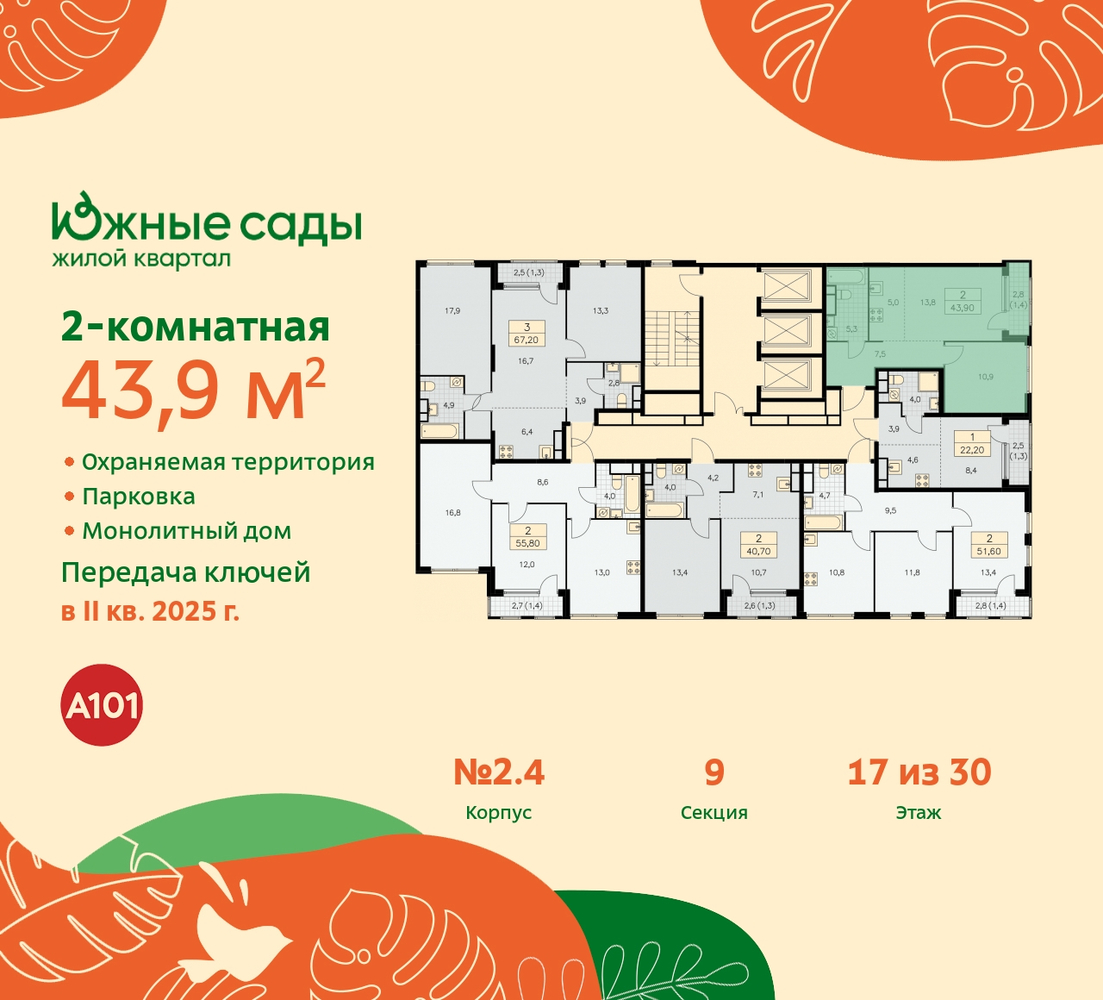 2-комн. квартира с европланировкой от застройщика в ЖК "Южные сады" на 17 этаже. Квартира без отделки, новый владелец может сделать ремонт по своему дизайн-проекту. Общая площадь: 43.9 кв.м., жилая: 24.8 кв.м., суммарная площадь гостиной-столовой с кухонной зоной: 18.9 кв.м. Европейская планировка, зона гостиной комнаты объединена с кухней. Комнаты изолированные, все окна выходят на одну сторону. В квартире одна лоджия, один совмещенный санузел. Высота потолков 2.87 м. Эта квартира предлагается без отделки. Будут установлены стеклопакеты с повышенной тепло- и шумоизоляцией, в квартиру заведены все коммуникации. Вы сможете в полном объеме реализовать ваши идеи обустройства вашего комфортного дома. Видовая квартира. Дом монолитный, трехподъездный, переменной этажности, от 16 до 30 этажей. Квартира находится во 2-й секции высотой 30 этажей в корпусе 2.4. На этаже 5 квартир. В подъезде 3 грузовых лифта. Начало строительства - 2 квартал 2022 года. В настоящее время строительство окончено, дом сдан в 1 квартале 2026 года. Оформление сделки по договору купли-продажи. Артикул квартиры по базе застройщика 99К-2.4-1118. В шаговой доступности от жилого комплекса имеются станции метро (расстояние по прямой): «Бунинская аллея» (1.0 км), «Улица Горчакова» (1.2 км), «Потапово» (1.6 км), «Бульвар адмирала Ушакова» (1.8 км). Новый проект "Южные сады" от застройщика "А101" будет построен на юге Москвы в пешей доступности от метро "Бунинская аллея". Дома будут возведены в окружении парков, а на территории комплекса будет выполнено благоустройство "Сады Средиземноморья" - тёплые оттенки и натуральные материалы покрытий, разнообразие плодовых и вечнозелёных деревьев, живые изгороди и эстетика средиземноморского сада. На первых этажах откроются магазины, кафе с летними террасами, фитнес-залы и салоны красоты. Для каждой группы домов фасады разработаны отдельно. Сочетание различных цветов и материалов привносит разнообразие и динамику в облик нового района. В отделке вентилируемых фасадов будут применяться качественные и долговечные материалы: штукатурка, облицовочная фасадная плитка разных размеров и текстур. Подъезды с витражным остеклением хорошо просматриваются со стороны двора. Естественное освещение днём и уютный вечерний свет создают ощущение «я дома» задолго до входа в квартиру, повышают комфорт и безопасность. Эксклюзивный авторский дизайн входных групп от Studio 211 созвучен природному окружению. Среди особенностей проекта московская прописка, школы и детские сады Южного Бутово, удобный выезд на СБВ. В каждой квартире предусмотрены летние помещения, просторные окна, высокие потолки. На ваш выбор застройщик предлагает как квартиры без отделки, с отделкой WHITE BOX, а также с дизайнерской отделкой. (AQID01760353)