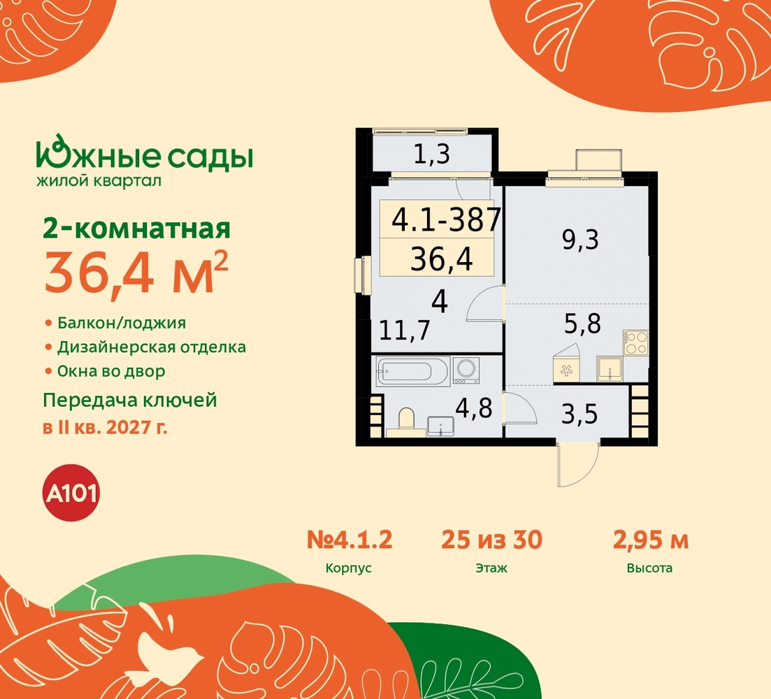Двухкомнатная квартира с европланировкой и отделкой в ЖК "Южные сады" на 25 этаже. Общая площадь: 36.4 кв.м., жилая: 20.8 кв.м., общая площадь гостиной-столовой с кухонной зоной: 15.1 кв.м. Европейская планировка, кухня-гостиная - идеальный вариант для тех, кто любит часто принимать гостей. Комнаты изолированные, все окна выходят на одну сторону. В квартире один балкон, один совмещенный санузел. Высота потолков 2.95 м. Дом монолитный, черырехподъездный, переменной этажности, от 11 до 30 этажей. Квартира находится в 3-й секции высотой 30 этажей в корпусе 4.1.2. На этаже 5 квартир. В подъезде 2 пассажирских и 1 грузовой лифт. Начало строительства - 2 квартал 2024 года. Окончание строительства - 2 квартал 2027 года. Оформление сделки по договору долевого участия. Артикул квартиры по базе застройщика 99К-4.1.2-387. В шаговой доступности от жилого комплекса находятся станции метро (расстояние по прямой): «Бунинская аллея» (1.1 км), «Улица Горчакова» (1.2 км), «Бульвар адмирала Ушакова» (1.7 км), «Потапово» (1.7 км). Новый проект "Южные сады" от застройщика "А101" будет построен на юге Москвы в пешей доступности от метро "Бунинская аллея". Дома будут возведены в окружении парков, а на территории комплекса будет выполнено благоустройство "Сады Средиземноморья" - тёплые оттенки и натуральные материалы покрытий, разнообразие плодовых и вечнозелёных деревьев, живые изгороди и эстетика средиземноморского сада. На первых этажах откроются магазины, кафе с летними террасами, фитнес-залы и салоны красоты. Для каждой группы домов фасады разработаны отдельно. Сочетание различных цветов и материалов привносит разнообразие и динамику в облик нового района. В отделке вентилируемых фасадов будут применяться качественные и долговечные материалы: штукатурка, облицовочная фасадная плитка разных размеров и текстур. Подъезды с витражным остеклением хорошо просматриваются со стороны двора. Естественное освещение днём и уютный вечерний свет создают ощущение «я дома» задолго до входа в квартиру, повышают комфорт и безопасность. Эксклюзивный авторский дизайн входных групп от Studio 211 созвучен природному окружению. Среди особенностей проекта московская прописка, школы и детские сады Южного Бутово, удобный выезд на СБВ. В каждой квартире предусмотрены летние помещения, просторные окна, высокие потолки. На ваш выбор застройщик предлагает как квартиры без отделки, с отделкой WHITE BOX, а также с дизайнерской отделкой. (AQID02392893)