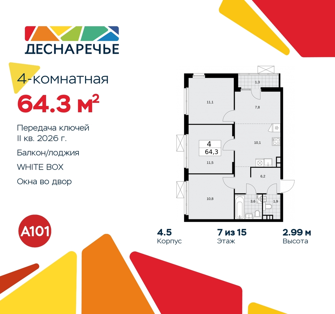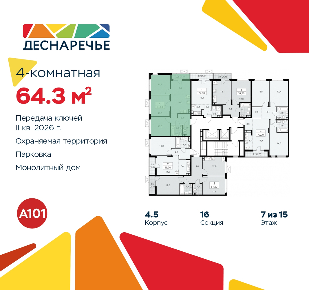 Просторная 4-комн. квартира с европланировкой и отделкой в ЖК "Деснаречье" на 7 этаже. Общая площадь: 64.3 кв.м., жилая: 41.2 кв.м., общая площадь гостиной-столовой с кухонной зоной: 17.9 кв.м. Европланировка, кухня-гостиная - идеальный вариант для тех, кто любит часто принимать гостей. Квартира угловая, идеально подойдет любителям тишины и панорамных видов. В квартире одна лоджия, один совмещенный и один раздельный санузел. Высота потолков 2.99 м. Эта квартира будет сдана с дизайнеркой отделкой "под ключ". Специально для вас мы разработали несколько решений дизайнерской отделки. В отделке используются только современный высококлассные материалы, на все работы предоставляется гарантия. В таком случае вы оплачиваете отделку в сегодняшних ценах, а эту стоимость вы можете разнести в ипотечных платежах. Дом монолитный, черырехподъездный, переменной этажности, от 12 до 15 этажей. Квартира находится в 3-й секции высотой 12 этажей в корпусе 4.5. На этаже 6 квартир. В подъезде 1 пассажирский и 1 грузовой лифт. Начало строительства - 3 квартал 2023 года. Окончание строительства - 2 квартал 2026 года. Оформление сделки по договору долевого участия. Артикул квартиры по базе застройщика 88К-4.5-1187. Масштабный проект "Деснаречье" на юго-западе Москвы, который включает три новых района («квартала»), объединённые общей идеей – воплотить в реальность мечты современных жителей столицы об интересном, комфортном и разноплановом городском пространстве в окружении рек и лесов, словно сошедших с полотен русских живописцев: - «Берег» оценят все, кому близка водная стихия: плеск волн, солнечные блики и прогулки вдоль тихого течения речи. - «Лес» утопает в зелени парков и лесов. Здесь соблюдён идеальный баланс загородного спокойствия и столичного комфорта. - «Парк», самый энергичный и яркий, отличается высокой концентрацией пространств для спорта и творчества. Жилой комплекс "Деснаречье" расположится в 12 км от МКАД по современному Калужскому шоссе. Внешний облик зданий соответствует современному стилю и стандартам, характерным и для других популярных проектов ГК «А101»: сочетание контрастных тонов, большое количество остекления, в котором отражается небо, гармония с природным окружением. Весь город - в вашем районе. Находиться на территории «15-минутного города» значит иметь всё необходимое для полноценной жизни в шаговой доступности. Маршруты в районе «Деснаречье» выстроены так, чтобы добраться до магазинов, парков, школ, салонов услуг и других объектов можно было всего за несколько минут пешком или на велосипеде. Двор закрытый от машин – это тишина, комфорт и безопасность, поэтому все машино-места (включая «семейные» и увеличенные, с возможностью установки роллетных шкафов) находятся в подземном паркинге. В паркинги можно спуститься на лифте из любого подъезда или по лестнице. Рядом с «Деснаречьем» в 2027 году планируется открытие станции метро «Десна», до которой будет удобно добраться пешком или на велосипеде. Дорога на автомобиле до перехватывающих парковок станций «Ольховая» и «Прокшино» займёт около 10 минут. В процессе реализации проекта будут появляться новые маршруты общественного транспорта по районам. Уже сейчас на Калужском шоссе развита сеть наземного транспорта: два десятка автобусов и маршрутных такси прибывают на остановки с интервалом 5–10 минут. (AQID02264474)