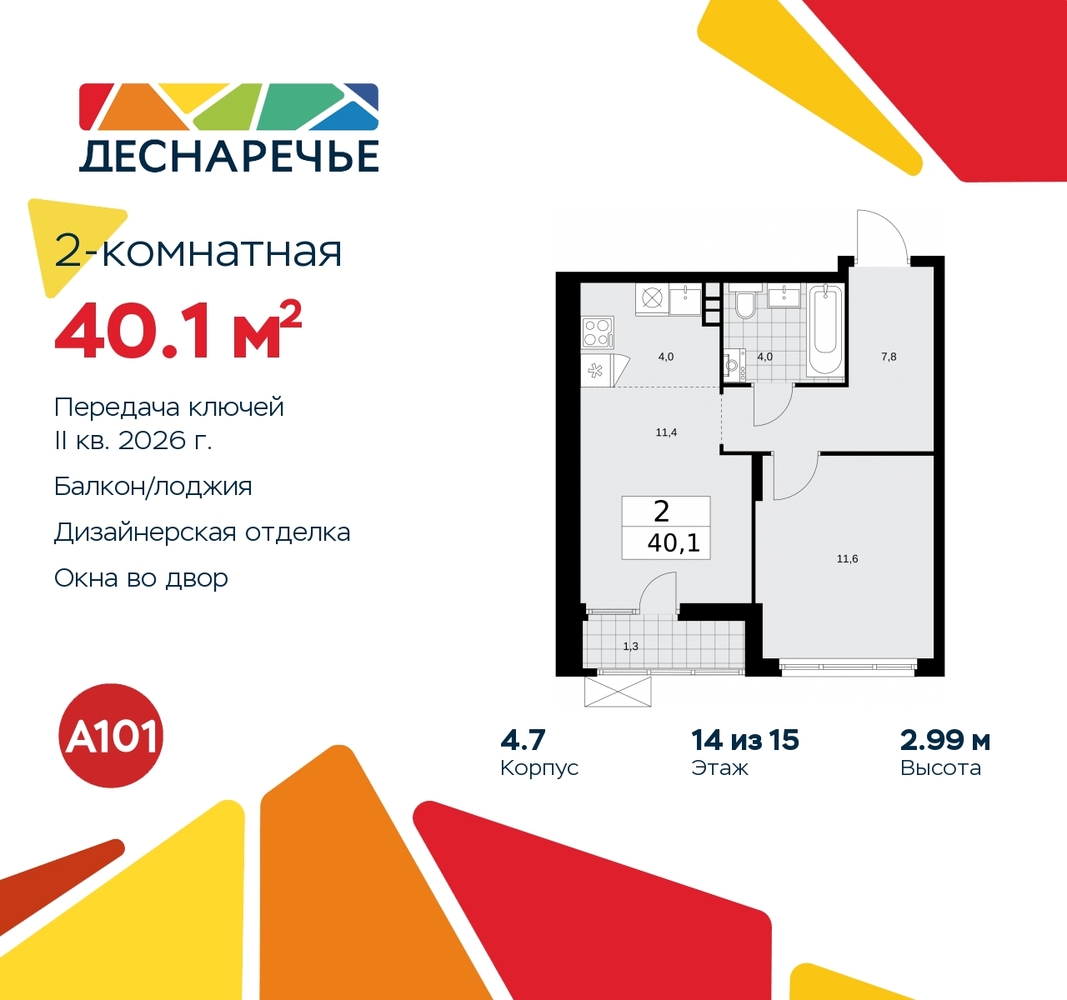 Просторная 2-комн. квартира с европланировкой и отделкой в ЖК "Деснаречье" на 14 этаже. Общая площадь: 40.1 кв.м., жилая: 23 кв.м., общая площадь гостиной-столовой с кухонной зоной: 15.4 кв.м. Европланировка, зона гостиной комнаты объединена с кухней. Комнаты изолированные, все окна выходят на одну сторону. В квартире одна лоджия, один совмещенный санузел. Высота потолков 2.99 м. Эта квартира будет сдана с дизайнеркой отделкой "под ключ". Специально для вас мы разработали несколько решений дизайнерской отделки. В отделке используются только современный высококлассные материалы, на все работы предоставляется гарантия. В таком случае вы оплачиваете отделку в сегодняшних ценах, а эту стоимость вы можете разнести в ипотечных платежах. Дом монолитный, трехподъездный, высотой 15 этажей. Квартира находится в 3-й секции в корпусе 4.7. На этаже 6 квартир. В подъезде 1 пассажирский и 1 грузовой лифт. Начало строительства - 3 квартал 2023 года. Окончание строительства - 2 квартал 2026 года. Оформление сделки по договору долевого участия. Артикул квартиры по базе застройщика 88К-4.7-1688. ПРЕДЛОЖЕНИЯ ОТ ЗАСТРОЙЩИКА В ОКТЯБРЕ 2025: Ипотека от 13,9 % для всех! На весь срок. "Семейная ипотека" вернулась. Ставка от 3,5 % на весь срок! Без удорожания! Выгодное ипотечное комбо: Ипотека от 2200 р./мес. и от 6 % после рождения ребёнка! Ипотека для всех "Держи пять!" - ставка 5 % на 2 года! *более подробную информацию по скидкам и акциям уточняйте в отделе продаж Масштабный проект "Деснаречье" на юго-западе Москвы, который включает три новых района («квартала»), объединённые общей идеей – воплотить в реальность мечты современных жителей столицы об интересном, комфортном и разноплановом городском пространстве в окружении рек и лесов, словно сошедших с полотен русских живописцев: - «Берег» оценят все, кому близка водная стихия: плеск волн, солнечные блики и прогулки вдоль тихого течения речи. - «Лес» утопает в зелени парков и лесов. Здесь соблюдён идеальный баланс загородного спокойствия и столичного комфорта. - «Парк», самый энергичный и яркий, отличается высокой концентрацией пространств для спорта и творчества. Жилой комплекс "Деснаречье" расположится в 12 км от МКАД по современному Калужскому шоссе. Внешний облик зданий соответствует современному стилю и стандартам, характерным и для других популярных проектов ГК «А101»: сочетание контрастных тонов, большое количество остекления, в котором отражается небо, гармония с природным окружением. Весь город - в вашем районе. Находиться на территории «15-минутного города» значит иметь всё необходимое для полноценной жизни в шаговой доступности. Маршруты в районе «Деснаречье» выстроены так, чтобы добраться до магазинов, парков, школ, салонов услуг и других объектов можно было всего за несколько минут пешком или на велосипеде. Двор закрытый от машин – это тишина, комфорт и безопасность, поэтому все машино-места (включая «семейные» и увеличенные, с возможностью установки роллетных шкафов) находятся в подземном паркинге. В паркинги можно спуститься на лифте из любого подъезда или по лестнице. Рядом с «Деснаречьем» в 2027 году планируется открытие станции метро «Десна», до которой будет удобно добраться пешком или на велосипеде. Дорога на автомобиле до перехватывающих парковок станций «Ольховая» и «Прокшино» займёт около 10 минут. В процессе реализации про