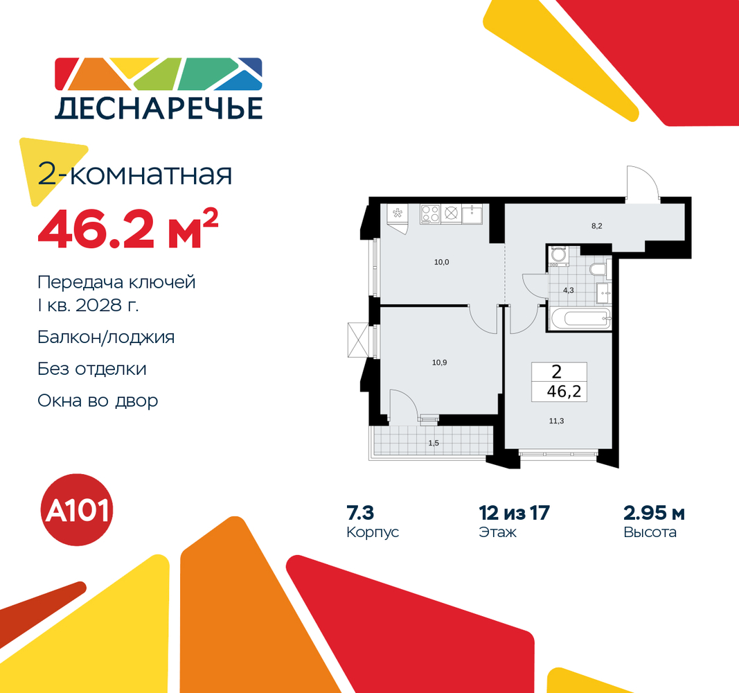 Двухкомнатная квартира от застройщика в ЖК "Деснаречье" на 12 этаже. Квартира без отделки, после оформления собственности можно делать ремонт. Общая площадь: 46.2 кв.м., жилая: 22.2 кв.м., площадь просторной кухни-столовой: 10 кв.м. Квартира угловая, идеально подойдет любителям тишины и панорамных видов. В квартире одна лоджия, один совмещенный санузел. Высота потолков 2.95 м. Эта квартира предлагается без отделки. Будут установлены стеклопакеты с повышенной тепло- и шумоизоляцией, в квартиру заведены все коммуникации. Вы сможете в полном объеме реализовать ваши идеи обустройства вашего комфортного дома. Для тех, кто ценит время и не хочет дополнительных трат на ремонт мы предлагаем квартиры с предчистовой и дизайнерской отделкой. Дом монолитный, черырехподъездный, переменной этажности, от 9 до 17 этажей. Квартира находится в 1-й секции высотой 15 этажей в корпусе 7.3. На этаже 5 квартир. В подъезде 1 пассажирский и 1 грузовой лифт. Начало строительства - 2 квартал 2025 года. Окончание строительства - 1 квартал 2028 года. Оформление сделки по договору долевого участия. Артикул квартиры по базе застройщика 88К-7.3-642. Масштабный проект "Деснаречье" на юго-западе Москвы, который включает три новых района («квартала»), объединённые общей идеей – воплотить в реальность мечты современных жителей столицы об интересном, комфортном и разноплановом городском пространстве в окружении рек и лесов, словно сошедших с полотен русских живописцев: - «Берег» оценят все, кому близка водная стихия: плеск волн, солнечные блики и прогулки вдоль тихого течения речи. - «Лес» утопает в зелени парков и лесов. Здесь соблюдён идеальный баланс загородного спокойствия и столичного комфорта. - «Парк», самый энергичный и яркий, отличается высокой концентрацией пространств для спорта и творчества. Жилой комплекс "Деснаречье" расположится в 12 км от МКАД по современному Калужскому шоссе. Внешний облик зданий соответствует современному стилю и стандартам, характерным и для других популярных проектов ГК «А101»: сочетание контрастных тонов, большое количество остекления, в котором отражается небо, гармония с природным окружением. Весь город - в вашем районе. Находиться на территории «15-минутного города» значит иметь всё необходимое для полноценной жизни в шаговой доступности. Маршруты в районе «Деснаречье» выстроены так, чтобы добраться до магазинов, парков, школ, салонов услуг и других объектов можно было всего за несколько минут пешком или на велосипеде. Двор закрытый от машин – это тишина, комфорт и безопасность, поэтому все машино-места (включая «семейные» и увеличенные, с возможностью установки роллетных шкафов) находятся в подземном паркинге. В паркинги можно спуститься на лифте из любого подъезда или по лестнице. Рядом с «Деснаречьем» в 2027 году планируется открытие станции метро «Десна», до которой будет удобно добраться пешком или на велосипеде. Дорога на автомобиле до перехватывающих парковок станций «Ольховая» и «Прокшино» займёт около 10 минут. В процессе реализации проекта будут появляться новые маршруты общественного транспорта по районам. Уже сейчас на Калужском шоссе развита сеть наземного транспорта: два десятка автобусов и маршрутных такси прибывают на остановки с интервалом 5–10 минут. (AQID02490940)