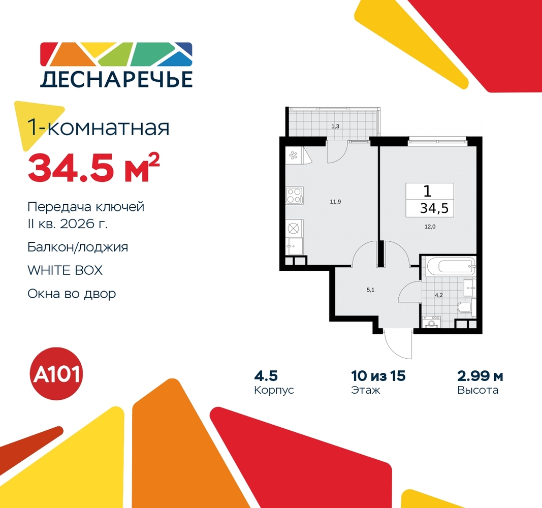Просторная однокомнатная квартира с отделкой в ЖК "Деснаречье" на 10 этаже. Общая площадь: 34.5 кв.м., жилая: 12 кв.м., площадь просторной кухни-столовой: 12 кв.м. Все окна выходят на одну сторону. В квартире один балкон, один совмещенный санузел. Высота потолков 2.99 м. Эта квартира будет сдана с дизайнеркой отделкой "под ключ". Специально для вас мы разработали несколько решений дизайнерской отделки. В отделке используются только современный высококлассные материалы, на все работы предоставляется гарантия. В таком случае вы оплачиваете отделку в сегодняшних ценах, а эту стоимость вы можете разнести в ипотечных платежах. Дом монолитный, черырехподъездный, переменной этажности, от 12 до 15 этажей. Квартира находится в 3-й секции высотой 12 этажей в корпусе 4.5. На этаже 6 квартир. В подъезде 1 пассажирский и 1 грузовой лифт. Начало строительства - 3 квартал 2023 года. Окончание строительства - 2 квартал 2026 года. Оформление сделки по договору долевого участия. Артикул квартиры по базе застройщика 88К-4.5-1207. Масштабный проект "Деснаречье" на юго-западе Москвы, который включает три новых района («квартала»), объединённые общей идеей – воплотить в реальность мечты современных жителей столицы об интересном, комфортном и разноплановом городском пространстве в окружении рек и лесов, словно сошедших с полотен русских живописцев: - «Берег» оценят все, кому близка водная стихия: плеск волн, солнечные блики и прогулки вдоль тихого течения речи. - «Лес» утопает в зелени парков и лесов. Здесь соблюдён идеальный баланс загородного спокойствия и столичного комфорта. - «Парк», самый энергичный и яркий, отличается высокой концентрацией пространств для спорта и творчества. Жилой комплекс "Деснаречье" расположится в 12 км от МКАД по современному Калужскому шоссе. Внешний облик зданий соответствует современному стилю и стандартам, характерным и для других популярных проектов ГК «А101»: сочетание контрастных тонов, большое количество остекления, в котором отражается небо, гармония с природным окружением. Весь город - в вашем районе. Находиться на территории «15-минутного города» значит иметь всё необходимое для полноценной жизни в шаговой доступности. Маршруты в районе «Деснаречье» выстроены так, чтобы добраться до магазинов, парков, школ, салонов услуг и других объектов можно было всего за несколько минут пешком или на велосипеде. Двор закрытый от машин – это тишина, комфорт и безопасность, поэтому все машино-места (включая «семейные» и увеличенные, с возможностью установки роллетных шкафов) находятся в подземном паркинге. В паркинги можно спуститься на лифте из любого подъезда или по лестнице. Рядом с «Деснаречьем» в 2027 году планируется открытие станции метро «Десна», до которой будет удобно добраться пешком или на велосипеде. Дорога на автомобиле до перехватывающих парковок станций «Ольховая» и «Прокшино» займёт около 10 минут. В процессе реализации проекта будут появляться новые маршруты общественного транспорта по районам. Уже сейчас на Калужском шоссе развита сеть наземного транспорта: два десятка автобусов и маршрутных такси прибывают на остановки с интервалом 5–10 минут. (AQID02264494)