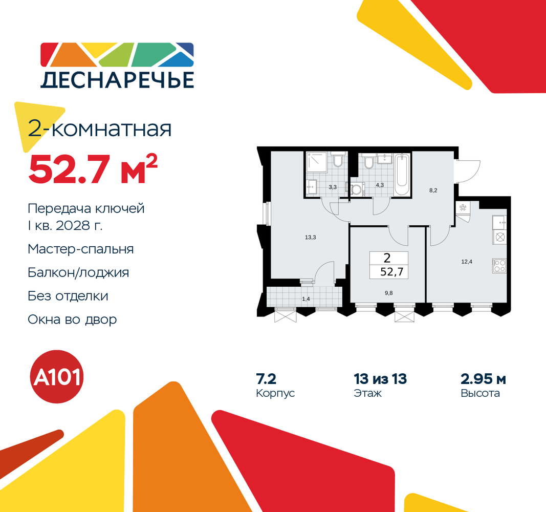 Двухкомнатная квартира от застройщика в ЖК "Деснаречье" на 13 этаже. Квартира без отделки, полностью готова к чистовой отделке и дальнейшему ремонту. Общая площадь: 52.7 кв.м., жилая: 23.1 кв.м., площадь просторной кухни-столовой: 12.4 кв.м. Квартира угловая, идеально подойдет любителям тишины и панорамных видов. В квартире одна лоджия, два совмещенных санузла. Высота потолков 2.95 м. Эта квартира предлагается без отделки. Будут установлены стеклопакеты с повышенной тепло- и шумоизоляцией, в квартиру заведены все коммуникации. Вы сможете в полном объеме реализовать ваши идеи обустройства вашего комфортного дома. Для тех, кто ценит время и не хочет дополнительных трат на ремонт мы предлагаем квартиры с предчистовой и дизайнерской отделкой. Дом монолитный, двухподъездный, высотой 13 этажей. Квартира находится в 1-й секции в корпусе 7.2. На этаже 5 квартир. В подъезде 1 пассажирский и 1 грузовой лифт. Начало строительства - 2 квартал 2025 года. Окончание строительства - 1 квартал 2028 года. Оформление сделки по договору долевого участия. Артикул квартиры по базе застройщика 88К-7.2-524. Масштабный проект "Деснаречье" на юго-западе Москвы, который включает три новых района («квартала»), объединённые общей идеей – воплотить в реальность мечты современных жителей столицы об интересном, комфортном и разноплановом городском пространстве в окружении рек и лесов, словно сошедших с полотен русских живописцев: - «Берег» оценят все, кому близка водная стихия: плеск волн, солнечные блики и прогулки вдоль тихого течения речи. - «Лес» утопает в зелени парков и лесов. Здесь соблюдён идеальный баланс загородного спокойствия и столичного комфорта. - «Парк», самый энергичный и яркий, отличается высокой концентрацией пространств для спорта и творчества. Жилой комплекс "Деснаречье" расположится в 12 км от МКАД по современному Калужскому шоссе. Внешний облик зданий соответствует современному стилю и стандартам, характерным и для других популярных проектов ГК «А101»: сочетание контрастных тонов, большое количество остекления, в котором отражается небо, гармония с природным окружением. Весь город - в вашем районе. Находиться на территории «15-минутного города» значит иметь всё необходимое для полноценной жизни в шаговой доступности. Маршруты в районе «Деснаречье» выстроены так, чтобы добраться до магазинов, парков, школ, салонов услуг и других объектов можно было всего за несколько минут пешком или на велосипеде. Двор закрытый от машин – это тишина, комфорт и безопасность, поэтому все машино-места (включая «семейные» и увеличенные, с возможностью установки роллетных шкафов) находятся в подземном паркинге. В паркинги можно спуститься на лифте из любого подъезда или по лестнице. Рядом с «Деснаречьем» в 2027 году планируется открытие станции метро «Десна», до которой будет удобно добраться пешком или на велосипеде. Дорога на автомобиле до перехватывающих парковок станций «Ольховая» и «Прокшино» займёт около 10 минут. В процессе реализации проекта будут появляться новые маршруты общественного транспорта по районам. Уже сейчас на Калужском шоссе развита сеть наземного транспорта: два десятка автобусов и маршрутных такси прибывают на остановки с интервалом 5–10 минут. (AQID02490823)