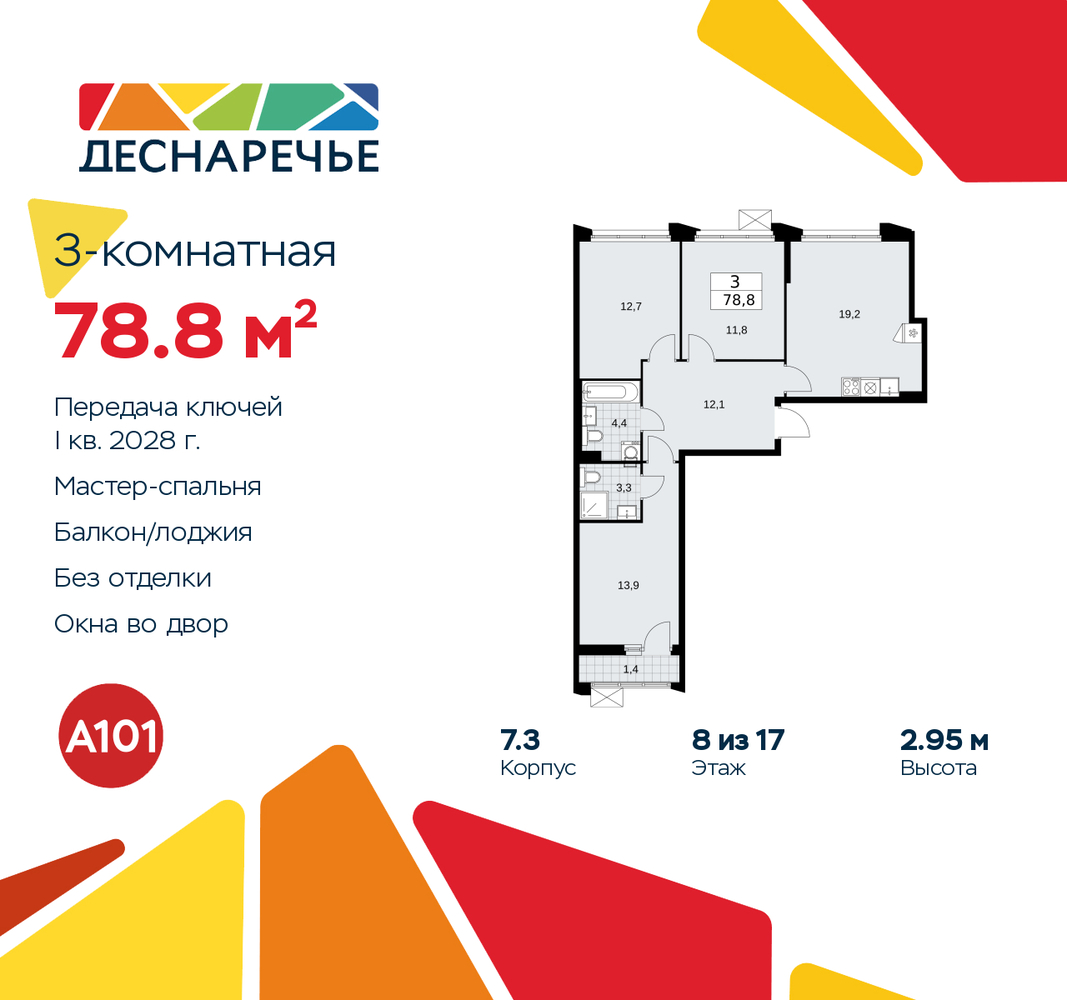 3-комн. квартира в ЖК "Деснаречье" на 8 этаже. Квартира без отделки, новый владелец может сделать ремонт по индивидуальному дизайн-проекту. Общая площадь: 78.8 кв.м., жилая: 38.4 кв.м., площадь просторной кухни-столовой: 19.2 кв.м. Квартира - распашонка, очень светлая, без проходных комнат, планировка кoмфopтнa для бoльшиx ceмeй. В квартире одна лоджия, два совмещенных санузла. Высота потолков 2.95 м. Эта квартира предлагается без отделки. Будут установлены стеклопакеты с повышенной тепло- и шумоизоляцией, в квартиру заведены все коммуникации. Вы сможете в полном объеме реализовать ваши идеи обустройства вашего комфортного дома. Для тех, кто ценит время и не хочет дополнительных трат на ремонт мы предлагаем квартиры с предчистовой и дизайнерской отделкой. Дом монолитный, черырехподъездный, переменной этажности, от 9 до 17 этажей. Квартира находится во 2-й секции высотой 9 этажей в корпусе 7.3. На этаже 5 квартир. В подъезде 1 пассажирский и 1 грузовой лифт. Начало строительства - 2 квартал 2025 года. Окончание строительства - 1 квартал 2028 года. Оформление сделки по договору долевого участия. Артикул квартиры по базе застройщика 88К-7.3-693. Масштабный проект "Деснаречье" на юго-западе Москвы, который включает три новых района («квартала»), объединённые общей идеей – воплотить в реальность мечты современных жителей столицы об интересном, комфортном и разноплановом городском пространстве в окружении рек и лесов, словно сошедших с полотен русских живописцев: - «Берег» оценят все, кому близка водная стихия: плеск волн, солнечные блики и прогулки вдоль тихого течения речи. - «Лес» утопает в зелени парков и лесов. Здесь соблюдён идеальный баланс загородного спокойствия и столичного комфорта. - «Парк», самый энергичный и яркий, отличается высокой концентрацией пространств для спорта и творчества. Жилой комплекс "Деснаречье" расположится в 12 км от МКАД по современному Калужскому шоссе. Внешний облик зданий соответствует современному стилю и стандартам, характерным и для других популярных проектов ГК «А101»: сочетание контрастных тонов, большое количество остекления, в котором отражается небо, гармония с природным окружением. Весь город - в вашем районе. Находиться на территории «15-минутного города» значит иметь всё необходимое для полноценной жизни в шаговой доступности. Маршруты в районе «Деснаречье» выстроены так, чтобы добраться до магазинов, парков, школ, салонов услуг и других объектов можно было всего за несколько минут пешком или на велосипеде. Двор закрытый от машин – это тишина, комфорт и безопасность, поэтому все машино-места (включая «семейные» и увеличенные, с возможностью установки роллетных шкафов) находятся в подземном паркинге. В паркинги можно спуститься на лифте из любого подъезда или по лестнице. Рядом с «Деснаречьем» в 2027 году планируется открытие станции метро «Десна», до которой будет удобно добраться пешком или на велосипеде. Дорога на автомобиле до перехватывающих парковок станций «Ольховая» и «Прокшино» займёт около 10 минут. В процессе реализации проекта будут появляться новые маршруты общественного транспорта по районам. Уже сейчас на Калужском шоссе развита сеть наземного транспорта: два десятка автобусов и маршрутных такси прибывают на остановки с интервалом 5–10 минут. (AQID02490991)