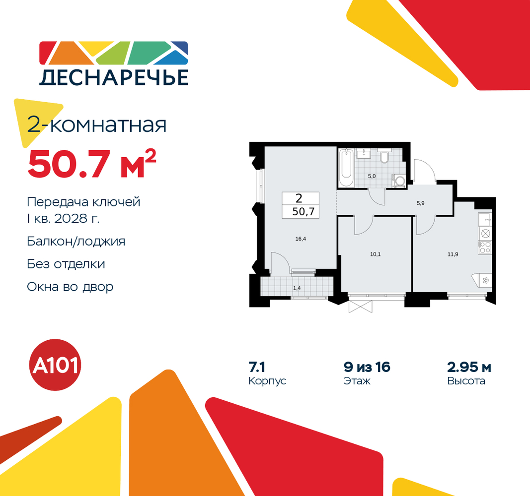 Просторная двухкомнатная квартира в ЖК "Деснаречье" на 9 этаже. Квартира без отделки, полностью готова к ремонту. Общая площадь: 50.7 кв.м., жилая: 26.5 кв.м., площадь просторной кухни-столовой: 11.9 кв.м. Квартира угловая, очень светлая, естественная вентиляция при открытии окон. В квартире одна лоджия, один совмещенный санузел. Высота потолков 2.95 м. Эта квартира предлагается без отделки. Будут установлены стеклопакеты с повышенной тепло- и шумоизоляцией, в квартиру заведены все коммуникации. Вы сможете в полном объеме реализовать ваши идеи обустройства вашего комфортного дома. Для тех, кто ценит время и не хочет дополнительных трат на ремонт мы предлагаем квартиры с предчистовой и дизайнерской отделкой. Дом монолитный, многоподъездный, переменной этажности, от 8 до 16 этажей. Квартира находится в 1-й секции высотой 14 этажей в корпусе 7.1. На этаже 5 квартир. В подъезде 1 пассажирский и 1 грузовой лифт. Начало строительства - 2 квартал 2025 года. Окончание строительства - 1 квартал 2028 года. Оформление сделки по договору долевого участия. Артикул квартиры по базе застройщика 88К-7.1-36. Масштабный проект "Деснаречье" на юго-западе Москвы, который включает три новых района («квартала»), объединённые общей идеей – воплотить в реальность мечты современных жителей столицы об интересном, комфортном и разноплановом городском пространстве в окружении рек и лесов, словно сошедших с полотен русских живописцев: - «Берег» оценят все, кому близка водная стихия: плеск волн, солнечные блики и прогулки вдоль тихого течения речи. - «Лес» утопает в зелени парков и лесов. Здесь соблюдён идеальный баланс загородного спокойствия и столичного комфорта. - «Парк», самый энергичный и яркий, отличается высокой концентрацией пространств для спорта и творчества. Жилой комплекс "Деснаречье" расположится в 12 км от МКАД по современному Калужскому шоссе. Внешний облик зданий соответствует современному стилю и стандартам, характерным и для других популярных проектов ГК «А101»: сочетание контрастных тонов, большое количество остекления, в котором отражается небо, гармония с природным окружением. Весь город - в вашем районе. Находиться на территории «15-минутного города» значит иметь всё необходимое для полноценной жизни в шаговой доступности. Маршруты в районе «Деснаречье» выстроены так, чтобы добраться до магазинов, парков, школ, салонов услуг и других объектов можно было всего за несколько минут пешком или на велосипеде. Двор закрытый от машин – это тишина, комфорт и безопасность, поэтому все машино-места (включая «семейные» и увеличенные, с возможностью установки роллетных шкафов) находятся в подземном паркинге. В паркинги можно спуститься на лифте из любого подъезда или по лестнице. Рядом с «Деснаречьем» в 2027 году планируется открытие станции метро «Десна», до которой будет удобно добраться пешком или на велосипеде. Дорога на автомобиле до перехватывающих парковок станций «Ольховая» и «Прокшино» займёт около 10 минут. В процессе реализации проекта будут появляться новые маршруты общественного транспорта по районам. Уже сейчас на Калужском шоссе развита сеть наземного транспорта: два десятка автобусов и маршрутных такси прибывают на остановки с интервалом 5–10 минут. (AQID02490347)