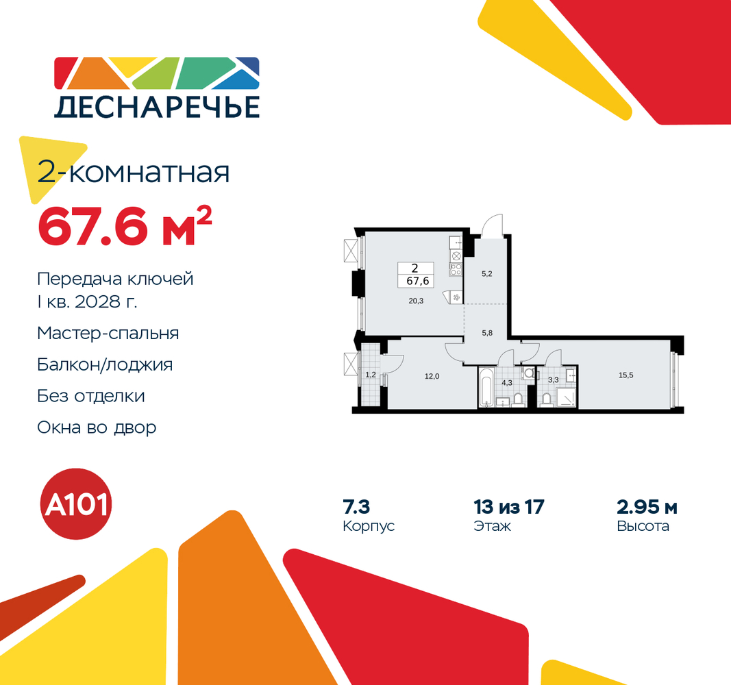 Продается 2-комн. квартира от застройщика в ЖК "Деснаречье" на 13 этаже. Квартира без отделки, после получения ключей можно делать ремонт. Общая площадь: 67.6 кв.м., жилая: 27.5 кв.м., площадь просторной кухни-столовой: 20.3 кв.м. Квартира - распашонка, без проходных комнат, окна выходят на paзные стороны дома. В квартире одна лоджия, два совмещенных санузла. Высота потолков 2.95 м. Эта квартира предлагается без отделки. Будут установлены стеклопакеты с повышенной тепло- и шумоизоляцией, в квартиру заведены все коммуникации. Вы сможете в полном объеме реализовать ваши идеи обустройства вашего комфортного дома. Для тех, кто ценит время и не хочет дополнительных трат на ремонт мы предлагаем квартиры с предчистовой и дизайнерской отделкой. Дом монолитный, черырехподъездный, переменной этажности, от 9 до 17 этажей. Квартира находится в 3-й секции высотой 17 этажей в корпусе 7.3. На этаже 5 квартир. В подъезде 1 пассажирский и 1 грузовой лифт. Начало строительства - 2 квартал 2025 года. Окончание строительства - 1 квартал 2028 года. Оформление сделки по договору долевого участия. Артикул квартиры по базе застройщика 88К-7.3-770. Масштабный проект "Деснаречье" на юго-западе Москвы, который включает три новых района («квартала»), объединённые общей идеей – воплотить в реальность мечты современных жителей столицы об интересном, комфортном и разноплановом городском пространстве в окружении рек и лесов, словно сошедших с полотен русских живописцев: - «Берег» оценят все, кому близка водная стихия: плеск волн, солнечные блики и прогулки вдоль тихого течения речи. - «Лес» утопает в зелени парков и лесов. Здесь соблюдён идеальный баланс загородного спокойствия и столичного комфорта. - «Парк», самый энергичный и яркий, отличается высокой концентрацией пространств для спорта и творчества. Жилой комплекс "Деснаречье" расположится в 12 км от МКАД по современному Калужскому шоссе. Внешний облик зданий соответствует современному стилю и стандартам, характерным и для других популярных проектов ГК «А101»: сочетание контрастных тонов, большое количество остекления, в котором отражается небо, гармония с природным окружением. Весь город - в вашем районе. Находиться на территории «15-минутного города» значит иметь всё необходимое для полноценной жизни в шаговой доступности. Маршруты в районе «Деснаречье» выстроены так, чтобы добраться до магазинов, парков, школ, салонов услуг и других объектов можно было всего за несколько минут пешком или на велосипеде. Двор закрытый от машин – это тишина, комфорт и безопасность, поэтому все машино-места (включая «семейные» и увеличенные, с возможностью установки роллетных шкафов) находятся в подземном паркинге. В паркинги можно спуститься на лифте из любого подъезда или по лестнице. Рядом с «Деснаречьем» в 2027 году планируется открытие станции метро «Десна», до которой будет удобно добраться пешком или на велосипеде. Дорога на автомобиле до перехватывающих парковок станций «Ольховая» и «Прокшино» займёт около 10 минут. В процессе реализации проекта будут появляться новые маршруты общественного транспорта по районам. Уже сейчас на Калужском шоссе развита сеть наземного транспорта: два десятка автобусов и маршрутных такси прибывают на остановки с интервалом 5–10 минут. (AQID02491068)