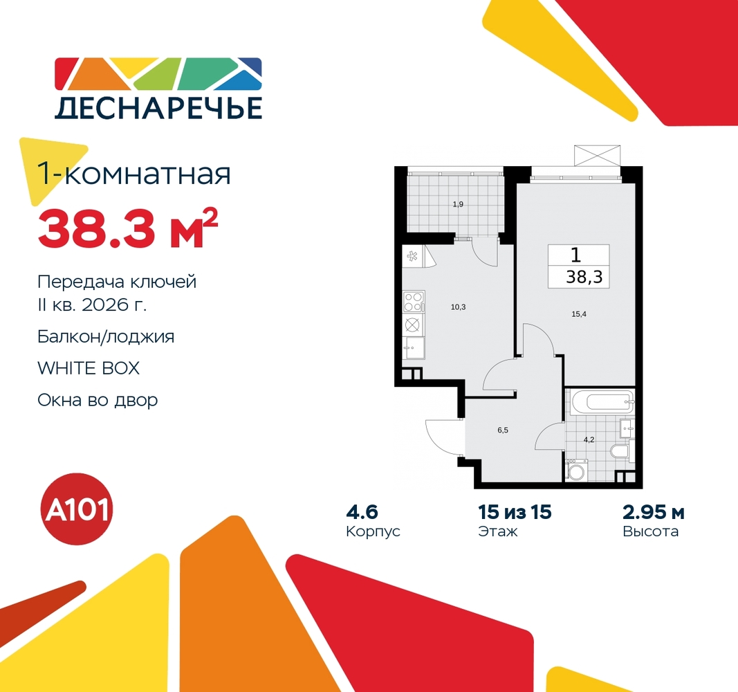 Продается однокомнатная квартира с отделкой в ЖК "Деснаречье" на 15 этаже. Общая площадь: 38.3 кв.м., жилая: 15.4 кв.м., площадь просторной кухни-столовой: 10.3 кв.м. Все окна выходят на одну сторону. В квартире одна лоджия, один совмещенный санузел. Высота потолков 2.95 м. Эта квартира будет сдана с дизайнеркой отделкой "под ключ". Специально для вас мы разработали несколько решений дизайнерской отделки. В отделке используются только современный высококлассные материалы, на все работы предоставляется гарантия. В таком случае вы оплачиваете отделку в сегодняшних ценах, а эту стоимость вы можете разнести в ипотечных платежах. Квартира находится в корпусе 4.6. Дом монолитный, одноподъездный, высотой 15 этажей. На этаже 10 квартир. В подъезде 1 пассажирский и 1 грузовой лифт. Начало строительства - 3 квартал 2023 года. Окончание строительства - 2 квартал 2026 года. Оформление сделки по договору долевого участия. Артикул квартиры по базе застройщика 88К-4.6-1443. Масштабный проект "Деснаречье" на юго-западе Москвы, который включает три новых района («квартала»), объединённые общей идеей – воплотить в реальность мечты современных жителей столицы об интересном, комфортном и разноплановом городском пространстве в окружении рек и лесов, словно сошедших с полотен русских живописцев: - «Берег» оценят все, кому близка водная стихия: плеск волн, солнечные блики и прогулки вдоль тихого течения речи. - «Лес» утопает в зелени парков и лесов. Здесь соблюдён идеальный баланс загородного спокойствия и столичного комфорта. - «Парк», самый энергичный и яркий, отличается высокой концентрацией пространств для спорта и творчества. Жилой комплекс "Деснаречье" расположится в 12 км от МКАД по современному Калужскому шоссе. Внешний облик зданий соответствует современному стилю и стандартам, характерным и для других популярных проектов ГК «А101»: сочетание контрастных тонов, большое количество остекления, в котором отражается небо, гармония с природным окружением. Весь город - в вашем районе. Находиться на территории «15-минутного города» значит иметь всё необходимое для полноценной жизни в шаговой доступности. Маршруты в районе «Деснаречье» выстроены так, чтобы добраться до магазинов, парков, школ, салонов услуг и других объектов можно было всего за несколько минут пешком или на велосипеде. Двор закрытый от машин – это тишина, комфорт и безопасность, поэтому все машино-места (включая «семейные» и увеличенные, с возможностью установки роллетных шкафов) находятся в подземном паркинге. В паркинги можно спуститься на лифте из любого подъезда или по лестнице. Рядом с «Деснаречьем» в 2027 году планируется открытие станции метро «Десна», до которой будет удобно добраться пешком или на велосипеде. Дорога на автомобиле до перехватывающих парковок станций «Ольховая» и «Прокшино» займёт около 10 минут. В процессе реализации проекта будут появляться новые маршруты общественного транспорта по районам. Уже сейчас на Калужском шоссе развита сеть наземного транспорта: два десятка автобусов и маршрутных такси прибывают на остановки с интервалом 5–10 минут. (AQID02264745)