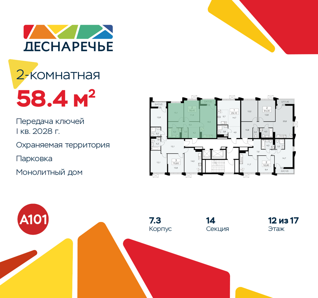 2-комн. квартира в ЖК "Деснаречье" на 12 этаже. Квартира без отделки, полностью готова к ремонту. Общая площадь: 58.4 кв.м., жилая: 21.5 кв.м., площадь просторной кухни-столовой: 18.5 кв.м. Комнаты изолированные, все окна выходят на одну сторону. В квартире одна лоджия, один совмещенный и один раздельный санузел. Высота потолков 2.95 м. Эта квартира предлагается без отделки. Будут установлены стеклопакеты с повышенной тепло- и шумоизоляцией, в квартиру заведены все коммуникации. Вы сможете в полном объеме реализовать ваши идеи обустройства вашего комфортного дома. Для тех, кто ценит время и не хочет дополнительных трат на ремонт мы предлагаем квартиры с предчистовой и дизайнерской отделкой. Дом монолитный, черырехподъездный, переменной этажности, от 9 до 17 этажей. Квартира находится в 4-й секции высотой 16 этажей в корпусе 7.3. На этаже 5 квартир. В подъезде 1 пассажирский и 1 грузовой лифт. Начало строительства - 2 квартал 2025 года. Окончание строительства - 1 квартал 2028 года. Оформление сделки по договору долевого участия. Артикул квартиры по базе застройщика 88К-7.3-846. Масштабный проект "Деснаречье" на юго-западе Москвы, который включает три новых района («квартала»), объединённые общей идеей – воплотить в реальность мечты современных жителей столицы об интересном, комфортном и разноплановом городском пространстве в окружении рек и лесов, словно сошедших с полотен русских живописцев: - «Берег» оценят все, кому близка водная стихия: плеск волн, солнечные блики и прогулки вдоль тихого течения речи. - «Лес» утопает в зелени парков и лесов. Здесь соблюдён идеальный баланс загородного спокойствия и столичного комфорта. - «Парк», самый энергичный и яркий, отличается высокой концентрацией пространств для спорта и творчества. Жилой комплекс "Деснаречье" расположится в 12 км от МКАД по современному Калужскому шоссе. Внешний облик зданий соответствует современному стилю и стандартам, характерным и для других популярных проектов ГК «А101»: сочетание контрастных тонов, большое количество остекления, в котором отражается небо, гармония с природным окружением. Весь город - в вашем районе. Находиться на территории «15-минутного города» значит иметь всё необходимое для полноценной жизни в шаговой доступности. Маршруты в районе «Деснаречье» выстроены так, чтобы добраться до магазинов, парков, школ, салонов услуг и других объектов можно было всего за несколько минут пешком или на велосипеде. Двор закрытый от машин – это тишина, комфорт и безопасность, поэтому все машино-места (включая «семейные» и увеличенные, с возможностью установки роллетных шкафов) находятся в подземном паркинге. В паркинги можно спуститься на лифте из любого подъезда или по лестнице. Рядом с «Деснаречьем» в 2027 году планируется открытие станции метро «Десна», до которой будет удобно добраться пешком или на велосипеде. Дорога на автомобиле до перехватывающих парковок станций «Ольховая» и «Прокшино» займёт около 10 минут. В процессе реализации проекта будут появляться новые маршруты общественного транспорта по районам. Уже сейчас на Калужском шоссе развита сеть наземного транспорта: два десятка автобусов и маршрутных такси прибывают на остановки с интервалом 5–10 минут. (AQID02491141)