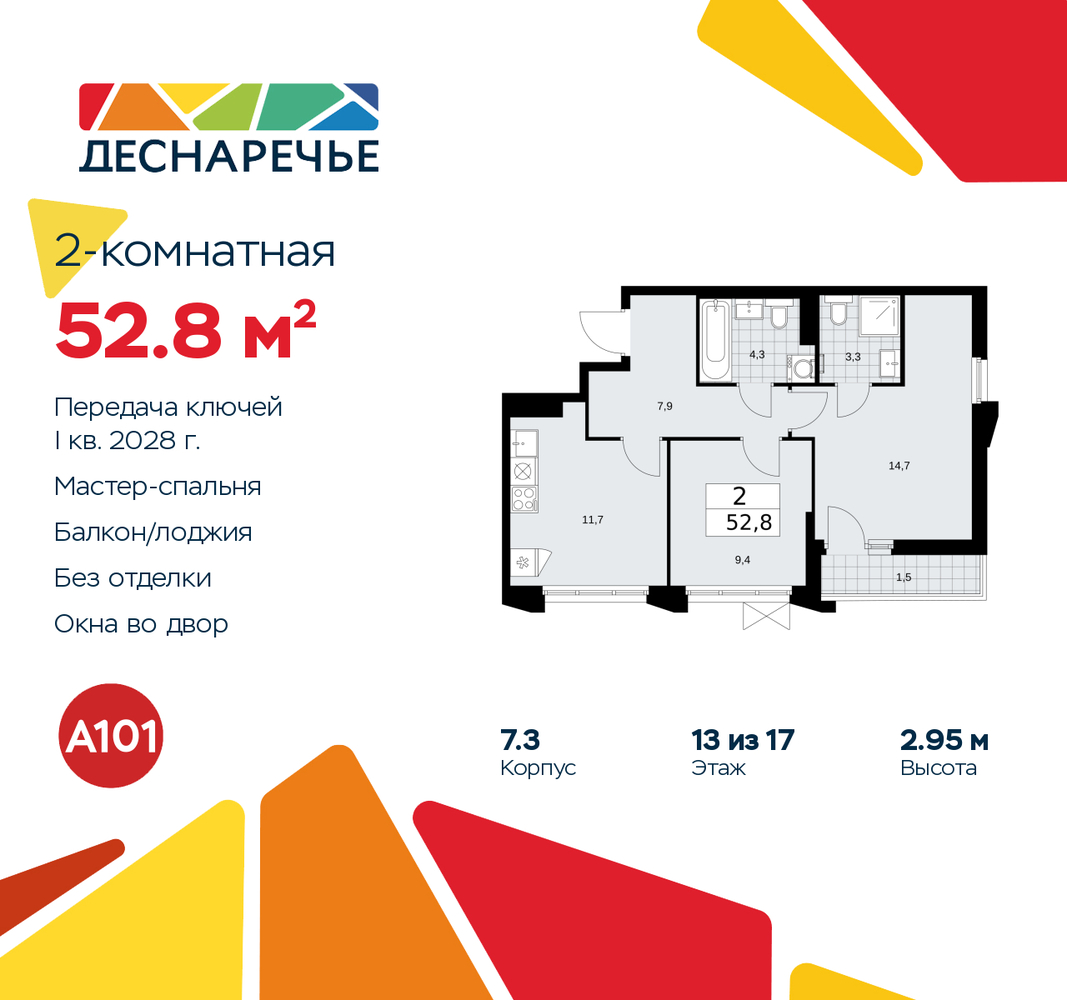 2-комн. квартира в ЖК "Деснаречье" на 13 этаже. Квартира без отделки, новый собственник может сделать ремонт по своему дизайн-проекту. Общая площадь: 52.8 кв.м., жилая: 24.1 кв.м., площадь просторной кухни-столовой: 11.7 кв.м. Квартира угловая, окна oбecпeчивaют paвнoмepнoe ocвeщeниe в тeчeниe дня. В квартире одна лоджия, два совмещенных санузла. Высота потолков 2.95 м. Эта квартира предлагается без отделки. Будут установлены стеклопакеты с повышенной тепло- и шумоизоляцией, в квартиру заведены все коммуникации. Вы сможете в полном объеме реализовать ваши идеи обустройства вашего комфортного дома. Для тех, кто ценит время и не хочет дополнительных трат на ремонт мы предлагаем квартиры с предчистовой и дизайнерской отделкой. Дом монолитный, черырехподъездный, переменной этажности, от 9 до 17 этажей. Квартира находится в 4-й секции высотой 16 этажей в корпусе 7.3. На этаже 5 квартир. В подъезде 1 пассажирский и 1 грузовой лифт. Начало строительства - 2 квартал 2025 года. Окончание строительства - 1 квартал 2028 года. Оформление сделки по договору долевого участия. Артикул квартиры по базе застройщика 88К-7.3-854. Масштабный проект "Деснаречье" на юго-западе Москвы, который включает три новых района («квартала»), объединённые общей идеей – воплотить в реальность мечты современных жителей столицы об интересном, комфортном и разноплановом городском пространстве в окружении рек и лесов, словно сошедших с полотен русских живописцев: - «Берег» оценят все, кому близка водная стихия: плеск волн, солнечные блики и прогулки вдоль тихого течения речи. - «Лес» утопает в зелени парков и лесов. Здесь соблюдён идеальный баланс загородного спокойствия и столичного комфорта. - «Парк», самый энергичный и яркий, отличается высокой концентрацией пространств для спорта и творчества. Жилой комплекс "Деснаречье" расположится в 12 км от МКАД по современному Калужскому шоссе. Внешний облик зданий соответствует современному стилю и стандартам, характерным и для других популярных проектов ГК «А101»: сочетание контрастных тонов, большое количество остекления, в котором отражается небо, гармония с природным окружением. Весь город - в вашем районе. Находиться на территории «15-минутного города» значит иметь всё необходимое для полноценной жизни в шаговой доступности. Маршруты в районе «Деснаречье» выстроены так, чтобы добраться до магазинов, парков, школ, салонов услуг и других объектов можно было всего за несколько минут пешком или на велосипеде. Двор закрытый от машин – это тишина, комфорт и безопасность, поэтому все машино-места (включая «семейные» и увеличенные, с возможностью установки роллетных шкафов) находятся в подземном паркинге. В паркинги можно спуститься на лифте из любого подъезда или по лестнице. Рядом с «Деснаречьем» в 2027 году планируется открытие станции метро «Десна», до которой будет удобно добраться пешком или на велосипеде. Дорога на автомобиле до перехватывающих парковок станций «Ольховая» и «Прокшино» займёт около 10 минут. В процессе реализации проекта будут появляться новые маршруты общественного транспорта по районам. Уже сейчас на Калужском шоссе развита сеть наземного транспорта: два десятка автобусов и маршрутных такси прибывают на остановки с интервалом 5–10 минут. (AQID02491149)