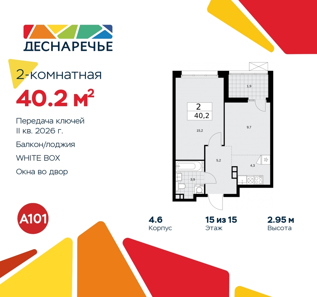 2-комн. квартира с европланировкой и отделкой в ЖК "Деснаречье" на 15 этаже. Общая площадь: 40.2 кв.м., жилая: 24.9 кв.м., общая площадь гостиной-столовой с кухонной зоной: 14 кв.м. Европейская планировка, за счет большой площади кухни-гостиной квартира выглядит просторной и очень удобна для жизни. Комнаты изолированные, все окна выходят на одну сторону. В квартире одна лоджия, один совмещенный санузел. Высота потолков 2.95 м. Эта квартира будет сдана с дизайнеркой отделкой "под ключ". Специально для вас мы разработали несколько решений дизайнерской отделки. В отделке используются только современный высококлассные материалы, на все работы предоставляется гарантия. В таком случае вы оплачиваете отделку в сегодняшних ценах, а эту стоимость вы можете разнести в ипотечных платежах. Квартира находится в корпусе 4.6. Дом монолитный, одноподъездный, высотой 15 этажей. На этаже 10 квартир. В подъезде 1 пассажирский и 1 грузовой лифт. Начало строительства - 3 квартал 2023 года. Окончание строительства - 2 квартал 2026 года. Оформление сделки по договору долевого участия. Артикул квартиры по базе застройщика 88К-4.6-1434. ПРЕДЛОЖЕНИЯ ОТ ЗАСТРОЙЩИКА В ОКТЯБРЕ 2025: Ипотека от 13,9 % для всех! На весь срок. "Семейная ипотека" вернулась. Ставка от 3,5 % на весь срок! Без удорожания! Выгодное ипотечное комбо: Ипотека от 2200 р./мес. и от 6 % после рождения ребёнка! Ипотека для всех "Держи пять!" - ставка 5 % на 2 года! *более подробную информацию по скидкам и акциям уточняйте в отделе продаж Масштабный проект "Деснаречье" на юго-западе Москвы, который включает три новых района («квартала»), объединённые общей идеей – воплотить в реальность мечты современных жителей столицы об интересном, комфортном и разноплановом городском пространстве в окружении рек и лесов, словно сошедших с полотен русских живописцев: - «Берег» оценят все, кому близка водная стихия: плеск волн, солнечные блики и прогулки вдоль тихого течения речи. - «Лес» утопает в зелени парков и лесов. Здесь соблюдён идеальный баланс загородного спокойствия и столичного комфорта. - «Парк», самый энергичный и яркий, отличается высокой концентрацией пространств для спорта и творчества. Жилой комплекс "Деснаречье" расположится в 12 км от МКАД по современному Калужскому шоссе. Внешний облик зданий соответствует современному стилю и стандартам, характерным и для других популярных проектов ГК «А101»: сочетание контрастных тонов, большое количество остекления, в котором отражается небо, гармония с природным окружением. Весь город - в вашем районе. Находиться на территории «15-минутного города» значит иметь всё необходимое для полноценной жизни в шаговой доступности. Маршруты в районе «Деснаречье» выстроены так, чтобы добраться до магазинов, парков, школ, салонов услуг и других объектов можно было всего за несколько минут пешком или на велосипеде. Двор закрытый от машин – это тишина, комфорт и безопасность, поэтому все машино-места (включая «семейные» и увеличенные, с возможностью установки роллетных шкафов) находятся в подземном паркинге. В паркинги можно спуститься на лифте из любого подъезда или по лестнице. Рядом с «Деснаречьем» в 2027 году планируется открытие станции метро «Десна», до которой будет удобно добраться пешком или на велосипеде. Дорога на автомобиле до перехватывающих парковок станций «Ольховая» и «Прокшино» займёт око