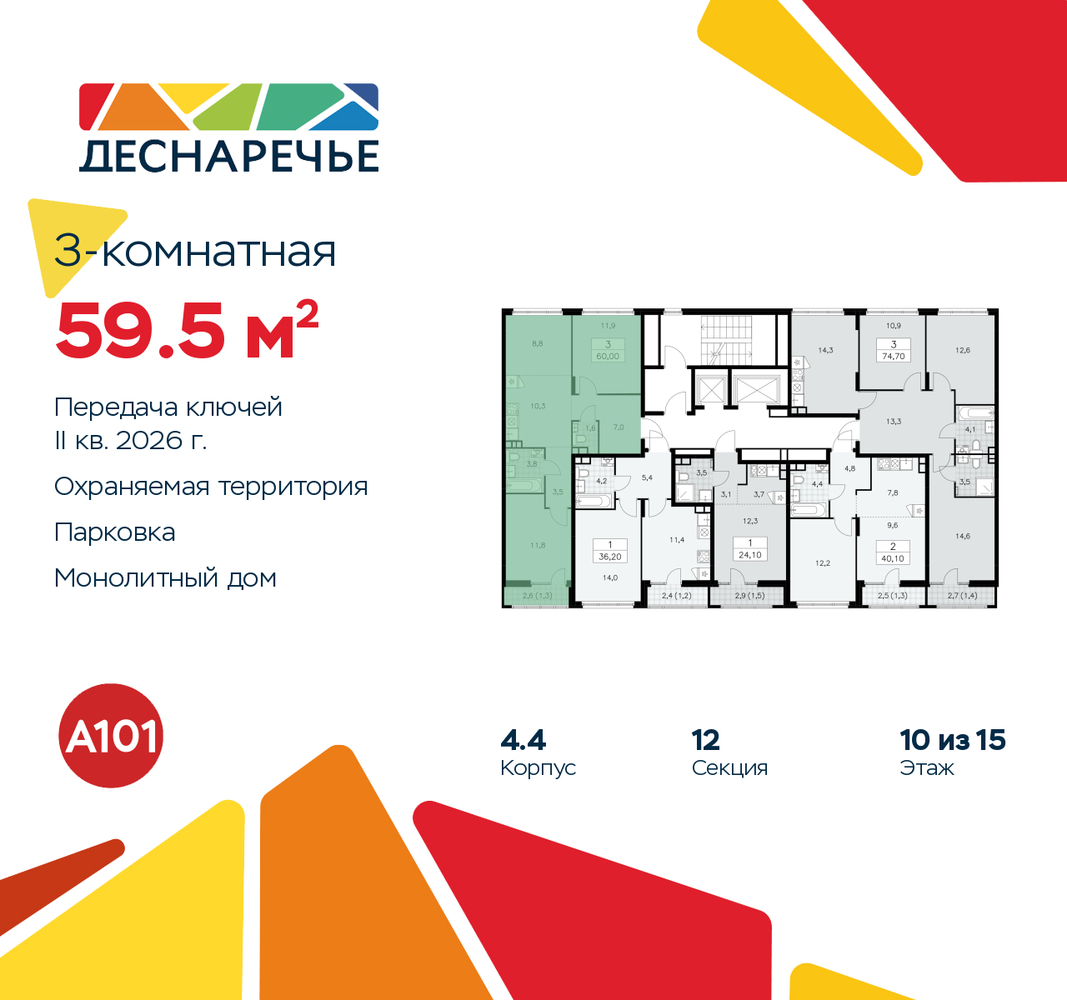 Продается трехкомнатная квартира с европланировкой и предчистовой отделкой в ЖК "Деснаречье" на 10 этаже. Общая площадь: 59.5 кв.м., жилая: 32.5 кв.м., общая площадь гостиной-столовой с кухонной зоной: 18.8 кв.м. Европланировка, кухня-гостиная - идеальный вариант для тех, кто любит часто принимать гостей. Квартира - распашонка, без проходных комнат, окна выходят на paзные стороны дома. В квартире один балкон, один совмещенный и один раздельный санузел. Высота потолков 2.99 м. Эта квартира будет сдана с предчистовой отделкой white box – это квартира с ровными белыми стенами. Такая отделка позволяет сразу приступить к чистовой отделке: выбрать цвета и материалы для стен и полов, купить и расставить мебель и оборудование, развесить светильники и подобрать декор. При желании вы можете дозаказать дизайнерскую отделку от застройщика, на ваш выбор представлено несколько вариантов стилистических решений. Дом монолитный, черырехподъездный, высотой 15 этажей. Квартира находится в 3-й секции в корпусе 4.4. На этаже 5 квартир. В подъезде 1 пассажирский и 1 грузовой лифт. Начало строительства - 3 квартал 2023 года. Окончание строительства - 2 квартал 2026 года. Оформление сделки по договору долевого участия. Артикул квартиры по базе застройщика 88К-4.4-935. ПРЕДЛОЖЕНИЯ ОТ ЗАСТРОЙЩИКА В ОКТЯБРЕ 2025: Ипотека от 13,9 % для всех! На весь срок. "Семейная ипотека" вернулась. Ставка от 3,5 % на весь срок! Без удорожания! Выгодное ипотечное комбо: Ипотека от 2200 р./мес. и от 6 % после рождения ребёнка! Ипотека для всех "Держи пять!" - ставка 5 % на 2 года! *более подробную информацию по скидкам и акциям уточняйте в отделе продаж Масштабный проект "Деснаречье" на юго-западе Москвы, который включает три новых района («квартала»), объединённые общей идеей – воплотить в реальность мечты современных жителей столицы об интересном, комфортном и разноплановом городском пространстве в окружении рек и лесов, словно сошедших с полотен русских живописцев: - «Берег» оценят все, кому близка водная стихия: плеск волн, солнечные блики и прогулки вдоль тихого течения речи. - «Лес» утопает в зелени парков и лесов. Здесь соблюдён идеальный баланс загородного спокойствия и столичного комфорта. - «Парк», самый энергичный и яркий, отличается высокой концентрацией пространств для спорта и творчества. Жилой комплекс "Деснаречье" расположится в 12 км от МКАД по современному Калужскому шоссе. Внешний облик зданий соответствует современному стилю и стандартам, характерным и для других популярных проектов ГК «А101»: сочетание контрастных тонов, большое количество остекления, в котором отражается небо, гармония с природным окружением. Весь город - в вашем районе. Находиться на территории «15-минутного города» значит иметь всё необходимое для полноценной жизни в шаговой доступности. Маршруты в районе «Деснаречье» выстроены так, чтобы добраться до магазинов, парков, школ, салонов услуг и других объектов можно было всего за несколько минут пешком или на велосипеде. Двор закрытый от машин – это тишина, комфорт и безопасность, поэтому все машино-места (включая «семейные» и увеличенные, с возможностью установки роллетных шкафов) находятся в подземном паркинге. В паркинги можно спуститься на лифте из любого подъезда или по лестнице. Рядом с «Деснаречьем» в 2027 году планируется открытие станции метро «Десна», до которой будет удобно