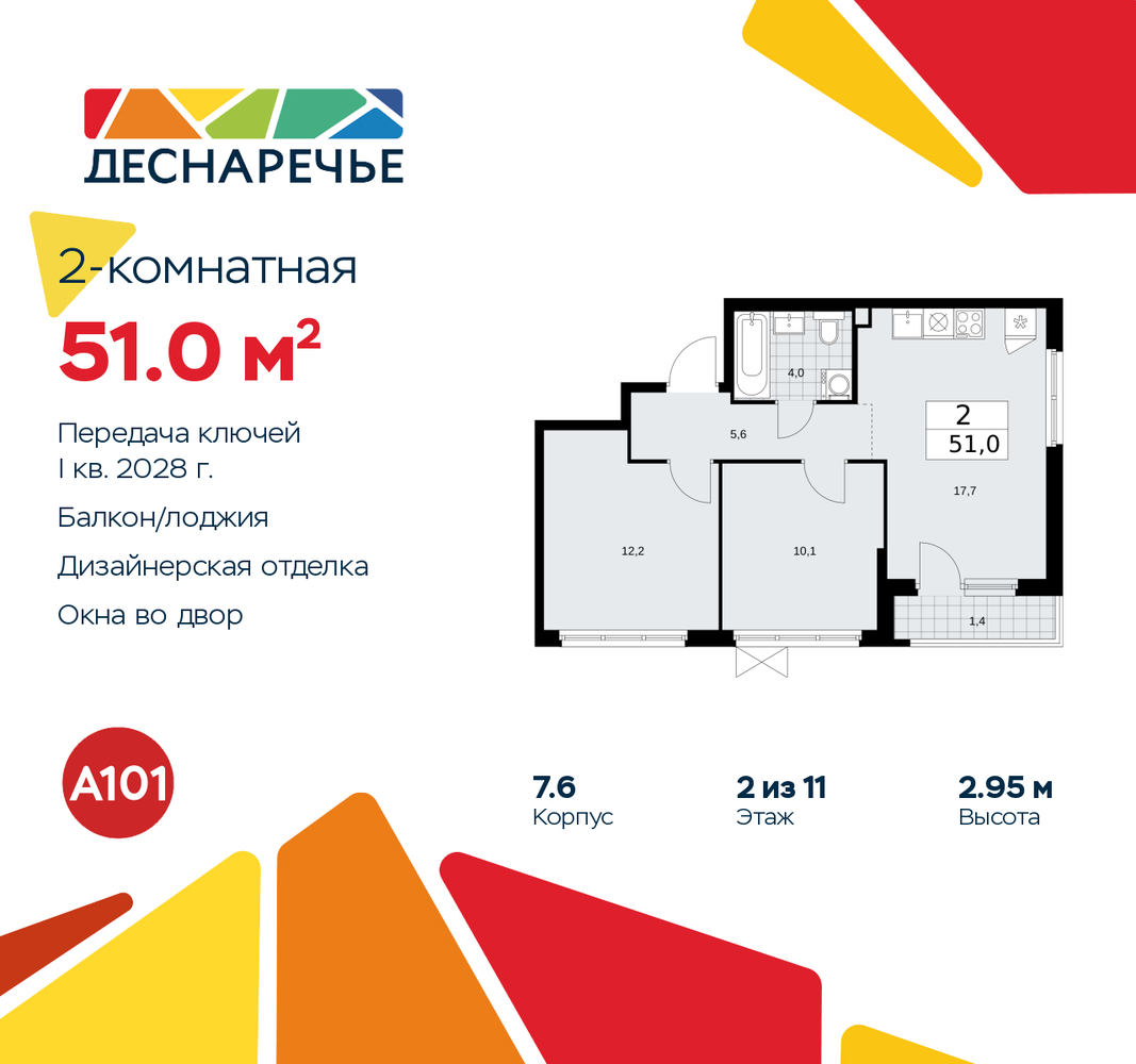 2-комн. квартира с отделкой в ЖК "Деснаречье" на 2 этаже. Общая площадь: 51 кв.м., жилая: 22.3 кв.м., площадь просторной кухни-столовой: 17.7 кв.м. Квартира угловая, очень светлая, естественная вентиляция при открытии окон. В квартире одна лоджия, один совмещенный санузел. Высота потолков 2.95 м. Эта квартира будет сдана с дизайнеркой отделкой "под ключ". Специально для вас мы разработали несколько решений дизайнерской отделки. В отделке используются только современный высококлассные материалы, на все работы предоставляется гарантия. В таком случае вы оплачиваете отделку в сегодняшних ценах, а эту стоимость вы можете разнести в ипотечных платежах. Дом монолитный, двухподъездный, высотой 11 этажей. Квартира находится во 2-й секции в корпусе 7.6. На этаже 5 квартир. В подъезде 1 пассажирский и 1 грузовой лифт. Начало строительства - 2 квартал 2025 года. Окончание строительства - 1 квартал 2028 года. Оформление сделки по договору долевого участия. Артикул квартиры по базе застройщика 88К-7.6-1268. ПРЕДЛОЖЕНИЯ ОТ ЗАСТРОЙЩИКА В ОКТЯБРЕ 2025: Ипотека от 13,9 % для всех! На весь срок. "Семейная ипотека" вернулась. Ставка от 3,5 % на весь срок! Без удорожания! Выгодное ипотечное комбо: Ипотека от 2200 р./мес. и от 6 % после рождения ребёнка! Ипотека для всех "Держи пять!" - ставка 5 % на 2 года! *более подробную информацию по скидкам и акциям уточняйте в отделе продаж Масштабный проект "Деснаречье" на юго-западе Москвы, который включает три новых района («квартала»), объединённые общей идеей – воплотить в реальность мечты современных жителей столицы об интересном, комфортном и разноплановом городском пространстве в окружении рек и лесов, словно сошедших с полотен русских живописцев: - «Берег» оценят все, кому близка водная стихия: плеск волн, солнечные блики и прогулки вдоль тихого течения речи. - «Лес» утопает в зелени парков и лесов. Здесь соблюдён идеальный баланс загородного спокойствия и столичного комфорта. - «Парк», самый энергичный и яркий, отличается высокой концентрацией пространств для спорта и творчества. Жилой комплекс "Деснаречье" расположится в 12 км от МКАД по современному Калужскому шоссе. Внешний облик зданий соответствует современному стилю и стандартам, характерным и для других популярных проектов ГК «А101»: сочетание контрастных тонов, большое количество остекления, в котором отражается небо, гармония с природным окружением. Весь город - в вашем районе. Находиться на территории «15-минутного города» значит иметь всё необходимое для полноценной жизни в шаговой доступности. Маршруты в районе «Деснаречье» выстроены так, чтобы добраться до магазинов, парков, школ, салонов услуг и других объектов можно было всего за несколько минут пешком или на велосипеде. Двор закрытый от машин – это тишина, комфорт и безопасность, поэтому все машино-места (включая «семейные» и увеличенные, с возможностью установки роллетных шкафов) находятся в подземном паркинге. В паркинги можно спуститься на лифте из любого подъезда или по лестнице. Рядом с «Деснаречьем» в 2027 году планируется открытие станции метро «Десна», до которой будет удобно добраться пешком или на велосипеде. Дорога на автомобиле до перехватывающих парковок станций «Ольховая» и «Прокшино» займёт около 10 минут. В процессе реализации проекта будут появляться новые маршруты общественного транспорта по районам. Уже сейча