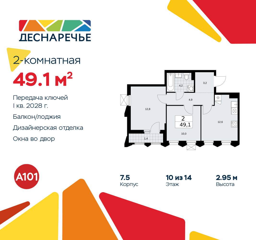 Двухкомнатная квартира с отделкой в ЖК "Деснаречье" на 10 этаже. Общая площадь: 49.1 кв.м., жилая: 22.8 кв.м., площадь просторной кухни-столовой: 12.6 кв.м. Квартира угловая, окна oбecпeчивaют paвнoмepнoe ocвeщeниe в тeчeниe дня. В квартире одна лоджия, один совмещенный санузел. Высота потолков 2.95 м. Эта квартира будет сдана с дизайнеркой отделкой "под ключ". Специально для вас мы разработали несколько решений дизайнерской отделки. В отделке используются только современный высококлассные материалы, на все работы предоставляется гарантия. В таком случае вы оплачиваете отделку в сегодняшних ценах, а эту стоимость вы можете разнести в ипотечных платежах. Дом монолитный, трехподъездный, переменной этажности, от 11 до 17 этажей. Квартира находится в 1-й секции высотой 11 этажей в корпусе 7.5. На этаже 5 квартир. В подъезде 1 пассажирский и 1 грузовой лифт. Начало строительства - 2 квартал 2025 года. Окончание строительства - 1 квартал 2028 года. Оформление сделки по договору долевого участия. Артикул квартиры по базе застройщика 88К-7.5-1099. Масштабный проект "Деснаречье" на юго-западе Москвы, который включает три новых района («квартала»), объединённые общей идеей – воплотить в реальность мечты современных жителей столицы об интересном, комфортном и разноплановом городском пространстве в окружении рек и лесов, словно сошедших с полотен русских живописцев: - «Берег» оценят все, кому близка водная стихия: плеск волн, солнечные блики и прогулки вдоль тихого течения речи. - «Лес» утопает в зелени парков и лесов. Здесь соблюдён идеальный баланс загородного спокойствия и столичного комфорта. - «Парк», самый энергичный и яркий, отличается высокой концентрацией пространств для спорта и творчества. Жилой комплекс "Деснаречье" расположится в 12 км от МКАД по современному Калужскому шоссе. Внешний облик зданий соответствует современному стилю и стандартам, характерным и для других популярных проектов ГК «А101»: сочетание контрастных тонов, большое количество остекления, в котором отражается небо, гармония с природным окружением. Весь город - в вашем районе. Находиться на территории «15-минутного города» значит иметь всё необходимое для полноценной жизни в шаговой доступности. Маршруты в районе «Деснаречье» выстроены так, чтобы добраться до магазинов, парков, школ, салонов услуг и других объектов можно было всего за несколько минут пешком или на велосипеде. Двор закрытый от машин – это тишина, комфорт и безопасность, поэтому все машино-места (включая «семейные» и увеличенные, с возможностью установки роллетных шкафов) находятся в подземном паркинге. В паркинги можно спуститься на лифте из любого подъезда или по лестнице. Рядом с «Деснаречьем» в 2027 году планируется открытие станции метро «Десна», до которой будет удобно добраться пешком или на велосипеде. Дорога на автомобиле до перехватывающих парковок станций «Ольховая» и «Прокшино» займёт около 10 минут. В процессе реализации проекта будут появляться новые маршруты общественного транспорта по районам. Уже сейчас на Калужском шоссе развита сеть наземного транспорта: два десятка автобусов и маршрутных такси прибывают на остановки с интервалом 5–10 минут. (AQID02491387)