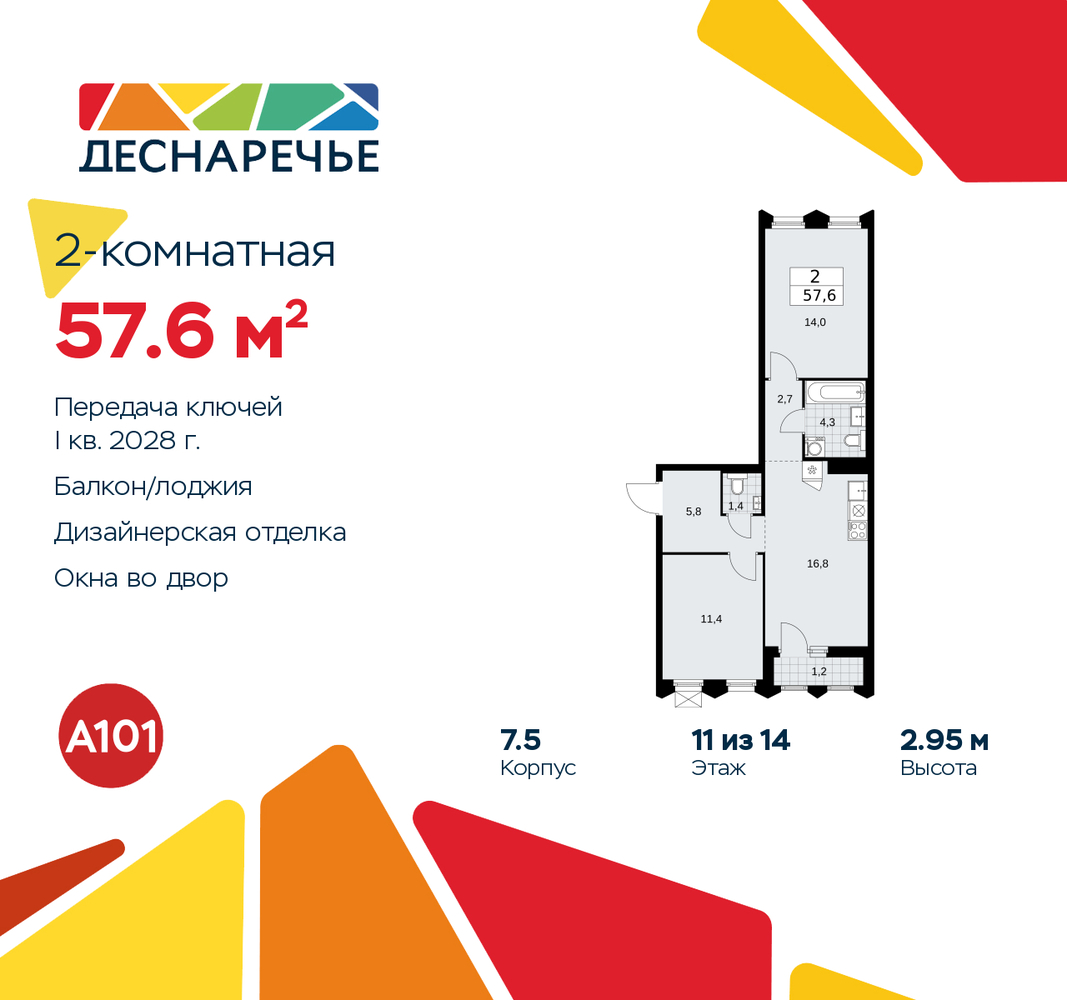 Просторная 2-комн. квартира с отделкой в ЖК "Деснаречье" на 11 этаже. Общая площадь: 57.6 кв.м., жилая: 25.4 кв.м., площадь просторной кухни-столовой: 16.8 кв.м. Квартира - распашонка, без проходных комнат, окна выходят на paзные стороны дома. В квартире одна лоджия, один совмещенный и один раздельный санузел. Высота потолков 2.95 м. Эта квартира будет сдана с дизайнеркой отделкой "под ключ". Специально для вас мы разработали несколько решений дизайнерской отделки. В отделке используются только современный высококлассные материалы, на все работы предоставляется гарантия. В таком случае вы оплачиваете отделку в сегодняшних ценах, а эту стоимость вы можете разнести в ипотечных платежах. Дом монолитный, трехподъездный, переменной этажности, от 11 до 17 этажей. Квартира находится в 1-й секции высотой 11 этажей в корпусе 7.5. На этаже 5 квартир. В подъезде 1 пассажирский и 1 грузовой лифт. Начало строительства - 2 квартал 2025 года. Окончание строительства - 1 квартал 2028 года. Оформление сделки по договору долевого участия. Артикул квартиры по базе застройщика 88К-7.5-1108. Масштабный проект "Деснаречье" на юго-западе Москвы, который включает три новых района («квартала»), объединённые общей идеей – воплотить в реальность мечты современных жителей столицы об интересном, комфортном и разноплановом городском пространстве в окружении рек и лесов, словно сошедших с полотен русских живописцев: - «Берег» оценят все, кому близка водная стихия: плеск волн, солнечные блики и прогулки вдоль тихого течения речи. - «Лес» утопает в зелени парков и лесов. Здесь соблюдён идеальный баланс загородного спокойствия и столичного комфорта. - «Парк», самый энергичный и яркий, отличается высокой концентрацией пространств для спорта и творчества. Жилой комплекс "Деснаречье" расположится в 12 км от МКАД по современному Калужскому шоссе. Внешний облик зданий соответствует современному стилю и стандартам, характерным и для других популярных проектов ГК «А101»: сочетание контрастных тонов, большое количество остекления, в котором отражается небо, гармония с природным окружением. Весь город - в вашем районе. Находиться на территории «15-минутного города» значит иметь всё необходимое для полноценной жизни в шаговой доступности. Маршруты в районе «Деснаречье» выстроены так, чтобы добраться до магазинов, парков, школ, салонов услуг и других объектов можно было всего за несколько минут пешком или на велосипеде. Двор закрытый от машин – это тишина, комфорт и безопасность, поэтому все машино-места (включая «семейные» и увеличенные, с возможностью установки роллетных шкафов) находятся в подземном паркинге. В паркинги можно спуститься на лифте из любого подъезда или по лестнице. Рядом с «Деснаречьем» в 2027 году планируется открытие станции метро «Десна», до которой будет удобно добраться пешком или на велосипеде. Дорога на автомобиле до перехватывающих парковок станций «Ольховая» и «Прокшино» займёт около 10 минут. В процессе реализации проекта будут появляться новые маршруты общественного транспорта по районам. Уже сейчас на Калужском шоссе развита сеть наземного транспорта: два десятка автобусов и маршрутных такси прибывают на остановки с интервалом 5–10 минут. (AQID02491396)