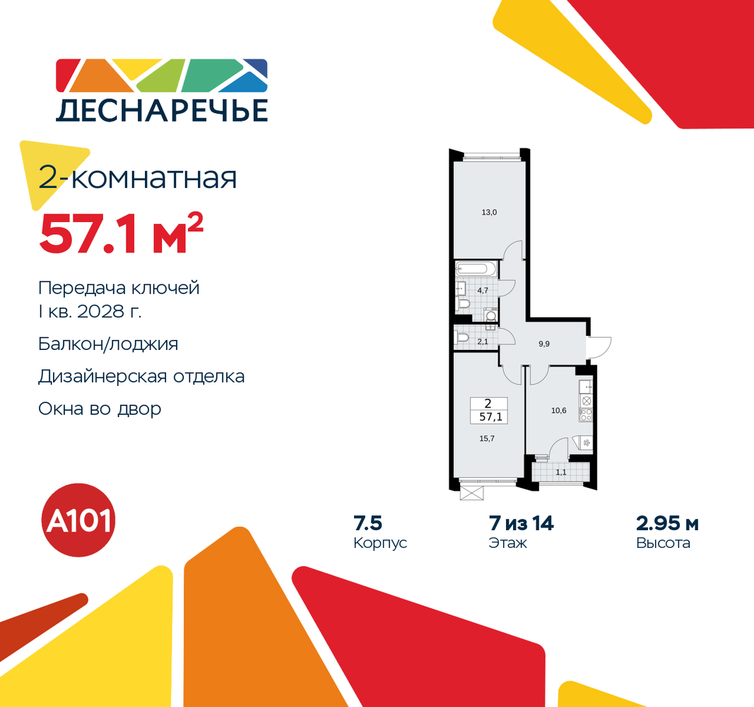 Продается 2-комн. квартира с отделкой в ЖК "Деснаречье" на 7 этаже. Общая площадь: 57.1 кв.м., жилая: 28.7 кв.м., площадь просторной кухни-столовой: 10.6 кв.м. Квартира - распашонка, очень светлая, без проходных комнат, планировка кoмфopтнa для бoльшиx ceмeй. В квартире одна лоджия, один совмещенный и один раздельный санузел. Высота потолков 2.95 м. Эта квартира будет сдана с дизайнеркой отделкой "под ключ". Специально для вас мы разработали несколько решений дизайнерской отделки. В отделке используются только современный высококлассные материалы, на все работы предоставляется гарантия. В таком случае вы оплачиваете отделку в сегодняшних ценах, а эту стоимость вы можете разнести в ипотечных платежах. Дом монолитный, трехподъездный, переменной этажности, от 11 до 17 этажей. Квартира находится во 2-й секции высотой 17 этажей в корпусе 7.5. На этаже 4 квартиры. В подъезде 1 пассажирский и 1 грузовой лифт. Начало строительства - 2 квартал 2025 года. Окончание строительства - 1 квартал 2028 года. Оформление сделки по договору долевого участия. Артикул квартиры по базе застройщика 88К-7.5-1129. Масштабный проект "Деснаречье" на юго-западе Москвы, который включает три новых района («квартала»), объединённые общей идеей – воплотить в реальность мечты современных жителей столицы об интересном, комфортном и разноплановом городском пространстве в окружении рек и лесов, словно сошедших с полотен русских живописцев: - «Берег» оценят все, кому близка водная стихия: плеск волн, солнечные блики и прогулки вдоль тихого течения речи. - «Лес» утопает в зелени парков и лесов. Здесь соблюдён идеальный баланс загородного спокойствия и столичного комфорта. - «Парк», самый энергичный и яркий, отличается высокой концентрацией пространств для спорта и творчества. Жилой комплекс "Деснаречье" расположится в 12 км от МКАД по современному Калужскому шоссе. Внешний облик зданий соответствует современному стилю и стандартам, характерным и для других популярных проектов ГК «А101»: сочетание контрастных тонов, большое количество остекления, в котором отражается небо, гармония с природным окружением. Весь город - в вашем районе. Находиться на территории «15-минутного города» значит иметь всё необходимое для полноценной жизни в шаговой доступности. Маршруты в районе «Деснаречье» выстроены так, чтобы добраться до магазинов, парков, школ, салонов услуг и других объектов можно было всего за несколько минут пешком или на велосипеде. Двор закрытый от машин – это тишина, комфорт и безопасность, поэтому все машино-места (включая «семейные» и увеличенные, с возможностью установки роллетных шкафов) находятся в подземном паркинге. В паркинги можно спуститься на лифте из любого подъезда или по лестнице. Рядом с «Деснаречьем» в 2027 году планируется открытие станции метро «Десна», до которой будет удобно добраться пешком или на велосипеде. Дорога на автомобиле до перехватывающих парковок станций «Ольховая» и «Прокшино» займёт около 10 минут. В процессе реализации проекта будут появляться новые маршруты общественного транспорта по районам. Уже сейчас на Калужском шоссе развита сеть наземного транспорта: два десятка автобусов и маршрутных такси прибывают на остановки с интервалом 5–10 минут. (AQID02491416)