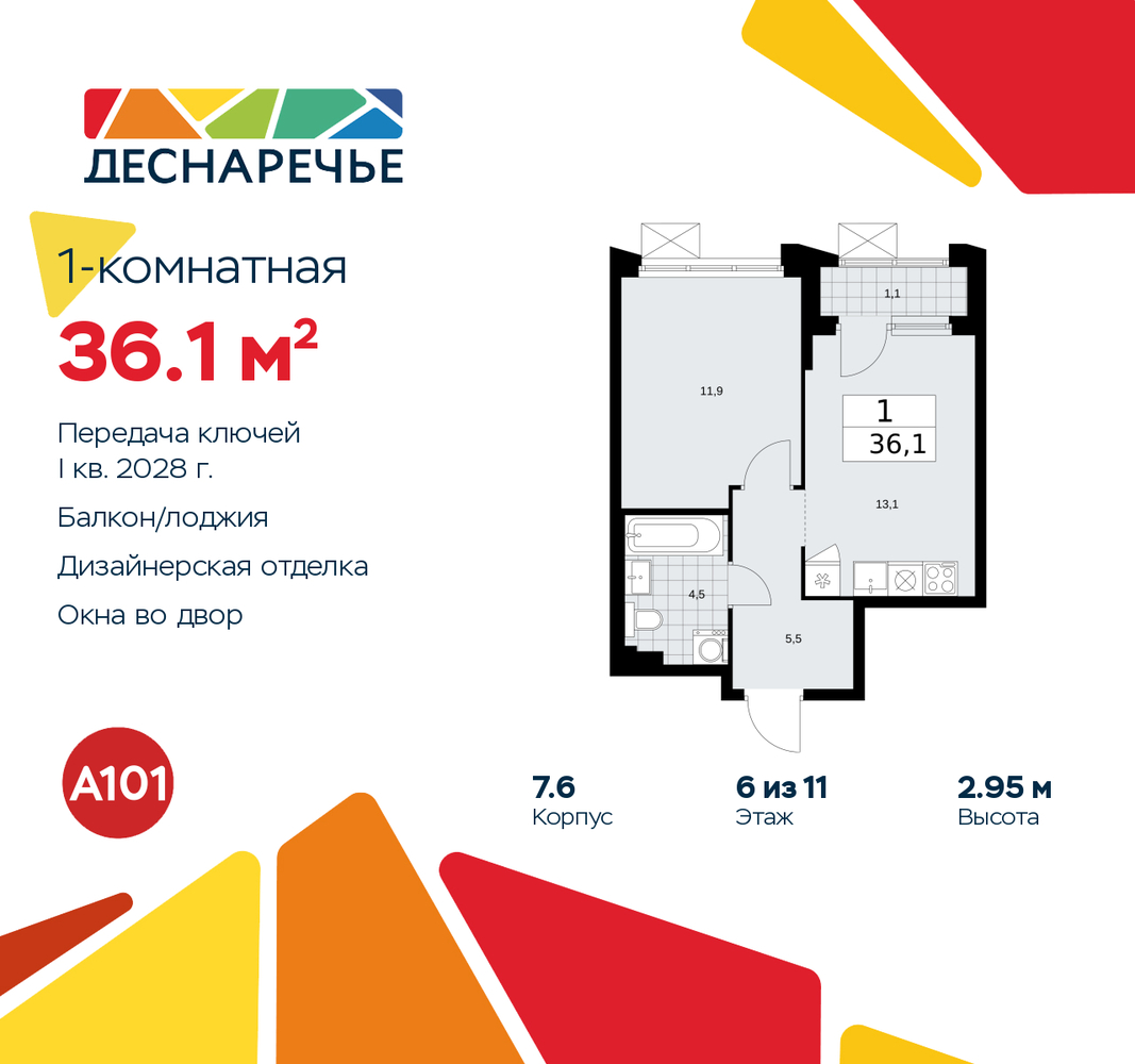 1-комн. квартира с отделкой в ЖК "Деснаречье" на 6 этаже. Общая площадь: 36.1 кв.м., жилая: 11.9 кв.м., площадь просторной кухни-столовой: 13.1 кв.м. Все окна выходят на одну сторону. В квартире одна лоджия, один совмещенный санузел. Высота потолков 2.95 м. Эта квартира будет сдана с дизайнеркой отделкой "под ключ". Специально для вас мы разработали несколько решений дизайнерской отделки. В отделке используются только современный высококлассные материалы, на все работы предоставляется гарантия. В таком случае вы оплачиваете отделку в сегодняшних ценах, а эту стоимость вы можете разнести в ипотечных платежах. Дом монолитный, двухподъездный, высотой 11 этажей. Квартира находится во 2-й секции в корпусе 7.6. На этаже 5 квартир. В подъезде 1 пассажирский и 1 грузовой лифт. Начало строительства - 2 квартал 2025 года. Окончание строительства - 1 квартал 2028 года. Оформление сделки по договору долевого участия. Артикул квартиры по базе застройщика 88К-7.6-1286. ПРЕДЛОЖЕНИЯ ОТ ЗАСТРОЙЩИКА В ОКТЯБРЕ 2025: Ипотека от 13,9 % для всех! На весь срок. "Семейная ипотека" вернулась. Ставка от 3,5 % на весь срок! Без удорожания! Выгодное ипотечное комбо: Ипотека от 2200 р./мес. и от 6 % после рождения ребёнка! Ипотека для всех "Держи пять!" - ставка 5 % на 2 года! *более подробную информацию по скидкам и акциям уточняйте в отделе продаж Масштабный проект "Деснаречье" на юго-западе Москвы, который включает три новых района («квартала»), объединённые общей идеей – воплотить в реальность мечты современных жителей столицы об интересном, комфортном и разноплановом городском пространстве в окружении рек и лесов, словно сошедших с полотен русских живописцев: - «Берег» оценят все, кому близка водная стихия: плеск волн, солнечные блики и прогулки вдоль тихого течения речи. - «Лес» утопает в зелени парков и лесов. Здесь соблюдён идеальный баланс загородного спокойствия и столичного комфорта. - «Парк», самый энергичный и яркий, отличается высокой концентрацией пространств для спорта и творчества. Жилой комплекс "Деснаречье" расположится в 12 км от МКАД по современному Калужскому шоссе. Внешний облик зданий соответствует современному стилю и стандартам, характерным и для других популярных проектов ГК «А101»: сочетание контрастных тонов, большое количество остекления, в котором отражается небо, гармония с природным окружением. Весь город - в вашем районе. Находиться на территории «15-минутного города» значит иметь всё необходимое для полноценной жизни в шаговой доступности. Маршруты в районе «Деснаречье» выстроены так, чтобы добраться до магазинов, парков, школ, салонов услуг и других объектов можно было всего за несколько минут пешком или на велосипеде. Двор закрытый от машин – это тишина, комфорт и безопасность, поэтому все машино-места (включая «семейные» и увеличенные, с возможностью установки роллетных шкафов) находятся в подземном паркинге. В паркинги можно спуститься на лифте из любого подъезда или по лестнице. Рядом с «Деснаречьем» в 2027 году планируется открытие станции метро «Десна», до которой будет удобно добраться пешком или на велосипеде. Дорога на автомобиле до перехватывающих парковок станций «Ольховая» и «Прокшино» займёт около 10 минут. В процессе реализации проекта будут появляться новые маршруты общественного транспорта по районам. Уже сейчас на Калужском шоссе развита сеть наземно