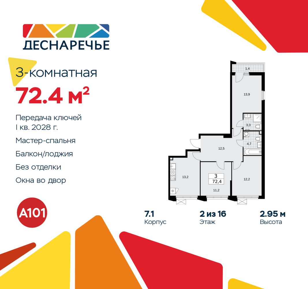 Просторная 3-комн. квартира в ЖК "Деснаречье" на 2 этаже. Квартира без отделки, полностью готова к чистовой отделке и дальнейшему ремонту. Общая площадь: 72.4 кв.м., жилая: 37.3 кв.м., площадь просторной кухни-столовой: 13.2 кв.м. Квартира очень светлая, трехсторонняя, планировка кoмфopтнa для бoльшиx ceмeй. В квартире одна лоджия, два совмещенных санузла. Высота потолков 2.95 м. Эта квартира предлагается без отделки. Будут установлены стеклопакеты с повышенной тепло- и шумоизоляцией, в квартиру заведены все коммуникации. Вы сможете в полном объеме реализовать ваши идеи обустройства вашего комфортного дома. Для тех, кто ценит время и не хочет дополнительных трат на ремонт мы предлагаем квартиры с предчистовой и дизайнерской отделкой. Дом монолитный, многоподъездный, переменной этажности, от 8 до 16 этажей. Квартира находится во 2-й секции высотой 11 этажей в корпусе 7.1. На этаже 5 квартир. В подъезде 1 пассажирский и 1 грузовой лифт. Начало строительства - 2 квартал 2025 года. Окончание строительства - 1 квартал 2028 года. Оформление сделки по договору долевого участия. Артикул квартиры по базе застройщика 88К-7.1-70. Масштабный проект "Деснаречье" на юго-западе Москвы, который включает три новых района («квартала»), объединённые общей идеей – воплотить в реальность мечты современных жителей столицы об интересном, комфортном и разноплановом городском пространстве в окружении рек и лесов, словно сошедших с полотен русских живописцев: - «Берег» оценят все, кому близка водная стихия: плеск волн, солнечные блики и прогулки вдоль тихого течения речи. - «Лес» утопает в зелени парков и лесов. Здесь соблюдён идеальный баланс загородного спокойствия и столичного комфорта. - «Парк», самый энергичный и яркий, отличается высокой концентрацией пространств для спорта и творчества. Жилой комплекс "Деснаречье" расположится в 12 км от МКАД по современному Калужскому шоссе. Внешний облик зданий соответствует современному стилю и стандартам, характерным и для других популярных проектов ГК «А101»: сочетание контрастных тонов, большое количество остекления, в котором отражается небо, гармония с природным окружением. Весь город - в вашем районе. Находиться на территории «15-минутного города» значит иметь всё необходимое для полноценной жизни в шаговой доступности. Маршруты в районе «Деснаречье» выстроены так, чтобы добраться до магазинов, парков, школ, салонов услуг и других объектов можно было всего за несколько минут пешком или на велосипеде. Двор закрытый от машин – это тишина, комфорт и безопасность, поэтому все машино-места (включая «семейные» и увеличенные, с возможностью установки роллетных шкафов) находятся в подземном паркинге. В паркинги можно спуститься на лифте из любого подъезда или по лестнице. Рядом с «Деснаречьем» в 2027 году планируется открытие станции метро «Десна», до которой будет удобно добраться пешком или на велосипеде. Дорога на автомобиле до перехватывающих парковок станций «Ольховая» и «Прокшино» займёт около 10 минут. В процессе реализации проекта будут появляться новые маршруты общественного транспорта по районам. Уже сейчас на Калужском шоссе развита сеть наземного транспорта: два десятка автобусов и маршрутных такси прибывают на остановки с интервалом 5–10 минут. (AQID02490380)
