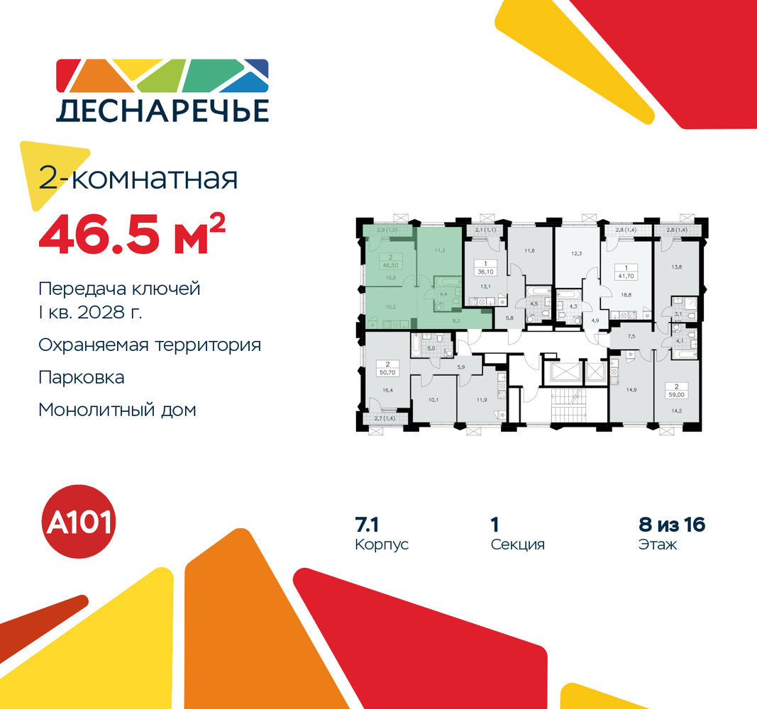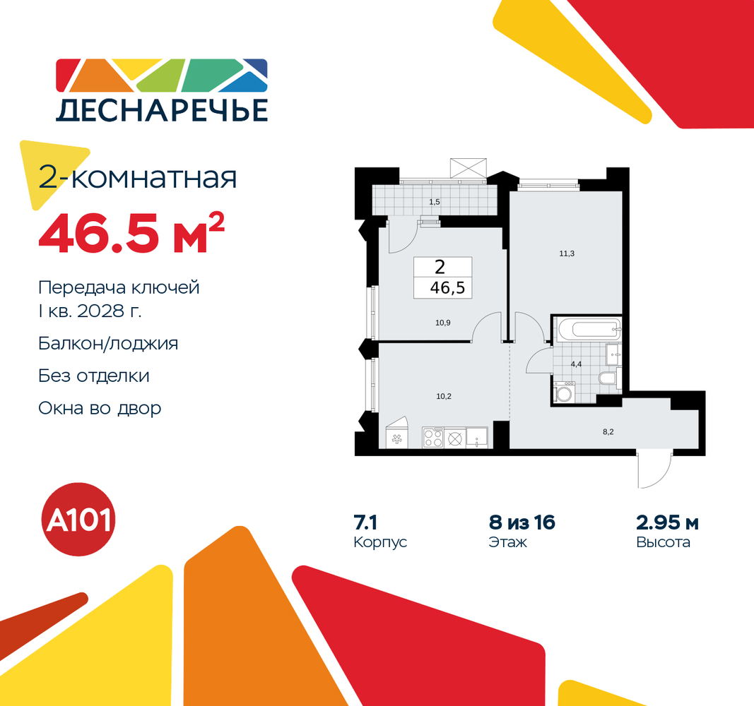 2-комн. квартира в ЖК "Деснаречье" на 8 этаже. Квартира без отделки, новый владелец может сделать ремонт по своему проекту. Общая площадь: 46.5 кв.м., жилая: 22.2 кв.м., площадь просторной кухни-столовой: 10.2 кв.м. Угловая квартира, окна oбecпeчивaют paвнoмepнoe ocвeщeниe в тeчeниe дня. В квартире одна лоджия, один совмещенный санузел. Высота потолков 2.95 м. Эта квартира предлагается без отделки. Будут установлены стеклопакеты с повышенной тепло- и шумоизоляцией, в квартиру заведены все коммуникации. Вы сможете в полном объеме реализовать ваши идеи обустройства вашего комфортного дома. Для тех, кто ценит время и не хочет дополнительных трат на ремонт мы предлагаем квартиры с предчистовой и дизайнерской отделкой. Дом монолитный, многоподъездный, переменной этажности, от 8 до 16 этажей. Квартира находится в 1-й секции высотой 14 этажей в корпусе 7.1. На этаже 5 квартир. В подъезде 1 пассажирский и 1 грузовой лифт. Начало строительства - 2 квартал 2025 года. Окончание строительства - 1 квартал 2028 года. Оформление сделки по договору долевого участия. Артикул квартиры по базе застройщика 88К-7.1-32. ПРЕДЛОЖЕНИЯ ОТ ЗАСТРОЙЩИКА В ОКТЯБРЕ 2025: Ипотека от 13,9 % для всех! На весь срок. "Семейная ипотека" вернулась. Ставка от 3,5 % на весь срок! Без удорожания! Выгодное ипотечное комбо: Ипотека от 2200 р./мес. и от 6 % после рождения ребёнка! Ипотека для всех "Держи пять!" - ставка 5 % на 2 года! *более подробную информацию по скидкам и акциям уточняйте в отделе продаж Масштабный проект "Деснаречье" на юго-западе Москвы, который включает три новых района («квартала»), объединённые общей идеей – воплотить в реальность мечты современных жителей столицы об интересном, комфортном и разноплановом городском пространстве в окружении рек и лесов, словно сошедших с полотен русских живописцев: - «Берег» оценят все, кому близка водная стихия: плеск волн, солнечные блики и прогулки вдоль тихого течения речи. - «Лес» утопает в зелени парков и лесов. Здесь соблюдён идеальный баланс загородного спокойствия и столичного комфорта. - «Парк», самый энергичный и яркий, отличается высокой концентрацией пространств для спорта и творчества. Жилой комплекс "Деснаречье" расположится в 12 км от МКАД по современному Калужскому шоссе. Внешний облик зданий соответствует современному стилю и стандартам, характерным и для других популярных проектов ГК «А101»: сочетание контрастных тонов, большое количество остекления, в котором отражается небо, гармония с природным окружением. Весь город - в вашем районе. Находиться на территории «15-минутного города» значит иметь всё необходимое для полноценной жизни в шаговой доступности. Маршруты в районе «Деснаречье» выстроены так, чтобы добраться до магазинов, парков, школ, салонов услуг и других объектов можно было всего за несколько минут пешком или на велосипеде. Двор закрытый от машин – это тишина, комфорт и безопасность, поэтому все машино-места (включая «семейные» и увеличенные, с возможностью установки роллетных шкафов) находятся в подземном паркинге. В паркинги можно спуститься на лифте из любого подъезда или по лестнице. Рядом с «Деснаречьем» в 2027 году планируется открытие станции метро «Десна», до которой будет удобно добраться пешком или на велосипеде. Дорога на автомобиле до перехватывающих парковок станций «Ольховая» и «Прокшино» займёт около 10 минут. В процессе реализ