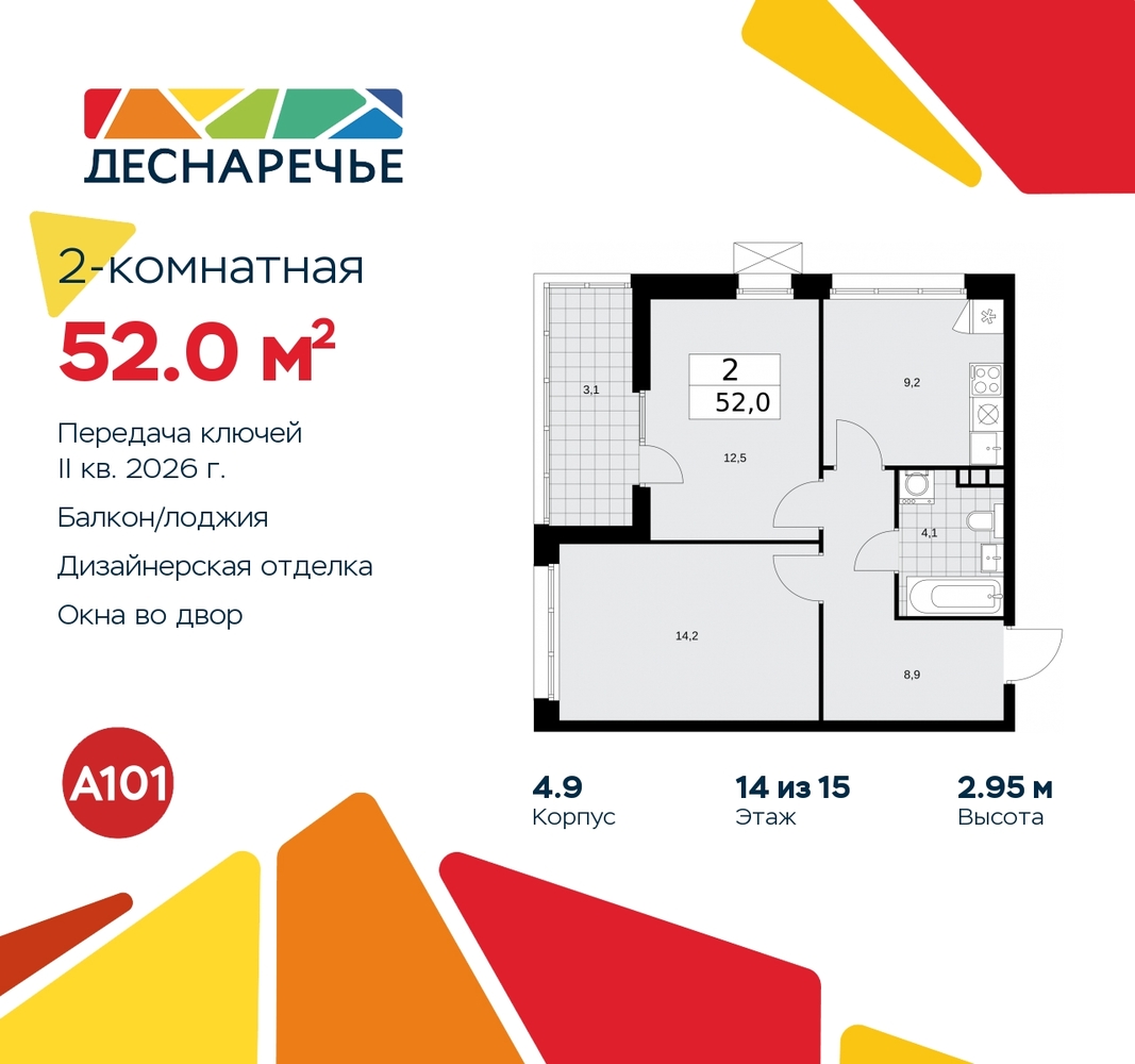 Двухкомнатная квартира с отделкой в ЖК "Деснаречье" на 14 этаже. Общая площадь: 51.8 кв.м. Высота потолков 2.95 м. Эта квартира будет сдана с дизайнеркой отделкой "под ключ". Специально для вас мы разработали несколько решений дизайнерской отделки. В отделке используются только современный высококлассные материалы, на все работы предоставляется гарантия. В таком случае вы оплачиваете отделку в сегодняшних ценах, а эту стоимость вы можете разнести в ипотечных платежах. Квартира находится в корпусе 4.9. Дом монолитный, одноподъездный, высотой 15 этажей. На этаже 10 квартир. В подъезде 1 пассажирский и 1 грузовой лифт. Начало строительства - 3 квартал 2023 года. Окончание строительства - 2 квартал 2026 года. Оформление сделки по договору долевого участия. Артикул квартиры по базе застройщика 88К-4.9-2140. Масштабный проект "Деснаречье" на юго-западе Москвы, который включает три новых района («квартала»), объединённые общей идеей – воплотить в реальность мечты современных жителей столицы об интересном, комфортном и разноплановом городском пространстве в окружении рек и лесов, словно сошедших с полотен русских живописцев: - «Берег» оценят все, кому близка водная стихия: плеск волн, солнечные блики и прогулки вдоль тихого течения речи. - «Лес» утопает в зелени парков и лесов. Здесь соблюдён идеальный баланс загородного спокойствия и столичного комфорта. - «Парк», самый энергичный и яркий, отличается высокой концентрацией пространств для спорта и творчества. Жилой комплекс "Деснаречье" расположится в 12 км от МКАД по современному Калужскому шоссе. Внешний облик зданий соответствует современному стилю и стандартам, характерным и для других популярных проектов ГК «А101»: сочетание контрастных тонов, большое количество остекления, в котором отражается небо, гармония с природным окружением. Весь город - в вашем районе. Находиться на территории «15-минутного города» значит иметь всё необходимое для полноценной жизни в шаговой доступности. Маршруты в районе «Деснаречье» выстроены так, чтобы добраться до магазинов, парков, школ, салонов услуг и других объектов можно было всего за несколько минут пешком или на велосипеде. Двор закрытый от машин – это тишина, комфорт и безопасность, поэтому все машино-места (включая «семейные» и увеличенные, с возможностью установки роллетных шкафов) находятся в подземном паркинге. В паркинги можно спуститься на лифте из любого подъезда или по лестнице. Рядом с «Деснаречьем» в 2027 году планируется открытие станции метро «Десна», до которой будет удобно добраться пешком или на велосипеде. Дорога на автомобиле до перехватывающих парковок станций «Ольховая» и «Прокшино» займёт около 10 минут. В процессе реализации проекта будут появляться новые маршруты общественного транспорта по районам. Уже сейчас на Калужском шоссе развита сеть наземного транспорта: два десятка автобусов и маршрутных такси прибывают на остановки с интервалом 5–10 минут. (AQID02553372)