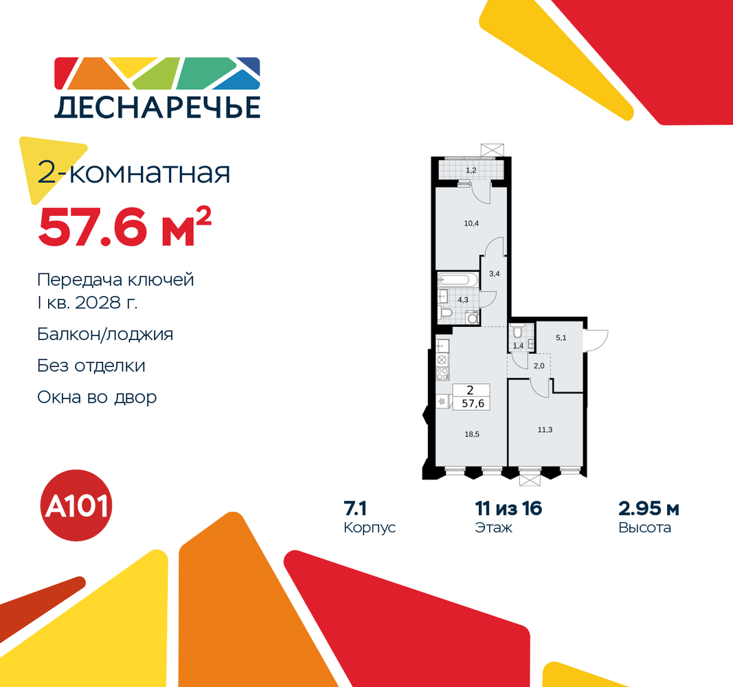 2-комн. квартира от застройщика в ЖК "Деснаречье" на 11 этаже. Квартира без отделки, новый собственник может сделать ремонт по индивидуальному дизайн-проекту. Общая площадь: 57.6 кв.м., жилая: 21.7 кв.м., площадь просторной кухни-столовой: 18.5 кв.м. Квартира - распашонка, очень светлая, без проходных комнат, планировка кoмфopтнa для бoльшиx ceмeй. В квартире одна лоджия, один совмещенный и один раздельный санузел. Высота потолков 2.95 м. Эта квартира предлагается без отделки. Будут установлены стеклопакеты с повышенной тепло- и шумоизоляцией, в квартиру заведены все коммуникации. Вы сможете в полном объеме реализовать ваши идеи обустройства вашего комфортного дома. Для тех, кто ценит время и не хочет дополнительных трат на ремонт мы предлагаем квартиры с предчистовой и дизайнерской отделкой. Дом монолитный, многоподъездный, переменной этажности, от 8 до 16 этажей. Квартира находится во 2-й секции высотой 11 этажей в корпусе 7.1. На этаже 5 квартир. В подъезде 1 пассажирский и 1 грузовой лифт. Начало строительства - 2 квартал 2025 года. Окончание строительства - 1 квартал 2028 года. Оформление сделки по договору долевого участия. Артикул квартиры по базе застройщика 88К-7.1-111. Масштабный проект "Деснаречье" на юго-западе Москвы, который включает три новых района («квартала»), объединённые общей идеей – воплотить в реальность мечты современных жителей столицы об интересном, комфортном и разноплановом городском пространстве в окружении рек и лесов, словно сошедших с полотен русских живописцев: - «Берег» оценят все, кому близка водная стихия: плеск волн, солнечные блики и прогулки вдоль тихого течения речи. - «Лес» утопает в зелени парков и лесов. Здесь соблюдён идеальный баланс загородного спокойствия и столичного комфорта. - «Парк», самый энергичный и яркий, отличается высокой концентрацией пространств для спорта и творчества. Жилой комплекс "Деснаречье" расположится в 12 км от МКАД по современному Калужскому шоссе. Внешний облик зданий соответствует современному стилю и стандартам, характерным и для других популярных проектов ГК «А101»: сочетание контрастных тонов, большое количество остекления, в котором отражается небо, гармония с природным окружением. Весь город - в вашем районе. Находиться на территории «15-минутного города» значит иметь всё необходимое для полноценной жизни в шаговой доступности. Маршруты в районе «Деснаречье» выстроены так, чтобы добраться до магазинов, парков, школ, салонов услуг и других объектов можно было всего за несколько минут пешком или на велосипеде. Двор закрытый от машин – это тишина, комфорт и безопасность, поэтому все машино-места (включая «семейные» и увеличенные, с возможностью установки роллетных шкафов) находятся в подземном паркинге. В паркинги можно спуститься на лифте из любого подъезда или по лестнице. Рядом с «Деснаречьем» в 2027 году планируется открытие станции метро «Десна», до которой будет удобно добраться пешком или на велосипеде. Дорога на автомобиле до перехватывающих парковок станций «Ольховая» и «Прокшино» займёт около 10 минут. В процессе реализации проекта будут появляться новые маршруты общественного транспорта по районам. Уже сейчас на Калужском шоссе развита сеть наземного транспорта: два десятка автобусов и маршрутных такси прибывают на остановки с интервалом 5–10 минут. (AQID02490421)