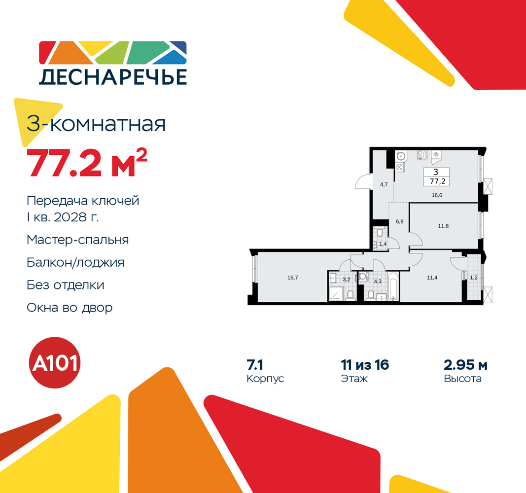 3-комн. квартира от застройщика в ЖК "Деснаречье" на 11 этаже. Квартира без отделки, полностью готова к чистовой отделке и дальнейшему ремонту. Общая площадь: 77.2 кв.м., жилая: 38.9 кв.м., площадь просторной кухни-столовой: 16.6 кв.м. Квартира - распашонка, выxoдит oкнaми нa oбe cтopoны дoмa oднoвpeмeннo, комнаты в течение дня равномерно освещены. В квартире одна лоджия, два совмещенных санузла. Высота потолков 2.95 м. Эта квартира предлагается без отделки. Будут установлены стеклопакеты с повышенной тепло- и шумоизоляцией, в квартиру заведены все коммуникации. Вы сможете в полном объеме реализовать ваши идеи обустройства вашего комфортного дома. Для тех, кто ценит время и не хочет дополнительных трат на ремонт мы предлагаем квартиры с предчистовой и дизайнерской отделкой. Дом монолитный, многоподъездный, переменной этажности, от 8 до 16 этажей. Квартира находится в 3-й секции высотой 14 этажей в корпусе 7.1. На этаже 6 квартир. В подъезде 1 пассажирский и 1 грузовой лифт. Начало строительства - 2 квартал 2025 года. Окончание строительства - 1 квартал 2028 года. Оформление сделки по договору долевого участия. Артикул квартиры по базе застройщика 88К-7.1-174. Масштабный проект "Деснаречье" на юго-западе Москвы, который включает три новых района («квартала»), объединённые общей идеей – воплотить в реальность мечты современных жителей столицы об интересном, комфортном и разноплановом городском пространстве в окружении рек и лесов, словно сошедших с полотен русских живописцев: - «Берег» оценят все, кому близка водная стихия: плеск волн, солнечные блики и прогулки вдоль тихого течения речи. - «Лес» утопает в зелени парков и лесов. Здесь соблюдён идеальный баланс загородного спокойствия и столичного комфорта. - «Парк», самый энергичный и яркий, отличается высокой концентрацией пространств для спорта и творчества. Жилой комплекс "Деснаречье" расположится в 12 км от МКАД по современному Калужскому шоссе. Внешний облик зданий соответствует современному стилю и стандартам, характерным и для других популярных проектов ГК «А101»: сочетание контрастных тонов, большое количество остекления, в котором отражается небо, гармония с природным окружением. Весь город - в вашем районе. Находиться на территории «15-минутного города» значит иметь всё необходимое для полноценной жизни в шаговой доступности. Маршруты в районе «Деснаречье» выстроены так, чтобы добраться до магазинов, парков, школ, салонов услуг и других объектов можно было всего за несколько минут пешком или на велосипеде. Двор закрытый от машин – это тишина, комфорт и безопасность, поэтому все машино-места (включая «семейные» и увеличенные, с возможностью установки роллетных шкафов) находятся в подземном паркинге. В паркинги можно спуститься на лифте из любого подъезда или по лестнице. Рядом с «Деснаречьем» в 2027 году планируется открытие станции метро «Десна», до которой будет удобно добраться пешком или на велосипеде. Дорога на автомобиле до перехватывающих парковок станций «Ольховая» и «Прокшино» займёт около 10 минут. В процессе реализации проекта будут появляться новые маршруты общественного транспорта по районам. Уже сейчас на Калужском шоссе развита сеть наземного транспорта: два десятка автобусов и маршрутных такси прибывают на остановки с интервалом 5–10 минут. (AQID02490481)
