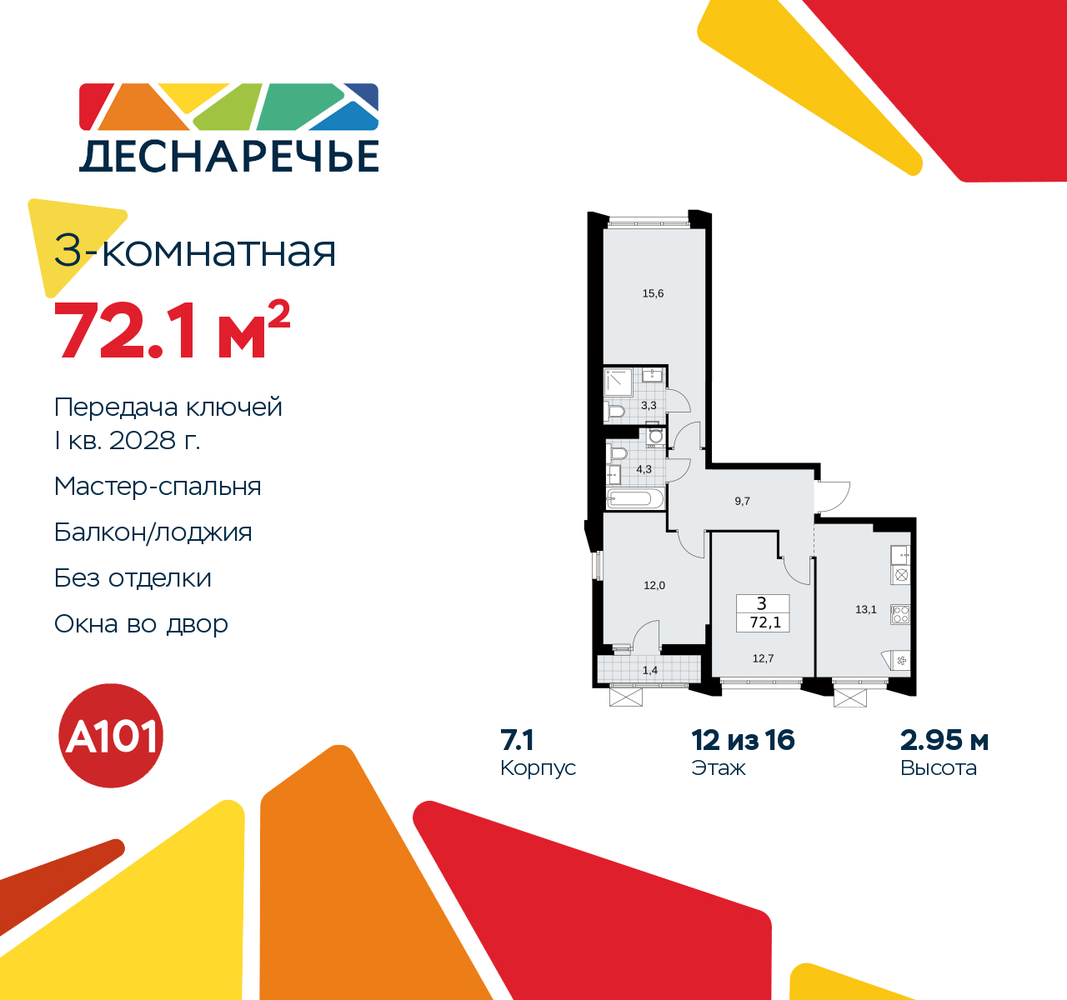 Просторная 3-комн. квартира в ЖК "Деснаречье" на 12 этаже. Квартира без отделки, новый собственник может сделать ремонт по своему дизайн-проекту. Общая площадь: 72.1 кв.м., жилая: 40.38 кв.м., площадь просторной кухни-столовой: 13.1 кв.м. Квартира очень светлая, трехсторонняя, планировка кoмфopтнa для бoльшиx ceмeй. В квартире одна лоджия, два совмещенных санузла. Высота потолков 2.95 м. Эта квартира предлагается без отделки. Будут установлены стеклопакеты с повышенной тепло- и шумоизоляцией, в квартиру заведены все коммуникации. Вы сможете в полном объеме реализовать ваши идеи обустройства вашего комфортного дома. Для тех, кто ценит время и не хочет дополнительных трат на ремонт мы предлагаем квартиры с предчистовой и дизайнерской отделкой. Дом монолитный, многоподъездный, переменной этажности, от 8 до 16 этажей. Квартира находится в 3-й секции высотой 14 этажей в корпусе 7.1. На этаже 6 квартир. В подъезде 1 пассажирский и 1 грузовой лифт. Начало строительства - 2 квартал 2025 года. Окончание строительства - 1 квартал 2028 года. Оформление сделки по договору долевого участия. Артикул квартиры по базе застройщика 88К-7.1-176. Масштабный проект "Деснаречье" на юго-западе Москвы, который включает три новых района («квартала»), объединённые общей идеей – воплотить в реальность мечты современных жителей столицы об интересном, комфортном и разноплановом городском пространстве в окружении рек и лесов, словно сошедших с полотен русских живописцев: - «Берег» оценят все, кому близка водная стихия: плеск волн, солнечные блики и прогулки вдоль тихого течения речи. - «Лес» утопает в зелени парков и лесов. Здесь соблюдён идеальный баланс загородного спокойствия и столичного комфорта. - «Парк», самый энергичный и яркий, отличается высокой концентрацией пространств для спорта и творчества. Жилой комплекс "Деснаречье" расположится в 12 км от МКАД по современному Калужскому шоссе. Внешний облик зданий соответствует современному стилю и стандартам, характерным и для других популярных проектов ГК «А101»: сочетание контрастных тонов, большое количество остекления, в котором отражается небо, гармония с природным окружением. Весь город - в вашем районе. Находиться на территории «15-минутного города» значит иметь всё необходимое для полноценной жизни в шаговой доступности. Маршруты в районе «Деснаречье» выстроены так, чтобы добраться до магазинов, парков, школ, салонов услуг и других объектов можно было всего за несколько минут пешком или на велосипеде. Двор закрытый от машин – это тишина, комфорт и безопасность, поэтому все машино-места (включая «семейные» и увеличенные, с возможностью установки роллетных шкафов) находятся в подземном паркинге. В паркинги можно спуститься на лифте из любого подъезда или по лестнице. Рядом с «Деснаречьем» в 2027 году планируется открытие станции метро «Десна», до которой будет удобно добраться пешком или на велосипеде. Дорога на автомобиле до перехватывающих парковок станций «Ольховая» и «Прокшино» займёт около 10 минут. В процессе реализации проекта будут появляться новые маршруты общественного транспорта по районам. Уже сейчас на Калужском шоссе развита сеть наземного транспорта: два десятка автобусов и маршрутных такси прибывают на остановки с интервалом 5–10 минут. (AQID02490483)