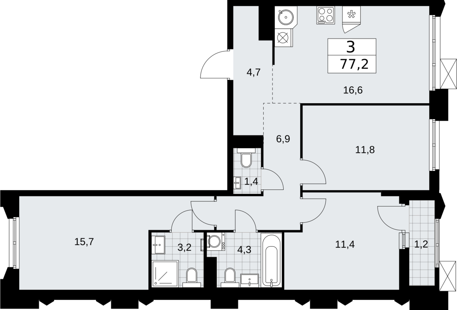 3-комн. квартира в ЖК "Деснаречье" на 11 этаже. Квартира без отделки, полностью готова к ремонту. Общая площадь: 77.2 кв.м., жилая: 38.9 кв.м., площадь просторной кухни-столовой: 16.6 кв.м. Квартира - распашонка, без проходных комнат, окна выходят на paзные стороны дома. В квартире одна лоджия, два совмещенных санузла. Высота потолков 2.95 м. Дом монолитный, многоподъездный, переменной этажности, от 8 до 16 этажей. Квартира находится в 3-й секции высотой 14 этажей в корпусе 7.1. На этаже 6 квартир. В подъезде 1 пассажирский и 1 грузовой лифт. Начало строительства - 2 квартал 2025 года. Окончание строительства - 1 квартал 2028 года. Оформление сделки по договору долевого участия. Масштабный проект "Деснаречье" на юго-западе Москвы, который включает три новых района («квартала»), объединённые общей идеей – воплотить в реальность мечты современных жителей столицы об интересном, комфортном и разноплановом городском пространстве в окружении рек и лесов, словно сошедших с полотен русских живописцев: - «Берег» оценят все, кому близка водная стихия: плеск волн, солнечные блики и прогулки вдоль тихого течения речи. - «Лес» утопает в зелени парков и лесов. Здесь соблюдён идеальный баланс загородного спокойствия и столичного комфорта. - «Парк», самый энергичный и яркий, отличается высокой концентрацией пространств для спорта и творчества. Жилой комплекс "Деснаречье" расположится в 12 км от МКАД по современному Калужскому шоссе. Внешний облик зданий соответствует современному стилю и стандартам, характерным и для других популярных проектов ГК «А101»: сочетание контрастных тонов, большое количество остекления, в котором отражается небо, гармония с природным окружением. Весь город - в вашем районе. Находиться на территории «15-минутного города» значит иметь всё необходимое для полноценной жизни в шаговой доступности. Маршруты в районе «Деснаречье» выстроены так, чтобы добраться до магазинов, парков, школ, салонов услуг и других объектов можно было всего за несколько минут пешком или на велосипеде. Двор закрытый от машин – это тишина, комфорт и безопасность, поэтому все машино-места (включая «семейные» и увеличенные, с возможностью установки роллетных шкафов) находятся в подземном паркинге. В паркинги можно спуститься на лифте из любого подъезда или по лестнице. Рядом с «Деснаречьем» в 2027 году планируется открытие станции метро «Десна», до которой будет удобно добраться пешком или на велосипеде. Дорога на автомобиле до перехватывающих парковок станций «Ольховая» и «Прокшино» займёт около 10 минут. В процессе реализации проекта будут появляться новые маршруты общественного транспорта по районам. Уже сейчас на Калужском шоссе развита сеть наземного транспорта: два десятка автобусов и маршрутных такси прибывают на остановки с интервалом 5–10 минут. (AQID02492179)