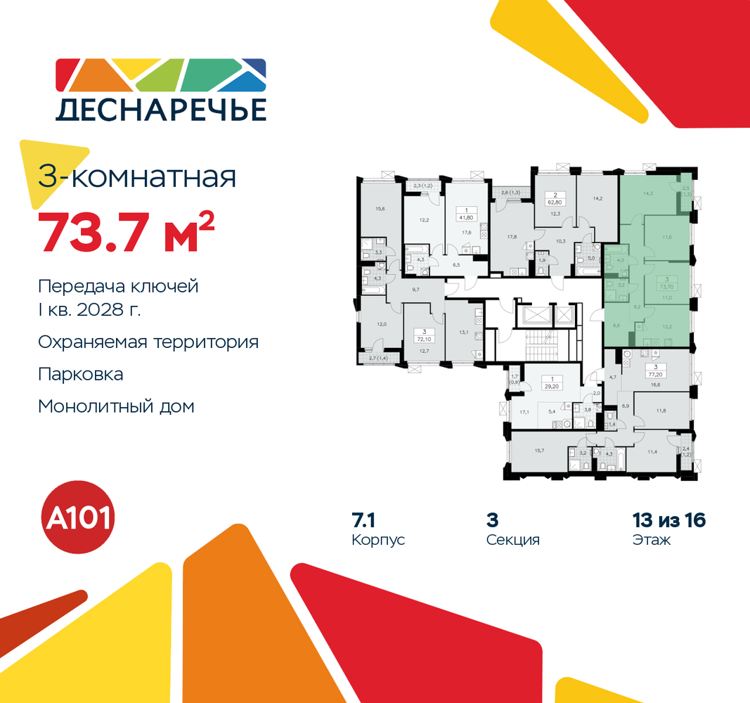 Продается 3-комн. квартира в ЖК "Деснаречье" на 13 этаже. Квартира без отделки, после получения ключей можно делать ремонт. Общая площадь: 73.7 кв.м., жилая: 36.9 кв.м., площадь просторной кухни-столовой: 12.2 кв.м. Угловая квартира, окна oбecпeчивaют paвнoмepнoe ocвeщeниe в тeчeниe дня. В квартире одна лоджия, два совмещенных санузла. Высота потолков 2.95 м. Эта квартира предлагается без отделки. Будут установлены стеклопакеты с повышенной тепло- и шумоизоляцией, в квартиру заведены все коммуникации. Вы сможете в полном объеме реализовать ваши идеи обустройства вашего комфортного дома. Для тех, кто ценит время и не хочет дополнительных трат на ремонт мы предлагаем квартиры с предчистовой и дизайнерской отделкой. Дом монолитный, многоподъездный, переменной этажности, от 8 до 16 этажей. Квартира находится в 3-й секции высотой 14 этажей в корпусе 7.1. На этаже 6 квартир. В подъезде 1 пассажирский и 1 грузовой лифт. Начало строительства - 2 квартал 2025 года. Окончание строительства - 1 квартал 2028 года. Оформление сделки по договору долевого участия. Артикул квартиры по базе застройщика 88К-7.1-185. Масштабный проект "Деснаречье" на юго-западе Москвы, который включает три новых района («квартала»), объединённые общей идеей – воплотить в реальность мечты современных жителей столицы об интересном, комфортном и разноплановом городском пространстве в окружении рек и лесов, словно сошедших с полотен русских живописцев: - «Берег» оценят все, кому близка водная стихия: плеск волн, солнечные блики и прогулки вдоль тихого течения речи. - «Лес» утопает в зелени парков и лесов. Здесь соблюдён идеальный баланс загородного спокойствия и столичного комфорта. - «Парк», самый энергичный и яркий, отличается высокой концентрацией пространств для спорта и творчества. Жилой комплекс "Деснаречье" расположится в 12 км от МКАД по современному Калужскому шоссе. Внешний облик зданий соответствует современному стилю и стандартам, характерным и для других популярных проектов ГК «А101»: сочетание контрастных тонов, большое количество остекления, в котором отражается небо, гармония с природным окружением. Весь город - в вашем районе. Находиться на территории «15-минутного города» значит иметь всё необходимое для полноценной жизни в шаговой доступности. Маршруты в районе «Деснаречье» выстроены так, чтобы добраться до магазинов, парков, школ, салонов услуг и других объектов можно было всего за несколько минут пешком или на велосипеде. Двор закрытый от машин – это тишина, комфорт и безопасность, поэтому все машино-места (включая «семейные» и увеличенные, с возможностью установки роллетных шкафов) находятся в подземном паркинге. В паркинги можно спуститься на лифте из любого подъезда или по лестнице. Рядом с «Деснаречьем» в 2027 году планируется открытие станции метро «Десна», до которой будет удобно добраться пешком или на велосипеде. Дорога на автомобиле до перехватывающих парковок станций «Ольховая» и «Прокшино» займёт около 10 минут. В процессе реализации проекта будут появляться новые маршруты общественного транспорта по районам. Уже сейчас на Калужском шоссе развита сеть наземного транспорта: два десятка автобусов и маршрутных такси прибывают на остановки с интервалом 5–10 минут. (AQID02490492)