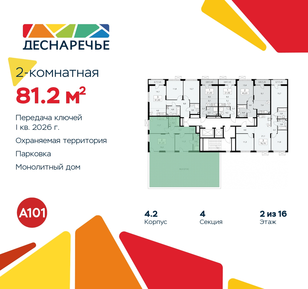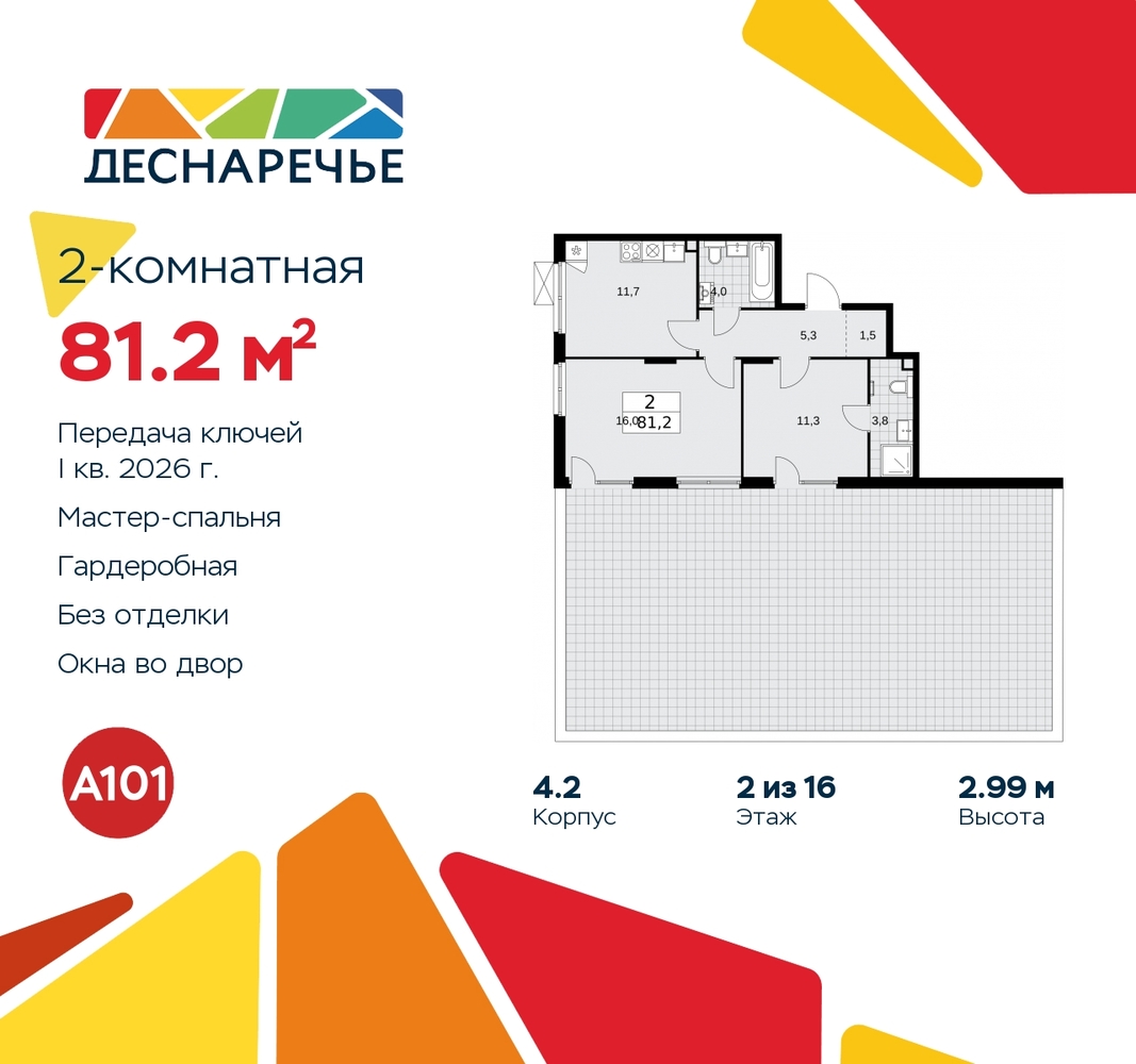 Продается двухкомнатная квартира в ЖК "Деснаречье" на 2 этаже. Квартира без отделки, новый владелец может сделать ремонт по своему проекту. Общая площадь: 81.2 кв.м., жилая: 27.3 кв.м., площадь просторной кухни-столовой: 11.7 кв.м. Угловая квартира, идеально подойдет любителям тишины и панорамных видов. В квартире один балкон, два совмещенных санузла. Наличие террасы в квартире открывает возможность для создания зон отдыха в кругу семьи и друзей. Высота потолков 2.99 м. Эта квартира предлагается без отделки. Будут установлены стеклопакеты с повышенной тепло- и шумоизоляцией, в квартиру заведены все коммуникации. Вы сможете в полном объеме реализовать ваши идеи обустройства вашего комфортного дома. Для тех, кто ценит время и не хочет дополнительных трат на ремонт мы предлагаем квартиры с предчистовой и дизайнерской отделкой. Имеется ниша под гардероб. Дом монолитный, многоподъездный, переменной этажности, от 7 до 16 этажей. Квартира находится в 1-й секции высотой 16 этажей в корпусе 4.2. На этаже 6 квартир. В подъезде 1 пассажирский и 1 грузовой лифт. Начало строительства - 3 квартал 2023 года. Окончание строительства - 1 квартал 2026 года. Оформление сделки по договору долевого участия. Артикул квартиры по базе застройщика 88К-4.2-267. Масштабный проект "Деснаречье" на юго-западе Москвы, который включает три новых района («квартала»), объединённые общей идеей – воплотить в реальность мечты современных жителей столицы об интересном, комфортном и разноплановом городском пространстве в окружении рек и лесов, словно сошедших с полотен русских живописцев: - «Берег» оценят все, кому близка водная стихия: плеск волн, солнечные блики и прогулки вдоль тихого течения речи. - «Лес» утопает в зелени парков и лесов. Здесь соблюдён идеальный баланс загородного спокойствия и столичного комфорта. - «Парк», самый энергичный и яркий, отличается высокой концентрацией пространств для спорта и творчества. Жилой комплекс "Деснаречье" расположится в 12 км от МКАД по современному Калужскому шоссе. Внешний облик зданий соответствует современному стилю и стандартам, характерным и для других популярных проектов ГК «А101»: сочетание контрастных тонов, большое количество остекления, в котором отражается небо, гармония с природным окружением. Весь город - в вашем районе. Находиться на территории «15-минутного города» значит иметь всё необходимое для полноценной жизни в шаговой доступности. Маршруты в районе «Деснаречье» выстроены так, чтобы добраться до магазинов, парков, школ, салонов услуг и других объектов можно было всего за несколько минут пешком или на велосипеде. Двор закрытый от машин – это тишина, комфорт и безопасность, поэтому все машино-места (включая «семейные» и увеличенные, с возможностью установки роллетных шкафов) находятся в подземном паркинге. В паркинги можно спуститься на лифте из любого подъезда или по лестнице. Рядом с «Деснаречьем» в 2027 году планируется открытие станции метро «Десна», до которой будет удобно добраться пешком или на велосипеде. Дорога на автомобиле до перехватывающих парковок станций «Ольховая» и «Прокшино» займёт около 10 минут. В процессе реализации проекта будут появляться новые маршруты общественного транспорта по районам. Уже сейчас на Калужском шоссе развита сеть наземного транспорта: два десятка автобусов и маршрутных такси прибыв