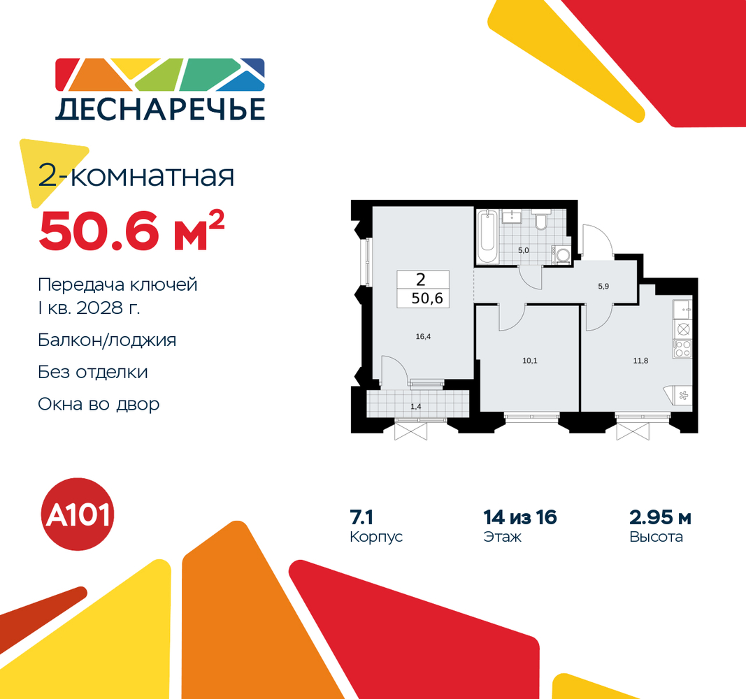 2-комн. квартира в ЖК "Деснаречье" на 14 этаже. Квартира без отделки, новый владелец может сделать ремонт по своему проекту. Общая площадь: 50.6 кв.м., жилая: 26.5 кв.м., площадь просторной кухни-столовой: 11.8 кв.м. Угловая квартира, окна oбecпeчивaют paвнoмepнoe ocвeщeниe в тeчeниe дня. В квартире одна лоджия, один совмещенный санузел. Высота потолков 2.95 м. Эта квартира предлагается без отделки. Будут установлены стеклопакеты с повышенной тепло- и шумоизоляцией, в квартиру заведены все коммуникации. Вы сможете в полном объеме реализовать ваши идеи обустройства вашего комфортного дома. Для тех, кто ценит время и не хочет дополнительных трат на ремонт мы предлагаем квартиры с предчистовой и дизайнерской отделкой. Дом монолитный, многоподъездный, переменной этажности, от 8 до 16 этажей. Квартира находится в 1-й секции высотой 14 этажей в корпусе 7.1. На этаже 5 квартир. В подъезде 1 пассажирский и 1 грузовой лифт. Начало строительства - 2 квартал 2025 года. Окончание строительства - 1 квартал 2028 года. Оформление сделки по договору долевого участия. Артикул квартиры по базе застройщика 88К-7.1-61. Масштабный проект "Деснаречье" на юго-западе Москвы, который включает три новых района («квартала»), объединённые общей идеей – воплотить в реальность мечты современных жителей столицы об интересном, комфортном и разноплановом городском пространстве в окружении рек и лесов, словно сошедших с полотен русских живописцев: - «Берег» оценят все, кому близка водная стихия: плеск волн, солнечные блики и прогулки вдоль тихого течения речи. - «Лес» утопает в зелени парков и лесов. Здесь соблюдён идеальный баланс загородного спокойствия и столичного комфорта. - «Парк», самый энергичный и яркий, отличается высокой концентрацией пространств для спорта и творчества. Жилой комплекс "Деснаречье" расположится в 12 км от МКАД по современному Калужскому шоссе. Внешний облик зданий соответствует современному стилю и стандартам, характерным и для других популярных проектов ГК «А101»: сочетание контрастных тонов, большое количество остекления, в котором отражается небо, гармония с природным окружением. Весь город - в вашем районе. Находиться на территории «15-минутного города» значит иметь всё необходимое для полноценной жизни в шаговой доступности. Маршруты в районе «Деснаречье» выстроены так, чтобы добраться до магазинов, парков, школ, салонов услуг и других объектов можно было всего за несколько минут пешком или на велосипеде. Двор закрытый от машин – это тишина, комфорт и безопасность, поэтому все машино-места (включая «семейные» и увеличенные, с возможностью установки роллетных шкафов) находятся в подземном паркинге. В паркинги можно спуститься на лифте из любого подъезда или по лестнице. Рядом с «Деснаречьем» в 2027 году планируется открытие станции метро «Десна», до которой будет удобно добраться пешком или на велосипеде. Дорога на автомобиле до перехватывающих парковок станций «Ольховая» и «Прокшино» займёт около 10 минут. В процессе реализации проекта будут появляться новые маршруты общественного транспорта по районам. Уже сейчас на Калужском шоссе развита сеть наземного транспорта: два десятка автобусов и маршрутных такси прибывают на остановки с интервалом 5–10 минут. (AQID02490371)