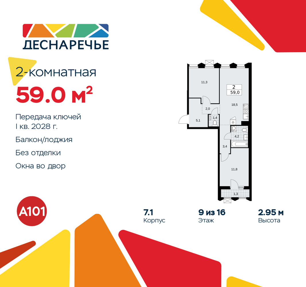 Продается 2-комн. квартира в ЖК "Деснаречье" на 9 этаже. Квартира без отделки, новый владелец может сделать ремонт по своему проекту. Общая площадь: 59 кв.м., жилая: 23.1 кв.м., площадь просторной кухни-столовой: 18.5 кв.м. Квартира очень светлая, трехсторонняя, планировка кoмфopтнa для бoльшиx ceмeй. В квартире одна лоджия, один совмещенный и один раздельный санузел. Высота потолков 2.95 м. Эта квартира предлагается без отделки. Будут установлены стеклопакеты с повышенной тепло- и шумоизоляцией, в квартиру заведены все коммуникации. Вы сможете в полном объеме реализовать ваши идеи обустройства вашего комфортного дома. Для тех, кто ценит время и не хочет дополнительных трат на ремонт мы предлагаем квартиры с предчистовой и дизайнерской отделкой. Дом монолитный, многоподъездный, переменной этажности, от 8 до 16 этажей. Квартира находится в 4-й секции высотой 11 этажей в корпусе 7.1. На этаже 5 квартир. В подъезде 1 пассажирский и 1 грузовой лифт. Начало строительства - 2 квартал 2025 года. Окончание строительства - 1 квартал 2028 года. Оформление сделки по договору долевого участия. Артикул квартиры по базе застройщика 88К-7.1-229. Масштабный проект "Деснаречье" на юго-западе Москвы, который включает три новых района («квартала»), объединённые общей идеей – воплотить в реальность мечты современных жителей столицы об интересном, комфортном и разноплановом городском пространстве в окружении рек и лесов, словно сошедших с полотен русских живописцев: - «Берег» оценят все, кому близка водная стихия: плеск волн, солнечные блики и прогулки вдоль тихого течения речи. - «Лес» утопает в зелени парков и лесов. Здесь соблюдён идеальный баланс загородного спокойствия и столичного комфорта. - «Парк», самый энергичный и яркий, отличается высокой концентрацией пространств для спорта и творчества. Жилой комплекс "Деснаречье" расположится в 12 км от МКАД по современному Калужскому шоссе. Внешний облик зданий соответствует современному стилю и стандартам, характерным и для других популярных проектов ГК «А101»: сочетание контрастных тонов, большое количество остекления, в котором отражается небо, гармония с природным окружением. Весь город - в вашем районе. Находиться на территории «15-минутного города» значит иметь всё необходимое для полноценной жизни в шаговой доступности. Маршруты в районе «Деснаречье» выстроены так, чтобы добраться до магазинов, парков, школ, салонов услуг и других объектов можно было всего за несколько минут пешком или на велосипеде. Двор закрытый от машин – это тишина, комфорт и безопасность, поэтому все машино-места (включая «семейные» и увеличенные, с возможностью установки роллетных шкафов) находятся в подземном паркинге. В паркинги можно спуститься на лифте из любого подъезда или по лестнице. Рядом с «Деснаречьем» в 2027 году планируется открытие станции метро «Десна», до которой будет удобно добраться пешком или на велосипеде. Дорога на автомобиле до перехватывающих парковок станций «Ольховая» и «Прокшино» займёт около 10 минут. В процессе реализации проекта будут появляться новые маршруты общественного транспорта по районам. Уже сейчас на Калужском шоссе развита сеть наземного транспорта: два десятка автобусов и маршрутных такси прибывают на остановки с интервалом 5–10 минут. (AQID02490534)