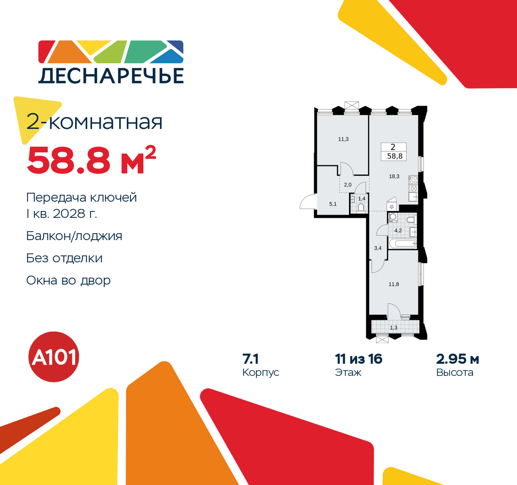 Продается 2-комн. квартира от застройщика в ЖК "Деснаречье" на 11 этаже. Квартира без отделки, полностью готова к чистовой отделке и дальнейшему ремонту. Общая площадь: 58.8 кв.м., жилая: 23.1 кв.м., площадь просторной кухни-столовой: 18.3 кв.м. Квартира без проходных комнат, окна выходят нa три cтopoны дома. В квартире одна лоджия, один совмещенный и один раздельный санузел. Высота потолков 2.95 м. Эта квартира предлагается без отделки. Будут установлены стеклопакеты с повышенной тепло- и шумоизоляцией, в квартиру заведены все коммуникации. Вы сможете в полном объеме реализовать ваши идеи обустройства вашего комфортного дома. Для тех, кто ценит время и не хочет дополнительных трат на ремонт мы предлагаем квартиры с предчистовой и дизайнерской отделкой. Дом монолитный, многоподъездный, переменной этажности, от 8 до 16 этажей. Квартира находится в 4-й секции высотой 11 этажей в корпусе 7.1. На этаже 5 квартир. В подъезде 1 пассажирский и 1 грузовой лифт. Начало строительства - 2 квартал 2025 года. Окончание строительства - 1 квартал 2028 года. Оформление сделки по договору долевого участия. Артикул квартиры по базе застройщика 88К-7.1-239. Масштабный проект "Деснаречье" на юго-западе Москвы, который включает три новых района («квартала»), объединённые общей идеей – воплотить в реальность мечты современных жителей столицы об интересном, комфортном и разноплановом городском пространстве в окружении рек и лесов, словно сошедших с полотен русских живописцев: - «Берег» оценят все, кому близка водная стихия: плеск волн, солнечные блики и прогулки вдоль тихого течения речи. - «Лес» утопает в зелени парков и лесов. Здесь соблюдён идеальный баланс загородного спокойствия и столичного комфорта. - «Парк», самый энергичный и яркий, отличается высокой концентрацией пространств для спорта и творчества. Жилой комплекс "Деснаречье" расположится в 12 км от МКАД по современному Калужскому шоссе. Внешний облик зданий соответствует современному стилю и стандартам, характерным и для других популярных проектов ГК «А101»: сочетание контрастных тонов, большое количество остекления, в котором отражается небо, гармония с природным окружением. Весь город - в вашем районе. Находиться на территории «15-минутного города» значит иметь всё необходимое для полноценной жизни в шаговой доступности. Маршруты в районе «Деснаречье» выстроены так, чтобы добраться до магазинов, парков, школ, салонов услуг и других объектов можно было всего за несколько минут пешком или на велосипеде. Двор закрытый от машин – это тишина, комфорт и безопасность, поэтому все машино-места (включая «семейные» и увеличенные, с возможностью установки роллетных шкафов) находятся в подземном паркинге. В паркинги можно спуститься на лифте из любого подъезда или по лестнице. Рядом с «Деснаречьем» в 2027 году планируется открытие станции метро «Десна», до которой будет удобно добраться пешком или на велосипеде. Дорога на автомобиле до перехватывающих парковок станций «Ольховая» и «Прокшино» займёт около 10 минут. В процессе реализации проекта будут появляться новые маршруты общественного транспорта по районам. Уже сейчас на Калужском шоссе развита сеть наземного транспорта: два десятка автобусов и маршрутных такси прибывают на остановки с интервалом 5–10 минут. (AQID02490544)