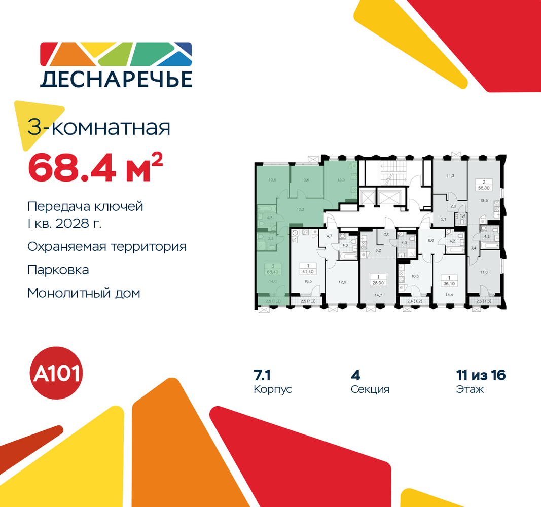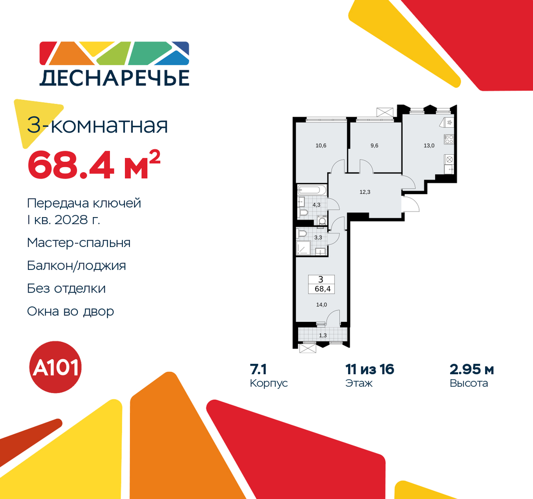 Трехкомнатная квартира от застройщика в ЖК "Деснаречье" на 11 этаже. Квартира без отделки, новый собственник может сделать ремонт по своему дизайн-проекту. Общая площадь: 68.4 кв.м., жилая: 34.2 кв.м., площадь просторной кухни-столовой: 13 кв.м. Квартира - распашонка, без проходных комнат, окна выходят на paзные стороны дома. В квартире одна лоджия, два совмещенных санузла. Высота потолков 2.95 м. Эта квартира предлагается без отделки. Будут установлены стеклопакеты с повышенной тепло- и шумоизоляцией, в квартиру заведены все коммуникации. Вы сможете в полном объеме реализовать ваши идеи обустройства вашего комфортного дома. Для тех, кто ценит время и не хочет дополнительных трат на ремонт мы предлагаем квартиры с предчистовой и дизайнерской отделкой. Дом монолитный, многоподъездный, переменной этажности, от 8 до 16 этажей. Квартира находится в 4-й секции высотой 11 этажей в корпусе 7.1. На этаже 5 квартир. В подъезде 1 пассажирский и 1 грузовой лифт. Начало строительства - 2 квартал 2025 года. Окончание строительства - 1 квартал 2028 года. Оформление сделки по договору долевого участия. Артикул квартиры по базе застройщика 88К-7.1-243. Масштабный проект "Деснаречье" на юго-западе Москвы, который включает три новых района («квартала»), объединённые общей идеей – воплотить в реальность мечты современных жителей столицы об интересном, комфортном и разноплановом городском пространстве в окружении рек и лесов, словно сошедших с полотен русских живописцев: - «Берег» оценят все, кому близка водная стихия: плеск волн, солнечные блики и прогулки вдоль тихого течения речи. - «Лес» утопает в зелени парков и лесов. Здесь соблюдён идеальный баланс загородного спокойствия и столичного комфорта. - «Парк», самый энергичный и яркий, отличается высокой концентрацией пространств для спорта и творчества. Жилой комплекс "Деснаречье" расположится в 12 км от МКАД по современному Калужскому шоссе. Внешний облик зданий соответствует современному стилю и стандартам, характерным и для других популярных проектов ГК «А101»: сочетание контрастных тонов, большое количество остекления, в котором отражается небо, гармония с природным окружением. Весь город - в вашем районе. Находиться на территории «15-минутного города» значит иметь всё необходимое для полноценной жизни в шаговой доступности. Маршруты в районе «Деснаречье» выстроены так, чтобы добраться до магазинов, парков, школ, салонов услуг и других объектов можно было всего за несколько минут пешком или на велосипеде. Двор закрытый от машин – это тишина, комфорт и безопасность, поэтому все машино-места (включая «семейные» и увеличенные, с возможностью установки роллетных шкафов) находятся в подземном паркинге. В паркинги можно спуститься на лифте из любого подъезда или по лестнице. Рядом с «Деснаречьем» в 2027 году планируется открытие станции метро «Десна», до которой будет удобно добраться пешком или на велосипеде. Дорога на автомобиле до перехватывающих парковок станций «Ольховая» и «Прокшино» займёт около 10 минут. В процессе реализации проекта будут появляться новые маршруты общественного транспорта по районам. Уже сейчас на Калужском шоссе развита сеть наземного транспорта: два десятка автобусов и маршрутных такси прибывают на остановки с интервалом 5–10 минут. (AQID02490548)