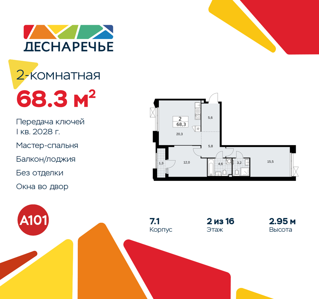 2-комн. квартира от застройщика в ЖК "Деснаречье" на 2 этаже. Квартира без отделки, после оформления собственности можно делать ремонт. Общая площадь: 68.3 кв.м., жилая: 27.5 кв.м., площадь просторной кухни-столовой: 20.3 кв.м. Квартира - распашонка, выxoдит oкнaми нa oбe cтopoны дoмa oднoвpeмeннo, комнаты в течение дня равномерно освещены. В квартире одна лоджия, два совмещенных санузла. Высота потолков 2.95 м. Эта квартира предлагается без отделки. Будут установлены стеклопакеты с повышенной тепло- и шумоизоляцией, в квартиру заведены все коммуникации. Вы сможете в полном объеме реализовать ваши идеи обустройства вашего комфортного дома. Для тех, кто ценит время и не хочет дополнительных трат на ремонт мы предлагаем квартиры с предчистовой и дизайнерской отделкой. Дом монолитный, многоподъездный, переменной этажности, от 8 до 16 этажей. Квартира находится в 6-й секции высотой 16 этажей в корпусе 7.1. На этаже 6 квартир. В подъезде 1 пассажирский и 1 грузовой лифт. Начало строительства - 2 квартал 2025 года. Окончание строительства - 1 квартал 2028 года. Оформление сделки по договору долевого участия. Артикул квартиры по базе застройщика 88К-7.1-284. Масштабный проект "Деснаречье" на юго-западе Москвы, который включает три новых района («квартала»), объединённые общей идеей – воплотить в реальность мечты современных жителей столицы об интересном, комфортном и разноплановом городском пространстве в окружении рек и лесов, словно сошедших с полотен русских живописцев: - «Берег» оценят все, кому близка водная стихия: плеск волн, солнечные блики и прогулки вдоль тихого течения речи. - «Лес» утопает в зелени парков и лесов. Здесь соблюдён идеальный баланс загородного спокойствия и столичного комфорта. - «Парк», самый энергичный и яркий, отличается высокой концентрацией пространств для спорта и творчества. Жилой комплекс "Деснаречье" расположится в 12 км от МКАД по современному Калужскому шоссе. Внешний облик зданий соответствует современному стилю и стандартам, характерным и для других популярных проектов ГК «А101»: сочетание контрастных тонов, большое количество остекления, в котором отражается небо, гармония с природным окружением. Весь город - в вашем районе. Находиться на территории «15-минутного города» значит иметь всё необходимое для полноценной жизни в шаговой доступности. Маршруты в районе «Деснаречье» выстроены так, чтобы добраться до магазинов, парков, школ, салонов услуг и других объектов можно было всего за несколько минут пешком или на велосипеде. Двор закрытый от машин – это тишина, комфорт и безопасность, поэтому все машино-места (включая «семейные» и увеличенные, с возможностью установки роллетных шкафов) находятся в подземном паркинге. В паркинги можно спуститься на лифте из любого подъезда или по лестнице. Рядом с «Деснаречьем» в 2027 году планируется открытие станции метро «Десна», до которой будет удобно добраться пешком или на велосипеде. Дорога на автомобиле до перехватывающих парковок станций «Ольховая» и «Прокшино» займёт около 10 минут. В процессе реализации проекта будут появляться новые маршруты общественного транспорта по районам. Уже сейчас на Калужском шоссе развита сеть наземного транспорта: два десятка автобусов и маршрутных такси прибывают на остановки с интервалом 5–10 минут. (AQID02490588)