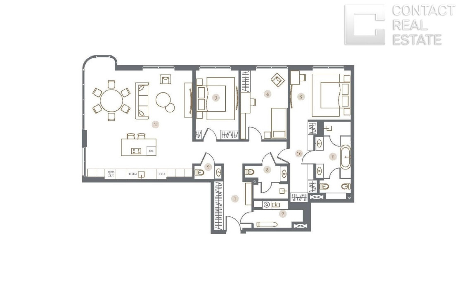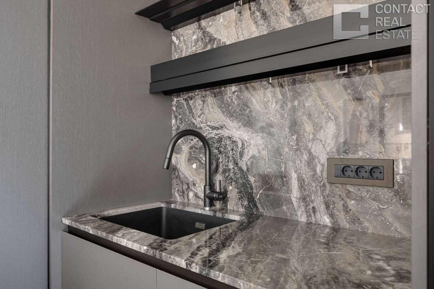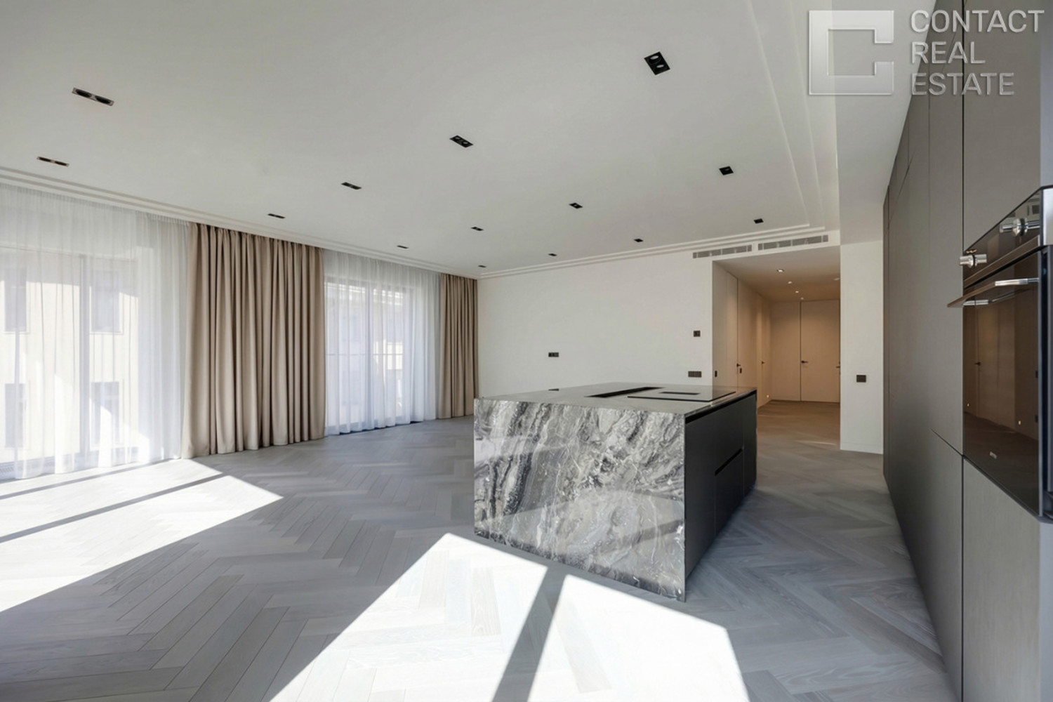 4-комнатная квартира площадью 148 м² с премиальной отделкой в элитном клубном доме Turgenev Планировка: кухня-столовая-гостиная, мастер-спальня со своим санузлом и гардеробной, ещё 2 спальни и 2 санузла, прихожуая с гардеробной. Дизайнерская отделка от нидерландского бюро Wolterinck. Пол из паркетной доски Austriawood, стены — итальянская краска PRATTA Exclusive, в санузлах — английская штукатурка Tadelakt и натуральный мрамор. Кухня — от итальянского бренда Cesar со встроенной техникой Smeg и поверхностями из эксклюзивного итальянского мрамора Arabescato Grigio Orobico. [Лот #24939]