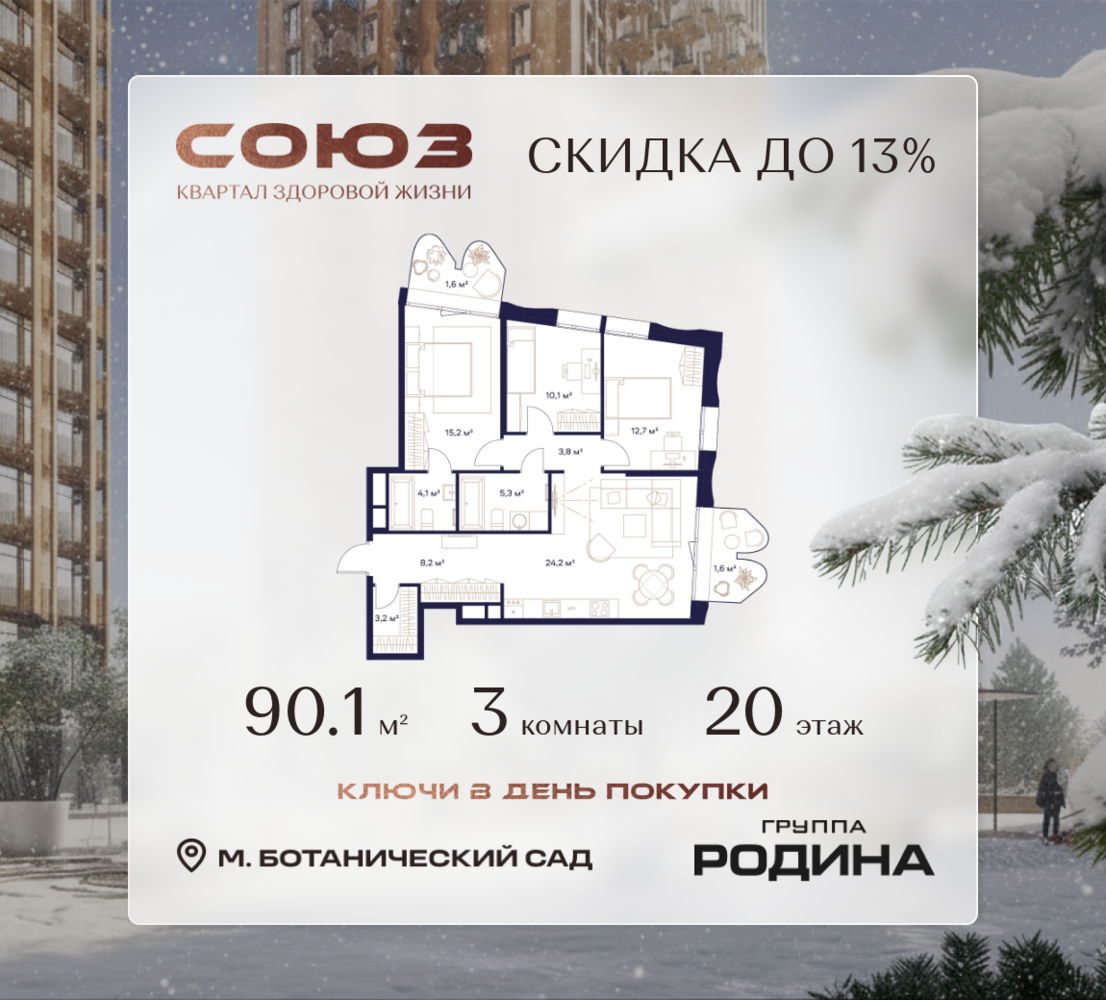 Готовые дома и ключи в день покупки <p> </p> Рассрочка 0% <p> </p> Продаётся 3-комнатная квартира площадью 90.1 м² на 20 этаже в Жилом Комплексе «Союз». <p> </p> Квартал здоровой жизни премиум-класса с рекордным количеством олимпийских видов спорта: <p> </p> - Ледовая арена для хоккея и фигурного катания, - Футбольные поля для тренировок, - Спортивный зал для фехтования, - Бассейн на 6 дорожек, - Центр единоборств, - 4 крытых площадки для настольного тенниса, - 7 теннисных кортов (крытых и открытых), - 4 крытых площадки для сквоша, - Легкоатлетический стадион, - Площадки для баскетбола и волейбола. <p> </p> <p> </p> Уникальные форматы квартир с мастер-спальнями, приватными террасами, балконами, а также пентхаусы с открыточными видами на город. <p> </p> Все квартиры продаются с отделкой Shell&Core и панорамным остеклением. <p> </p> <p> </p> Расположение <p> </p> Пешком: <p> </p> - 2 мин. до парка «Сад Будущего»; - 6 мин. до ст. м. «Ботанический сад»; - 6 мин. до ст. МЦК «Ботанический сад»; - 6 мин. до парка «Леоновская роща»; <p> </p> <p> </p> На автомобиле: <p> </p> - 2 мин. до СВХ (МСД); - 5 мин. до Проспекта Мира; - 10 мин. до ТТК; - 15 мин. до Садового кольца; - 25 мин. до аэропорта «Шереметьево». <p> </p> <p> </p> Благоустройство <p> </p> - собственная спортивная инфраструктура 7 Га; - зона для пикников; - игровые и спортивные площадки для детей всех возрастов; - розарий, а также сосновые, каштановые и дубовые аллеи; - площадки под открытым небом для занятий спортом и йоги; - игровые комнаты для детей; - лаунж-зона для резидентов; - просторная переговорная для деловых встреч; - премиальный ресторан «Шабада» Сосо Павлиашвили с водными арт-объектами на прогулочной аллее, садом ароматных трав и сценой под открытым небом; - кафе, химчистки, аптеки и супермаркеты рядом с домом. <p> </p> <p> </p> Окружение <p> </p> - 8 парков: Сад Будущего, Леоновская роща, Хуамин, Главный ботанический сад РАН, Шереметьевская дубрава, Останкино, парк спорта «Яуза», пойма реки Яуза и музей-усадьба «Останкино»; - 3 ВУЗа: ВГИК, РГСУ, МГПУ; - 12 школ, в том числе: школа 1499 им. И.А. Докукина (топ 100), Brookes Moscow, IThub школа; - 18 детских садов, в том числе билингвальный ALERTUM KIDS; - один из крупнейших океанариумов Европы «Москвариум»; - один из крупнейших в Европе торгово-развлекательных центров «Европолис».
