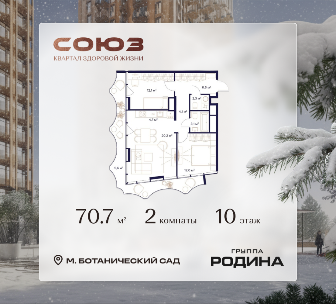 Рассрочка 0% <p> </p> Продаётся 2-комнатная квартира площадью 70.7 м² на 10 этаже в Жилом Комплексе «Союз». <p> </p> Квартал здоровой жизни премиум-класса с рекордным количеством олимпийских видов спорта: <p> </p> - Ледовая арена для хоккея и фигурного катания, - Футбольные поля для тренировок, - Спортивный зал для фехтования, - Бассейн на 6 дорожек, - Центр единоборств, - 4 крытых площадки для настольного тенниса, - 7 теннисных кортов (крытых и открытых), - 4 крытых площадки для сквоша, - Легкоатлетический стадион, - Площадки для баскетбола и волейбола. <p> </p> <p> </p> Уникальные форматы квартир с мастер-спальнями, приватными террасами, балконами, а также пентхаусы с открыточными видами на город. <p> </p> Все квартиры продаются с отделкой Shell&Core и панорамным остеклением. <p> </p> <p> </p> Расположение <p> </p> Пешком: <p> </p> - 2 мин. до парка «Сад Будущего»; - 6 мин. до ст. м. «Ботанический сад»; - 6 мин. до ст. МЦК «Ботанический сад»; - 6 мин. до парка «Леоновская роща»; <p> </p> <p> </p> На автомобиле: <p> </p> - 2 мин. до СВХ (МСД); - 5 мин. до Проспекта Мира; - 10 мин. до ТТК; - 15 мин. до Садового кольца; - 25 мин. до аэропорта «Шереметьево». <p> </p> <p> </p> Благоустройство <p> </p> - собственная спортивная инфраструктура 7 Га; - зона для пикников; - игровые и спортивные площадки для детей всех возрастов; - розарий, а также сосновые, каштановые и дубовые аллеи; - площадки под открытым небом для занятий спортом и йоги; - игровые комнаты для детей; - лаунж-зона для резидентов; - просторная переговорная для деловых встреч; - премиальный ресторан «Шабада» Сосо Павлиашвили с водными арт-объектами на прогулочной аллее, садом ароматных трав и сценой под открытым небом; - кафе, химчистки, аптеки и супермаркеты рядом с домом. <p> </p> <p> </p> Окружение <p> </p> - 8 парков: Сад Будущего, Леоновская роща, Хуамин, Главный ботанический сад РАН, Шереметьевская дубрава, Останкино, парк спорта «Яуза», пойма реки Яуза и музей-усадьба «Останкино»; - 3 ВУЗа: ВГИК, РГСУ, МГПУ; - 12 школ, в том числе: школа 1499 им. И.А. Докукина (топ 100), Brookes Moscow, IThub школа; - 18 детских садов, в том числе билингвальный ALERTUM KIDS; - один из крупнейших океанариумов Европы «Москвариум»; - один из крупнейших в Европе торгово-развлекательных центров «Европолис».
