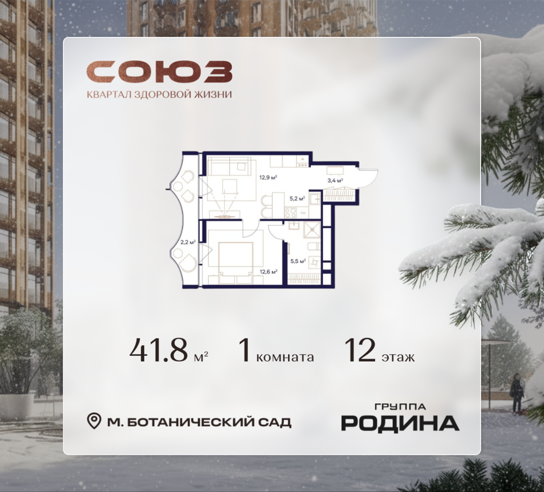 Рассрочка 0% <p> </p> Продаётся 1-комнатная квартира площадью 41.8 м² на 12 этаже в Жилом Комплексе «Союз». <p> </p> Квартал здоровой жизни премиум-класса с рекордным количеством олимпийских видов спорта: <p> </p> - Ледовая арена для хоккея и фигурного катания, - Футбольные поля для тренировок, - Спортивный зал для фехтования, - Бассейн на 6 дорожек, - Центр единоборств, - 4 крытых площадки для настольного тенниса, - 7 теннисных кортов (крытых и открытых), - 4 крытых площадки для сквоша, - Легкоатлетический стадион, - Площадки для баскетбола и волейбола. <p> </p> <p> </p> Уникальные форматы квартир с мастер-спальнями, приватными террасами, балконами, а также пентхаусы с открыточными видами на город. <p> </p> Все квартиры продаются с отделкой Shell&Core и панорамным остеклением. <p> </p> <p> </p> Расположение <p> </p> Пешком: <p> </p> - 2 мин. до парка «Сад Будущего»; - 6 мин. до ст. м. «Ботанический сад»; - 6 мин. до ст. МЦК «Ботанический сад»; - 6 мин. до парка «Леоновская роща»; <p> </p> <p> </p> На автомобиле: <p> </p> - 2 мин. до СВХ (МСД); - 5 мин. до Проспекта Мира; - 10 мин. до ТТК; - 15 мин. до Садового кольца; - 25 мин. до аэропорта «Шереметьево». <p> </p> <p> </p> Благоустройство <p> </p> - собственная спортивная инфраструктура 7 Га; - зона для пикников; - игровые и спортивные площадки для детей всех возрастов; - розарий, а также сосновые, каштановые и дубовые аллеи; - площадки под открытым небом для занятий спортом и йоги; - игровые комнаты для детей; - лаунж-зона для резидентов; - просторная переговорная для деловых встреч; - премиальный ресторан «Шабада» Сосо Павлиашвили с водными арт-объектами на прогулочной аллее, садом ароматных трав и сценой под открытым небом; - кафе, химчистки, аптеки и супермаркеты рядом с домом. <p> </p> <p> </p> Окружение <p> </p> - 8 парков: Сад Будущего, Леоновская роща, Хуамин, Главный ботанический сад РАН, Шереметьевская дубрава, Останкино, парк спорта «Яуза», пойма реки Яуза и музей-усадьба «Останкино»; - 3 ВУЗа: ВГИК, РГСУ, МГПУ; - 12 школ, в том числе: школа 1499 им. И.А. Докукина (топ 100), Brookes Moscow, IThub школа; - 18 детских садов, в том числе билингвальный ALERTUM KIDS; - один из крупнейших океанариумов Европы «Москвариум»; - один из крупнейших в Европе торгово-развлекательных центров «Европолис».