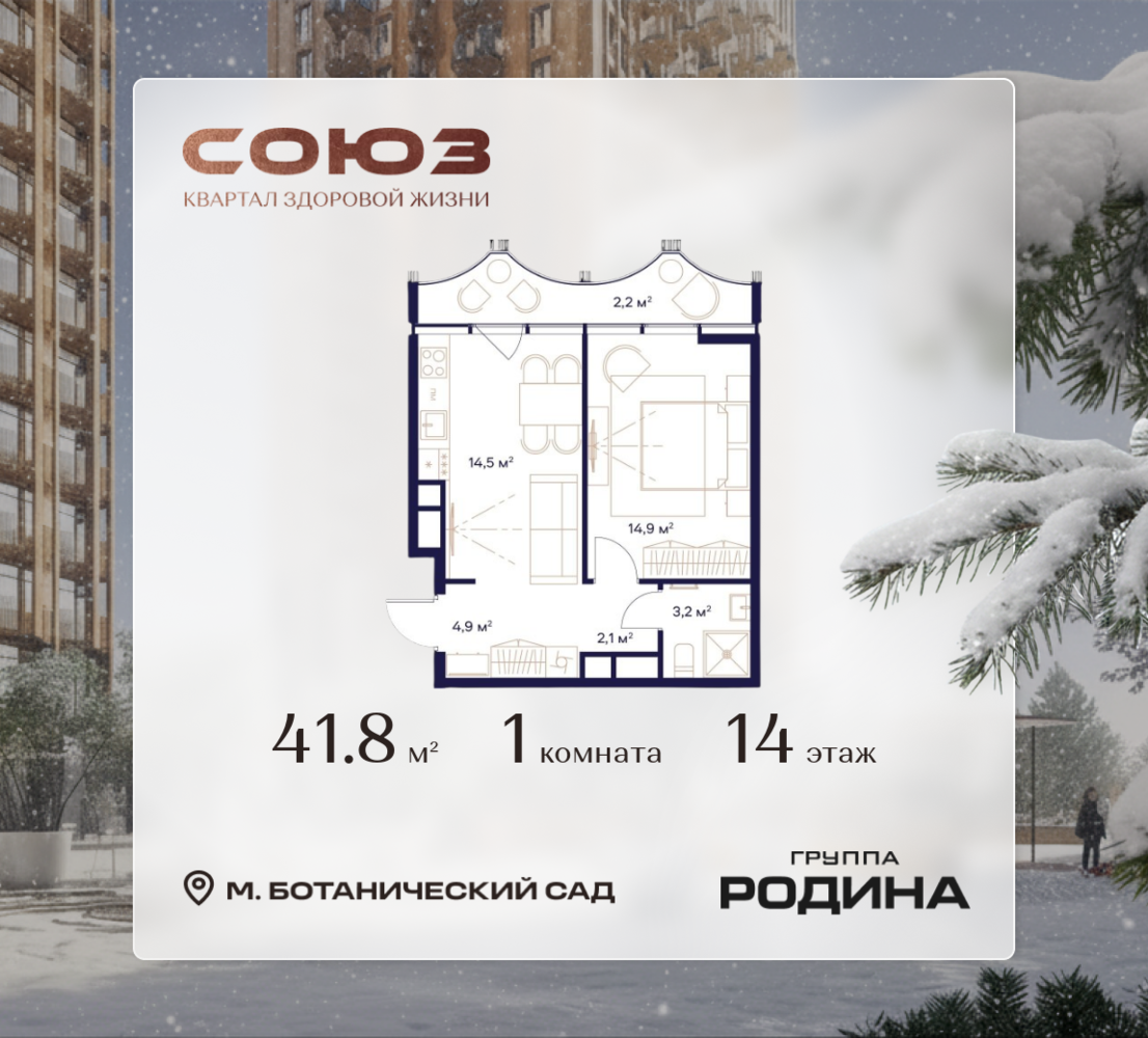Рассрочка 0% <p> </p> Продаётся 1-комнатная квартира площадью 41.8 м² на 14 этаже в Жилом Комплексе «Союз». <p> </p> Квартал здоровой жизни премиум-класса с рекордным количеством олимпийских видов спорта: <p> </p> - Ледовая арена для хоккея и фигурного катания, - Футбольные поля для тренировок, - Спортивный зал для фехтования, - Бассейн на 6 дорожек, - Центр единоборств, - 4 крытых площадки для настольного тенниса, - 7 теннисных кортов (крытых и открытых), - 4 крытых площадки для сквоша, - Легкоатлетический стадион, - Площадки для баскетбола и волейбола. <p> </p> <p> </p> Уникальные форматы квартир с мастер-спальнями, приватными террасами, балконами, а также пентхаусы с открыточными видами на город. <p> </p> Все квартиры продаются с отделкой Shell&Core и панорамным остеклением. <p> </p> <p> </p> Расположение <p> </p> Пешком: <p> </p> - 2 мин. до парка «Сад Будущего»; - 6 мин. до ст. м. «Ботанический сад»; - 6 мин. до ст. МЦК «Ботанический сад»; - 6 мин. до парка «Леоновская роща»; <p> </p> <p> </p> На автомобиле: <p> </p> - 2 мин. до СВХ (МСД); - 5 мин. до Проспекта Мира; - 10 мин. до ТТК; - 15 мин. до Садового кольца; - 25 мин. до аэропорта «Шереметьево». <p> </p> <p> </p> Благоустройство <p> </p> - собственная спортивная инфраструктура 7 Га; - зона для пикников; - игровые и спортивные площадки для детей всех возрастов; - розарий, а также сосновые, каштановые и дубовые аллеи; - площадки под открытым небом для занятий спортом и йоги; - игровые комнаты для детей; - лаунж-зона для резидентов; - просторная переговорная для деловых встреч; - премиальный ресторан «Шабада» Сосо Павлиашвили с водными арт-объектами на прогулочной аллее, садом ароматных трав и сценой под открытым небом; - кафе, химчистки, аптеки и супермаркеты рядом с домом. <p> </p> <p> </p> Окружение <p> </p> - 8 парков: Сад Будущего, Леоновская роща, Хуамин, Главный ботанический сад РАН, Шереметьевская дубрава, Останкино, парк спорта «Яуза», пойма реки Яуза и музей-усадьба «Останкино»; - 3 ВУЗа: ВГИК, РГСУ, МГПУ; - 12 школ, в том числе: школа 1499 им. И.А. Докукина (топ 100), Brookes Moscow, IThub школа; - 18 детских садов, в том числе билингвальный ALERTUM KIDS; - один из крупнейших океанариумов Европы «Москвариум»; - один из крупнейших в Европе торгово-развлекательных центров «Европолис».