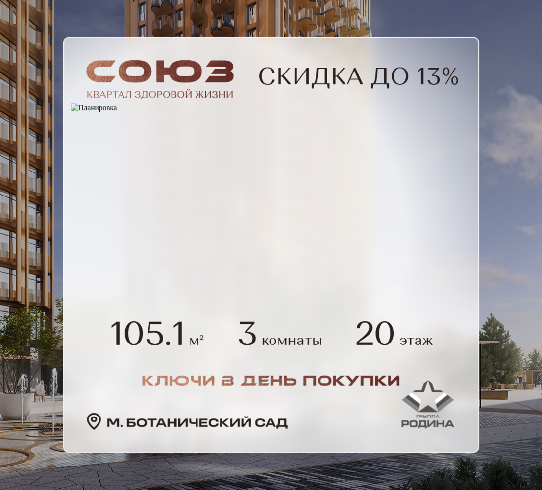 Готовые дома и ключи в день покупки <p> </p> Рассрочка 0% <p> </p> Продаётся 3-комнатная квартира площадью 105.1 м² на 20 этаже в Жилом Комплексе «Союз». <p> </p> Квартал здоровой жизни премиум-класса с рекордным количеством олимпийских видов спорта: <p> </p> - Ледовая арена для хоккея и фигурного катания, - Футбольные поля для тренировок, - Спортивный зал для фехтования, - Бассейн на 6 дорожек, - Центр единоборств, - 4 крытых площадки для настольного тенниса, - 7 теннисных кортов (крытых и открытых), - 4 крытых площадки для сквоша, - Легкоатлетический стадион, - Площадки для баскетбола и волейбола. <p> </p> <p> </p> Уникальные форматы квартир с мастер-спальнями, приватными террасами, балконами, а также пентхаусы с открыточными видами на город. <p> </p> Все квартиры продаются с отделкой Shell&Core и панорамным остеклением. <p> </p> <p> </p> Расположение <p> </p> Пешком: <p> </p> - 2 мин. до парка «Сад Будущего»; - 6 мин. до ст. м. «Ботанический сад»; - 6 мин. до ст. МЦК «Ботанический сад»; - 6 мин. до парка «Леоновская роща»; <p> </p> <p> </p> На автомобиле: <p> </p> - 2 мин. до СВХ (МСД); - 5 мин. до Проспекта Мира; - 10 мин. до ТТК; - 15 мин. до Садового кольца; - 25 мин. до аэропорта «Шереметьево». <p> </p> <p> </p> Благоустройство <p> </p> - собственная спортивная инфраструктура 7 Га; - зона для пикников; - игровые и спортивные площадки для детей всех возрастов; - розарий, а также сосновые, каштановые и дубовые аллеи; - площадки под открытым небом для занятий спортом и йоги; - игровые комнаты для детей; - лаунж-зона для резидентов; - просторная переговорная для деловых встреч; - премиальный ресторан «Шабада» Сосо Павлиашвили с водными арт-объектами на прогулочной аллее, садом ароматных трав и сценой под открытым небом; - кафе, химчистки, аптеки и супермаркеты рядом с домом. <p> </p> <p> </p> Окружение <p> </p> - 8 парков: Сад Будущего, Леоновская роща, Хуамин, Главный ботанический сад РАН, Шереметьевская дубрава, Останкино, парк спорта «Яуза», пойма реки Яуза и музей-усадьба «Останкино»; - 3 ВУЗа: ВГИК, РГСУ, МГПУ; - 12 школ, в том числе: школа 1499 им. И.А. Докукина (топ 100), Brookes Moscow, IThub школа; - 18 детских садов, в том числе билингвальный ALERTUM KIDS; - один из крупнейших океанариумов Европы «Москвариум»; - один из крупнейших в Европе торгово-развлекательных центров «Европолис».